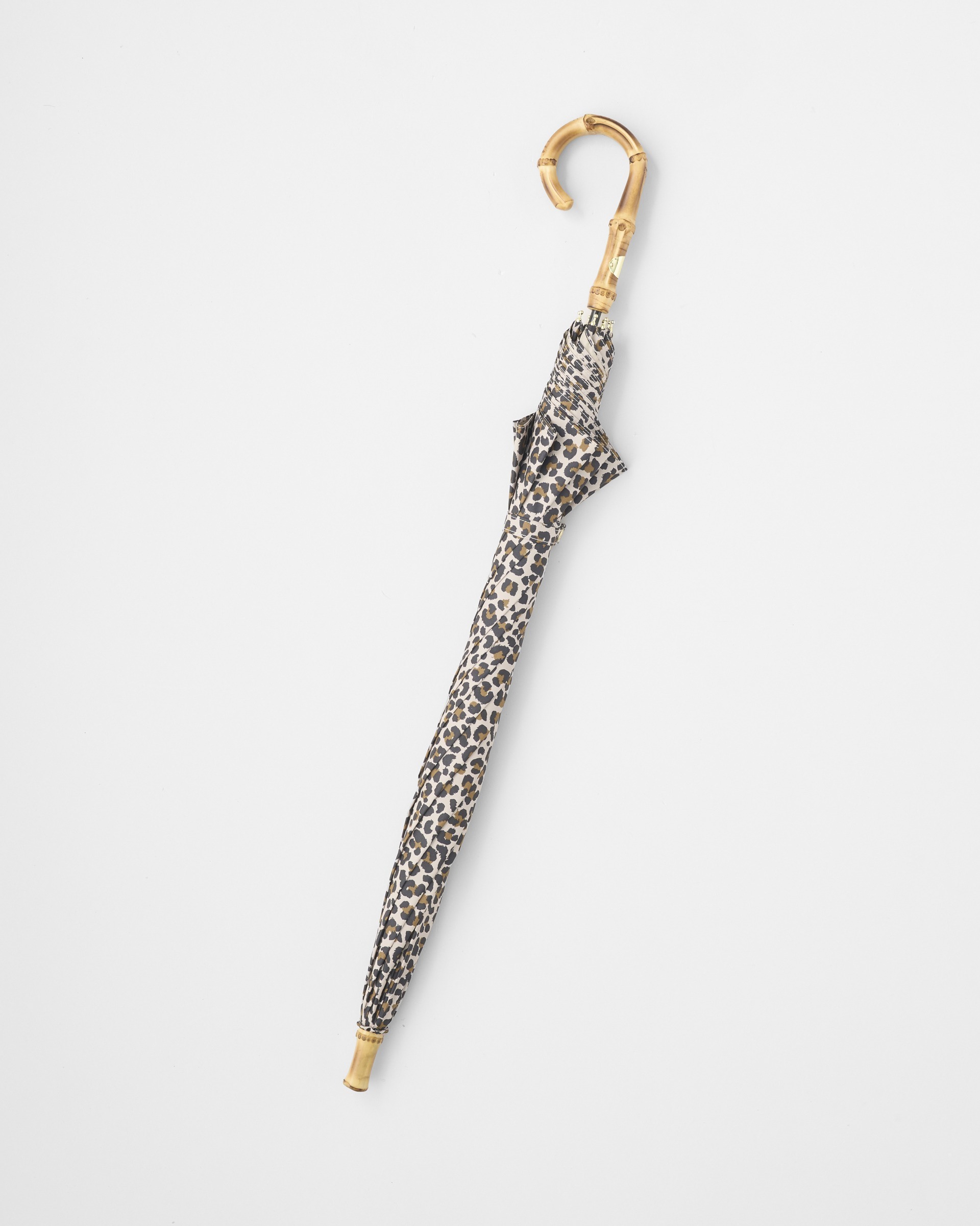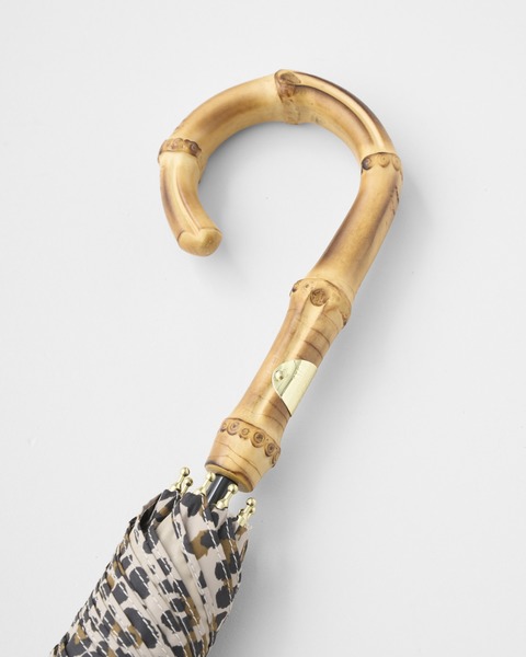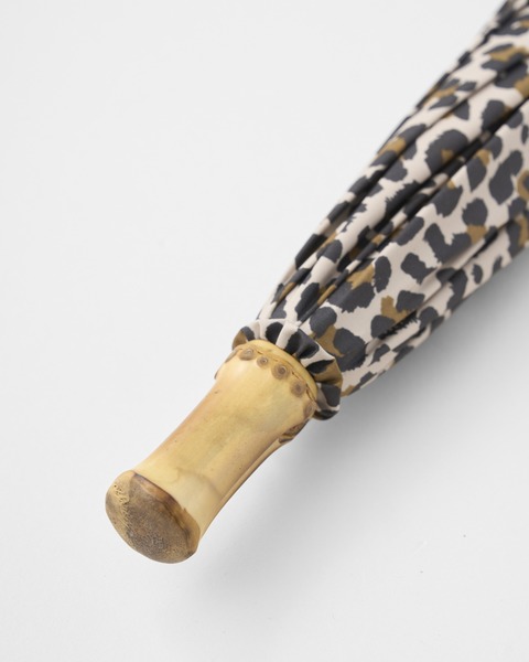 こちらの新モデルは、レオパード(表)×ベージュ(裏)の配色が魅力で、クラシカルな表情はそのままに、軽くて紫外線も防げる晴雨兼用の優れものです。親骨の長さは従来の「UMBRELLA BAMBOO」よりも6cm長いのに、重量は約80g軽量化されました。傘生地の表面に特殊な加工を施しているので、雨傘としてはもちろん、日傘としてもお使いいただけます。
