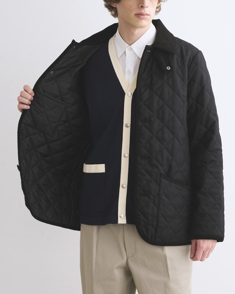 こちらの定番キルティング素材は、軽量で保温性にも優れています。表地部分は保温性の高いサキソニーウール素材。加えて裏地・中綿は再生ポリエステルを使用し、環境にも配慮した素材を使用しています。