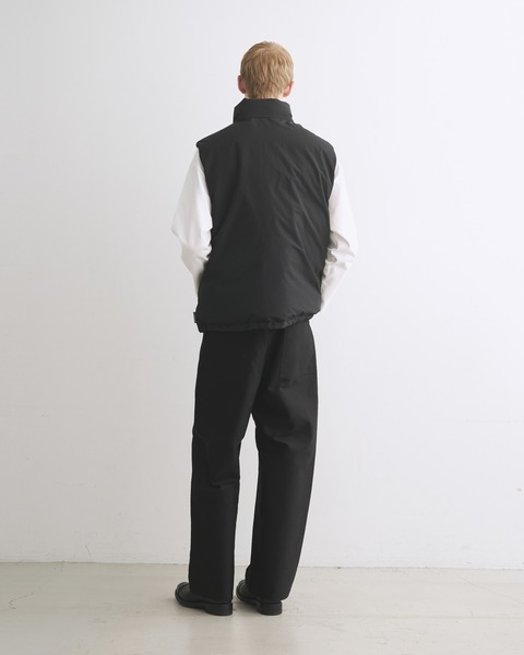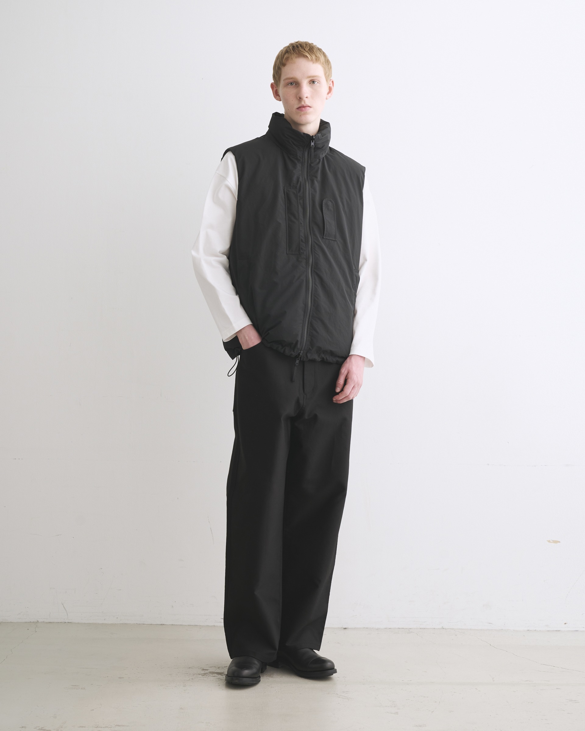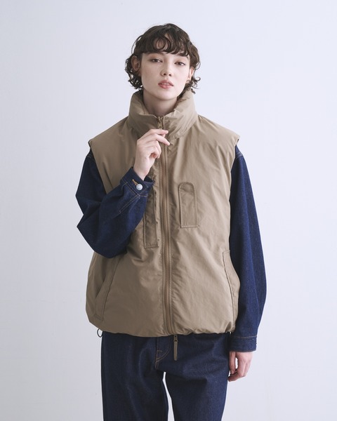 こちらのDOWN JACKET 002は、英国軍のPCSジャケットをベースにした横段の無いクリーンなデザインと、光沢のある高密度ポリエステル素材に横段のステッチを施したスポーティーなデザインの両面で着用できる優れもの。ポケットや胸元のベルトは、主張しすぎないミニマルなデザインで、着る人を選ばないダウンベストです。