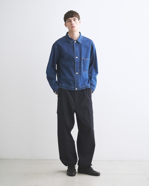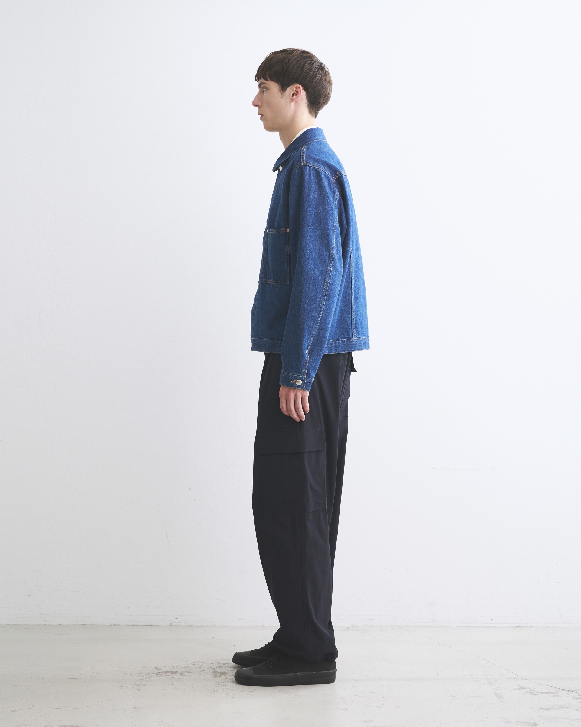 こちらのワークジャケット004Dは、すっきりとした身幅で、時代に左右されないスタンダードなシルエットが魅力。フロントのシルバーに輝く4つのタックボタンや、ミニマルなリベットで補強されたスクエアポケットを一つだけ配していることなど、無駄なディテールを排したデザインなので着る人を選びません。繊細なブリーチ加工を施したデニム素材は、程よいハリが特長で、立体的な美しいシルエットが際立ちます。