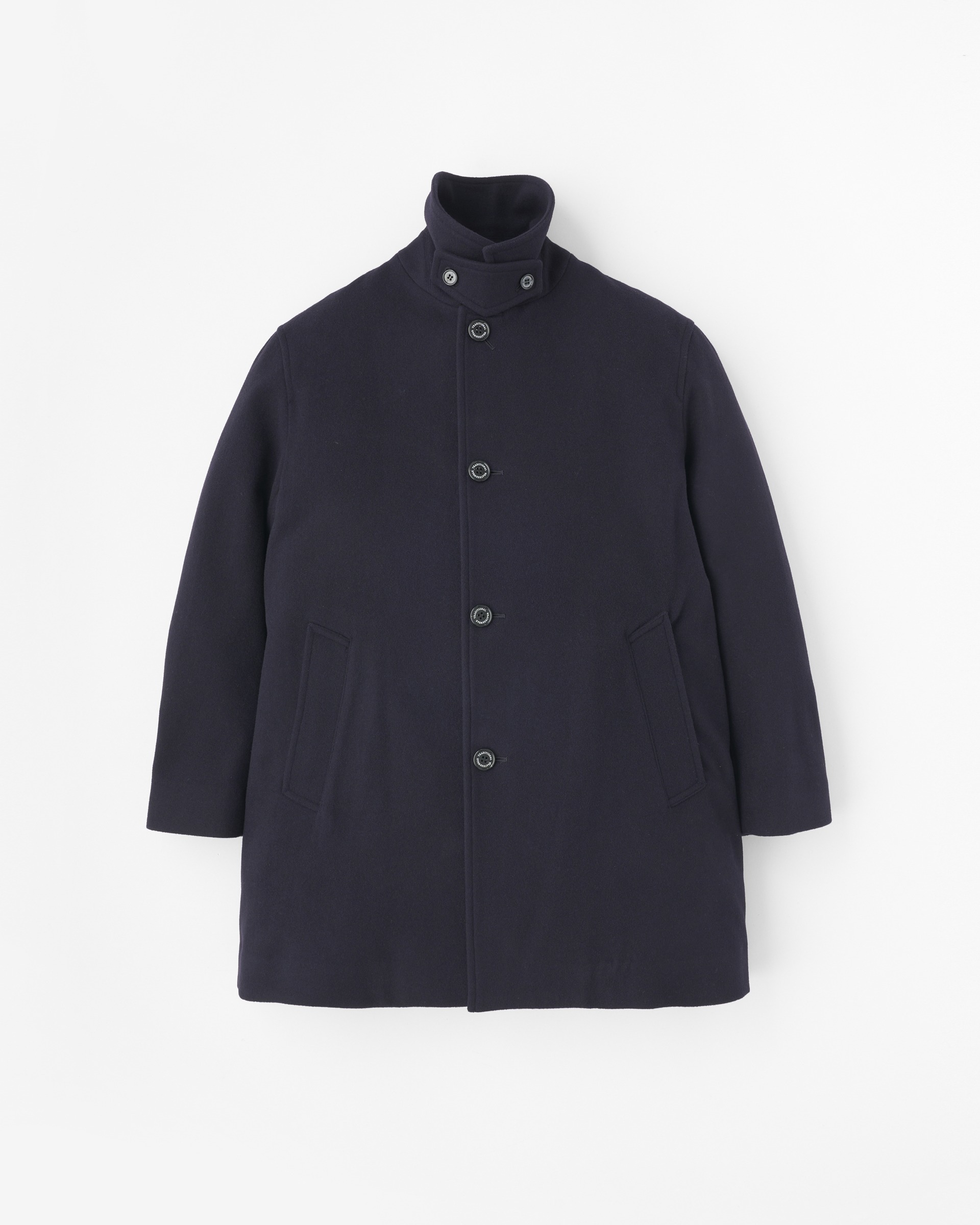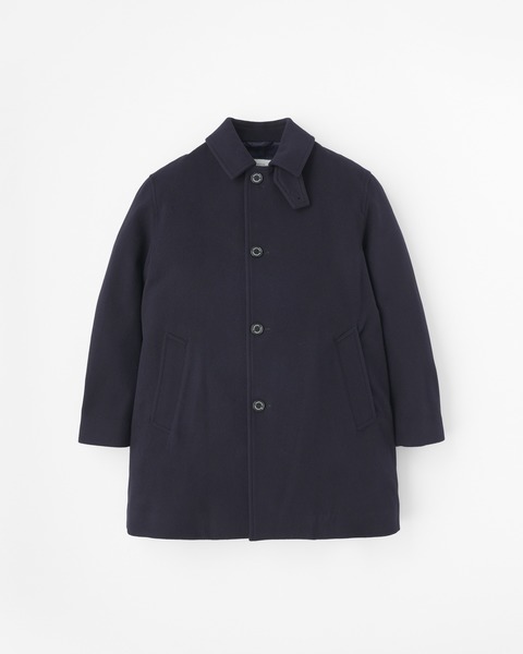 こちらのダービーボタンスルーは、ステンカラーコートのきちんと感がありながら、僅かにドロップしたショルダーラインと、程よくゆとりのある身幅が特長で、ドレス感のある装いから、カジュアルなデニムスタイルまで活躍する、着る人を選ばない万能コートです。襟を立ててチンタブで両襟を留めると、すっきりとした印象に変わります。程よいハリと膨らみが魅力のメルトン素材製なので、立体的なシルエットが際立ちます。
