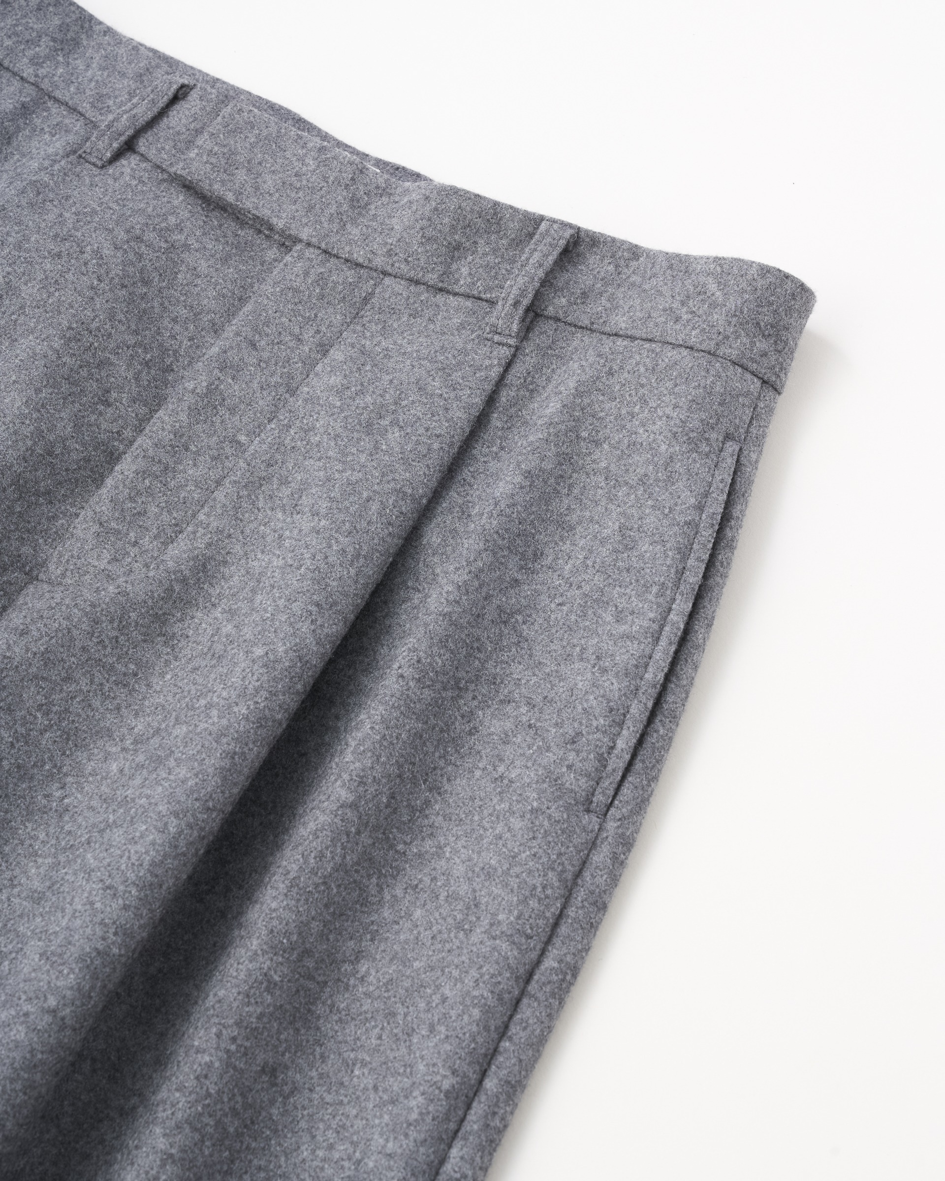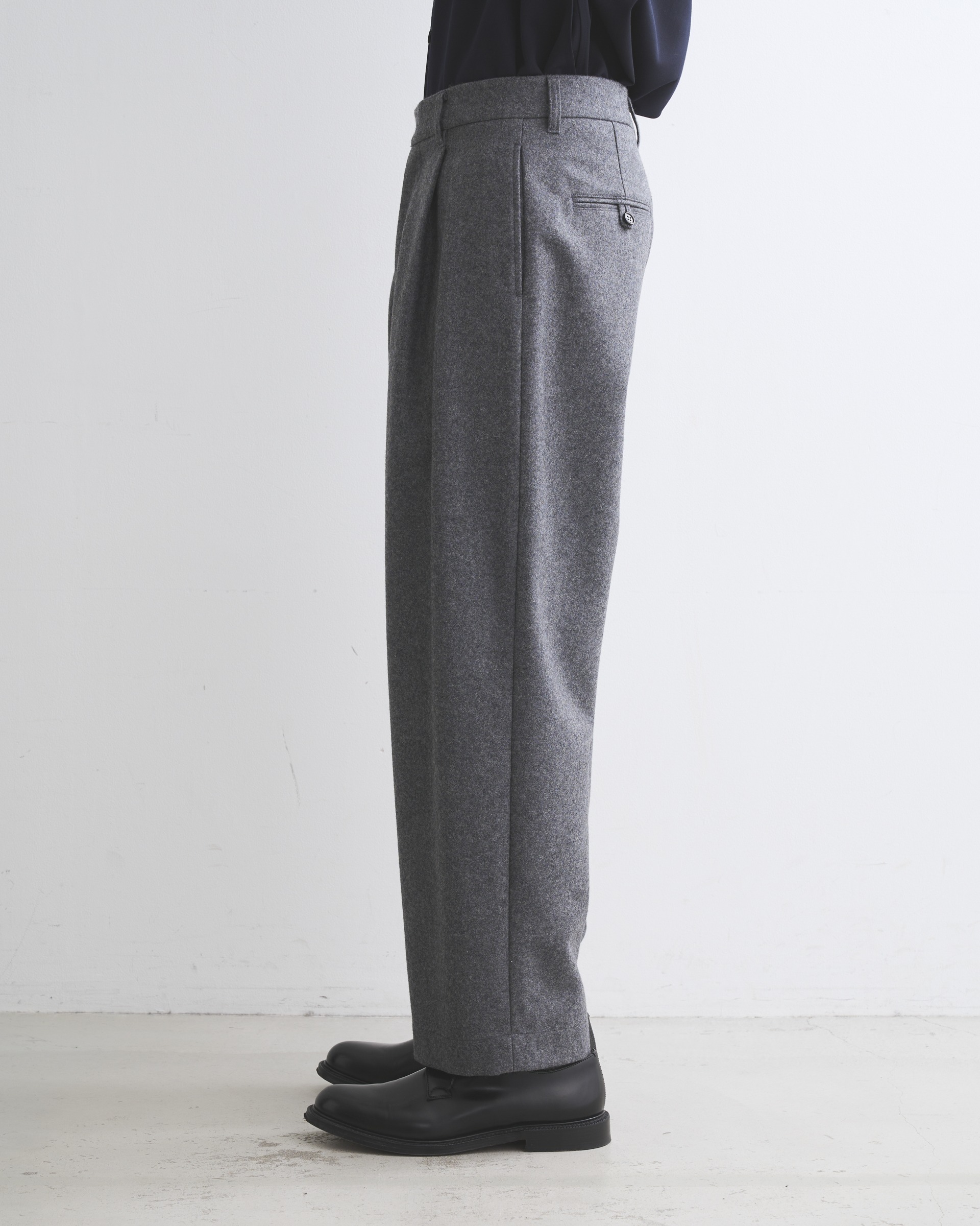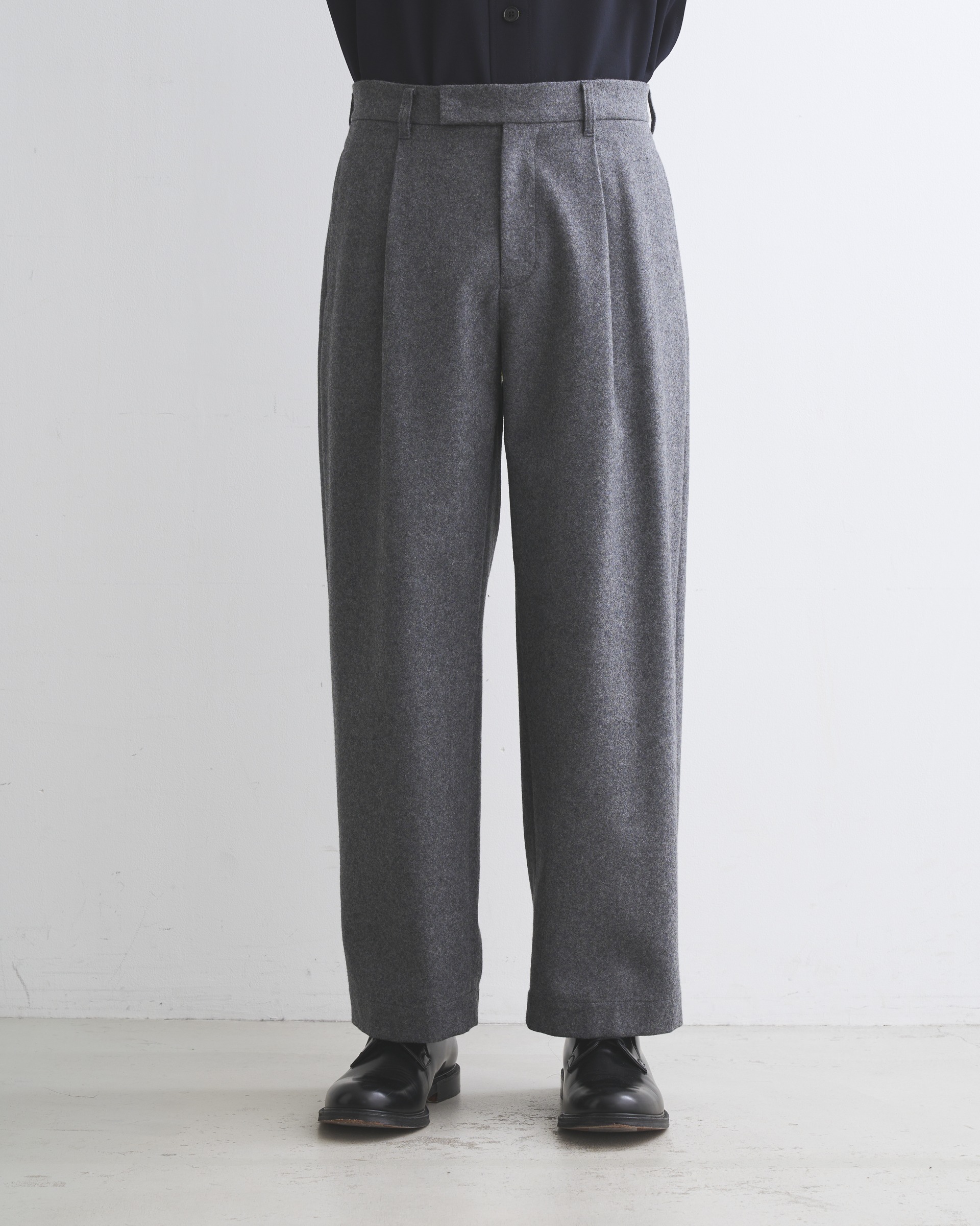 こちらの人気No.1のユニオンスラック102は、深いタックの入ったワイドパンツの103のタックの深さを半分(往復5cm)にすることで、パンツ幅を少し狭めたセミワイドパンツです。極太美脚パンツの代名詞"103"の唯一無二のシルエットを活かしながらも、緩やかなセミワイドにした汎用性の高いモデルです。フロントボタンが表に出ない6cmの持ち出しが付いている仕様なので、ベルトレスで着用した際のキマりが抜群です。バックは、クラシカルな両玉縁ポケットを左右に配置。上質なウールナイロンを高密度に織り上げたフランネル素材を使用しているので、クリーンな表情と立体的なシルエットが叶います。