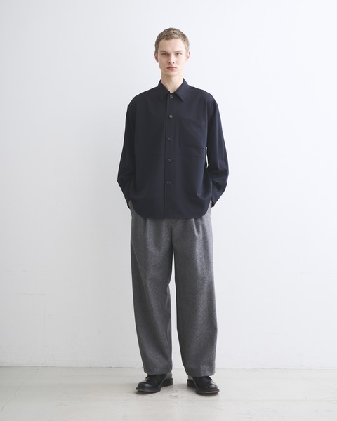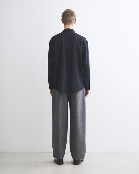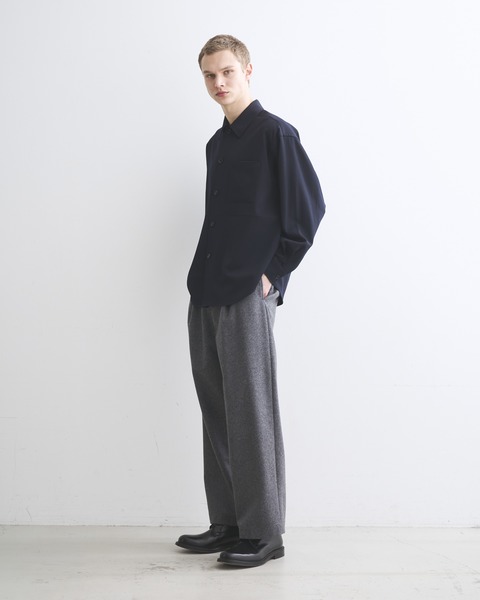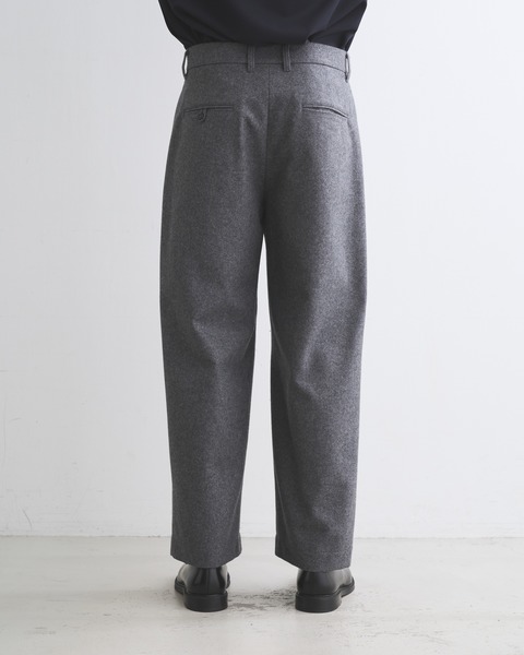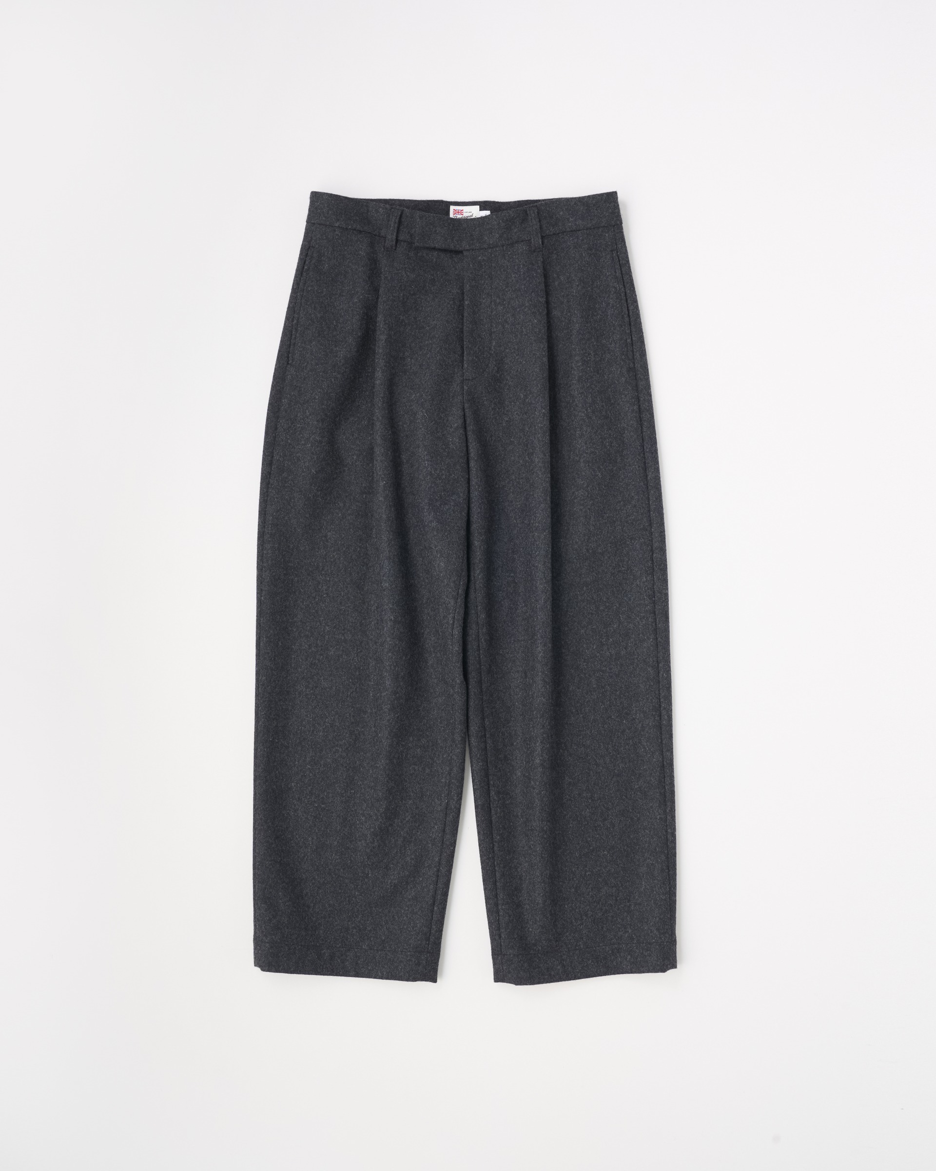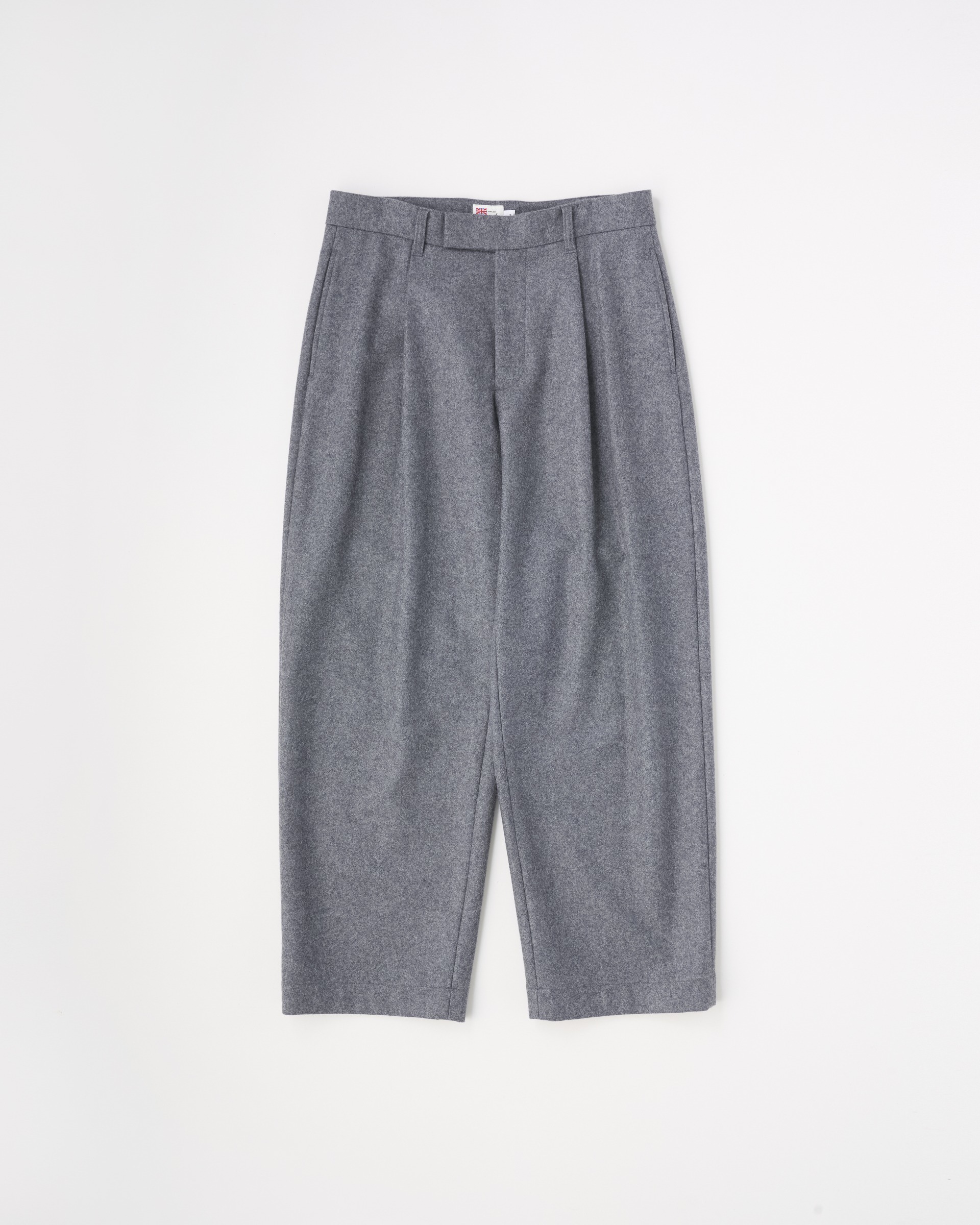 こちらの人気No.1のユニオンスラック102は、深いタックの入ったワイドパンツの103のタックの深さを半分(往復5cm)にすることで、パンツ幅を少し狭めたセミワイドパンツです。極太美脚パンツの代名詞"103"の唯一無二のシルエットを活かしながらも、緩やかなセミワイドにした汎用性の高いモデルです。フロントボタンが表に出ない6cmの持ち出しが付いている仕様なので、ベルトレスで着用した際のキマりが抜群です。バックは、クラシカルな両玉縁ポケットを左右に配置。上質なウールナイロンを高密度に織り上げたフランネル素材を使用しているので、クリーンな表情と立体的なシルエットが叶います。