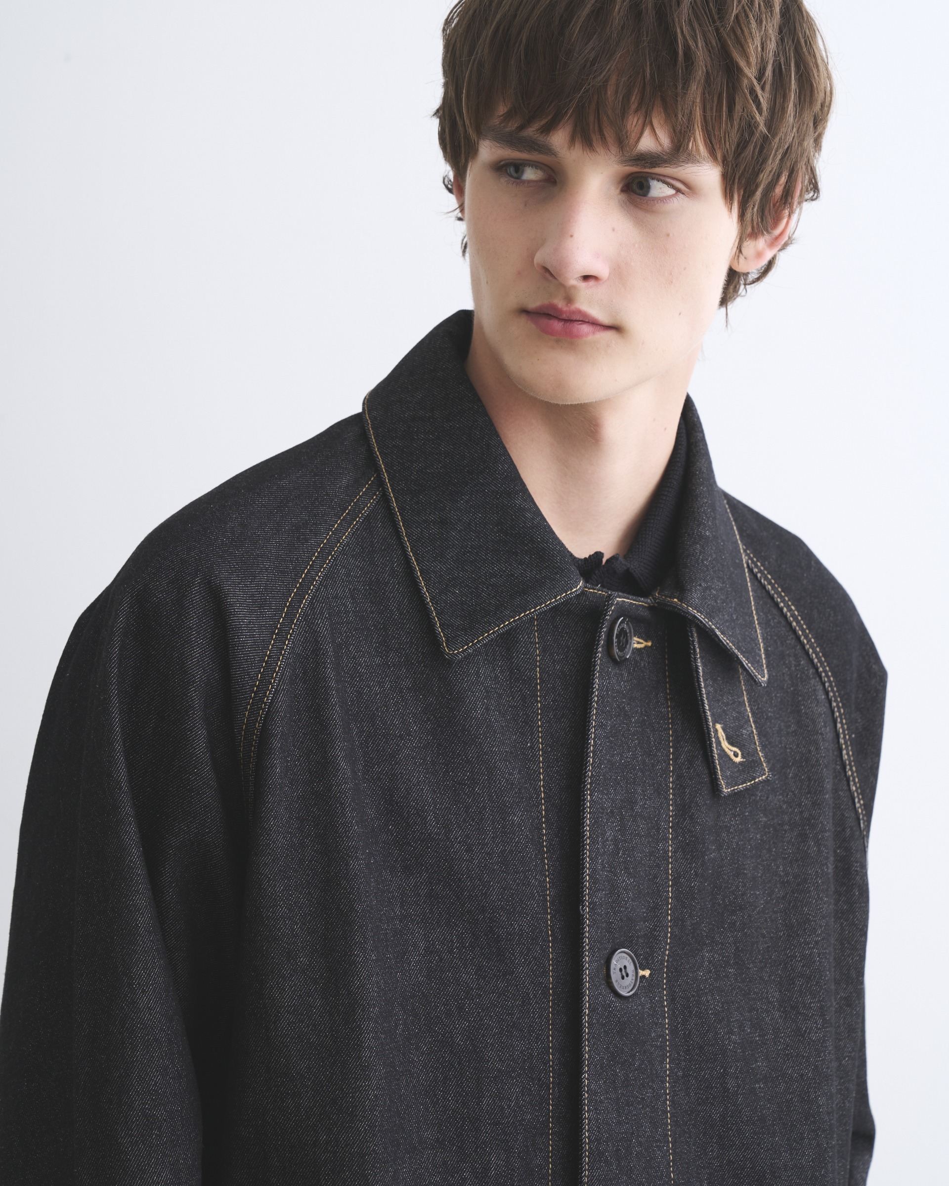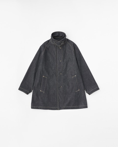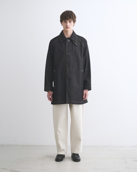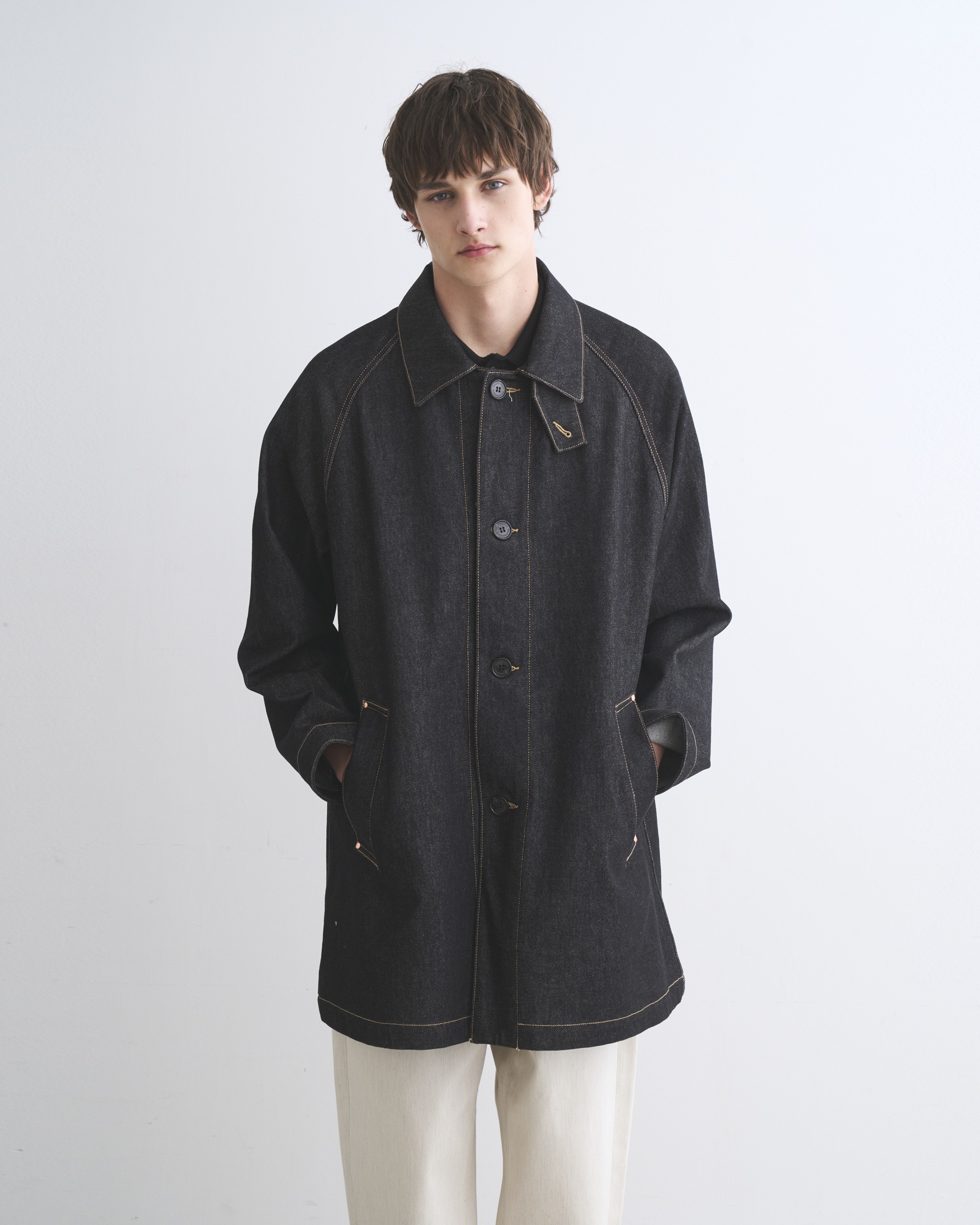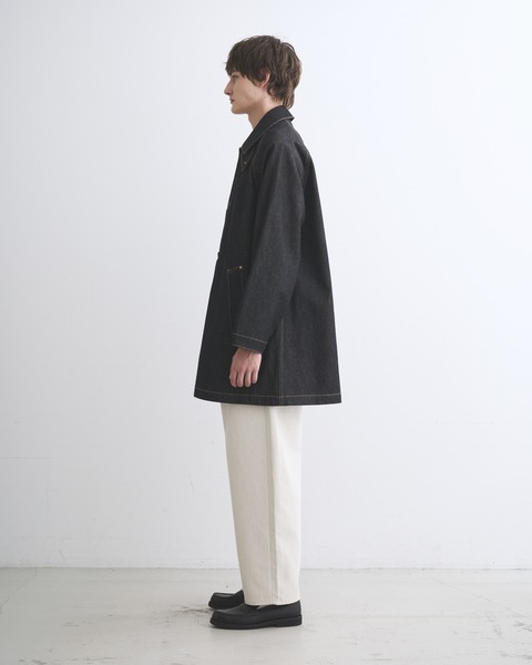 こちらのワークコート 002Dは、ラグランスリーブで首元は少し余裕があり、身幅はゆったりとしながらもすっきりとしたAラインシルエットです。襟を立ててチンタブで両襟を留めると、すっきりとしたスタイルに変わります。生地の状態でワンウォッシュしてから縫製しているので、アタリが少なくクリーンな印象に。