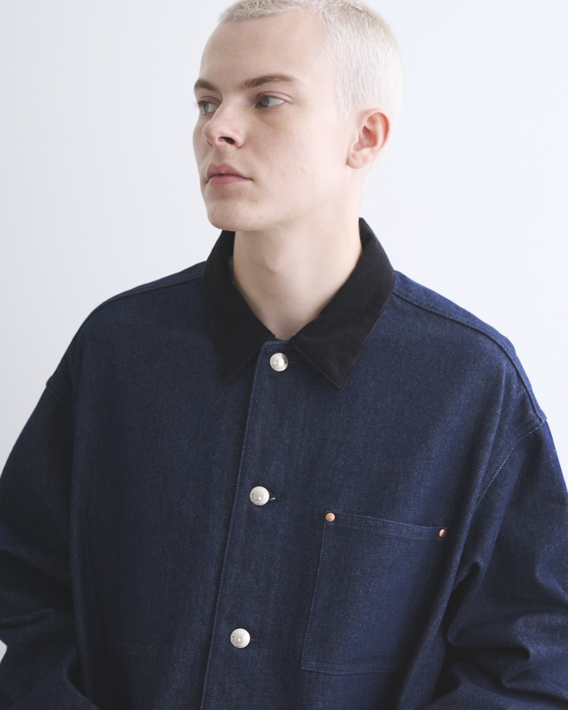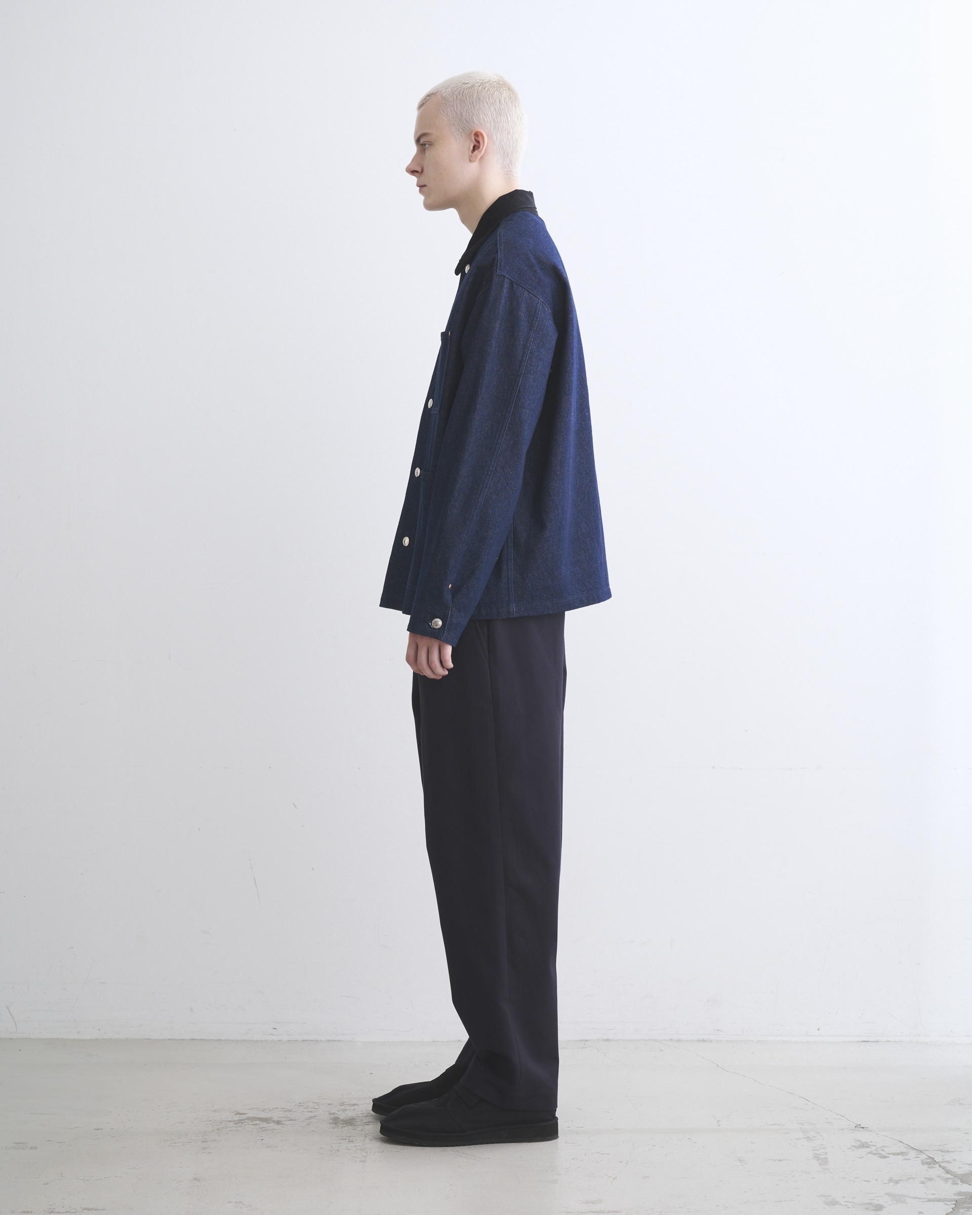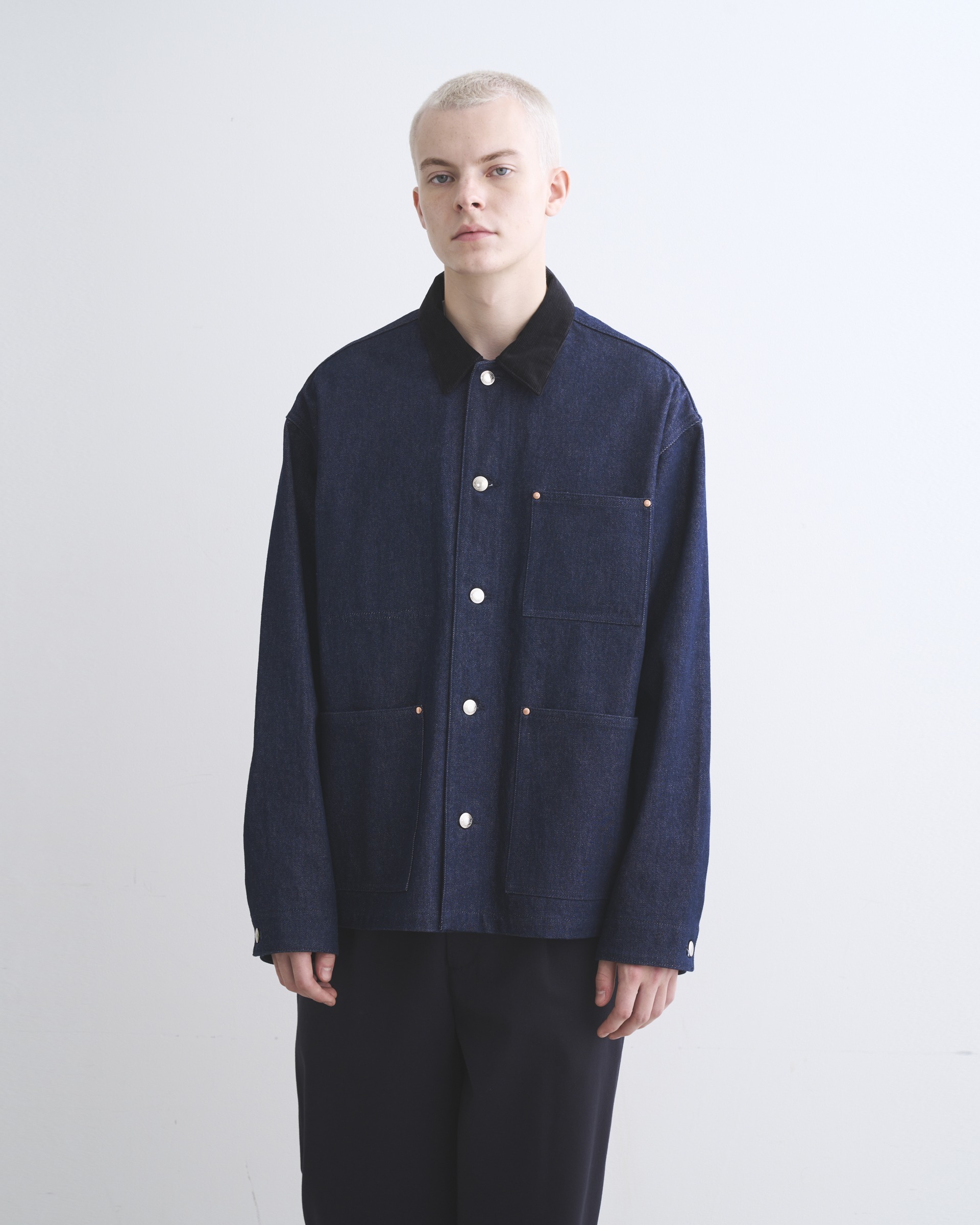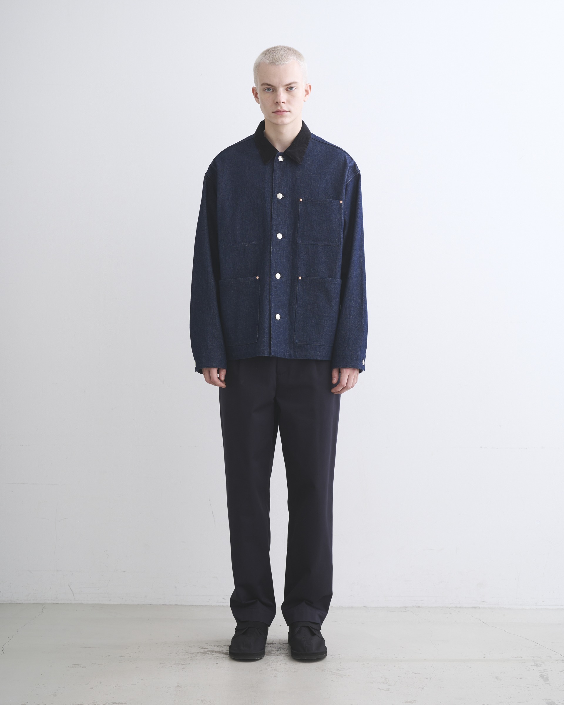 こちらのワークジャケット002Dは、ゆったりとした身幅とショート丈から生まれる、すっきりとしたボクシーシルエットが魅力。フロントのシルバーに輝く5つのタックボタンや、フラットなリベットで補強されたスクエアポケットなど、シャープなディテールを配したデザインなので、カジュアルになり過ぎないモダンなカバーオールです。生地の状態でワンウォッシュしてから縫製しているので、アタリが少なくクリーンな印象に。
