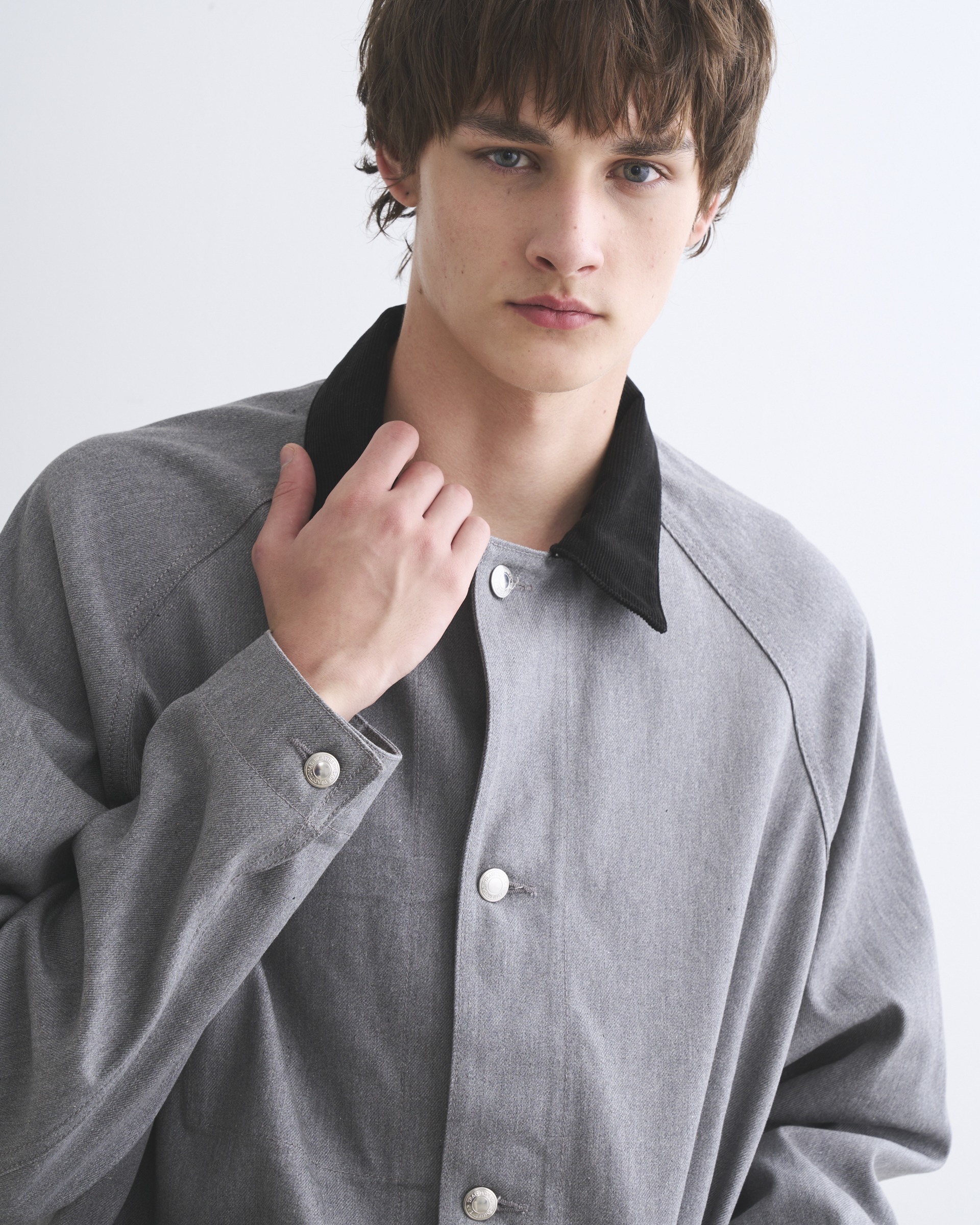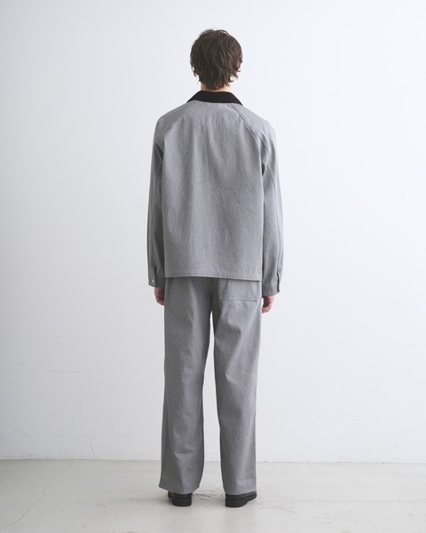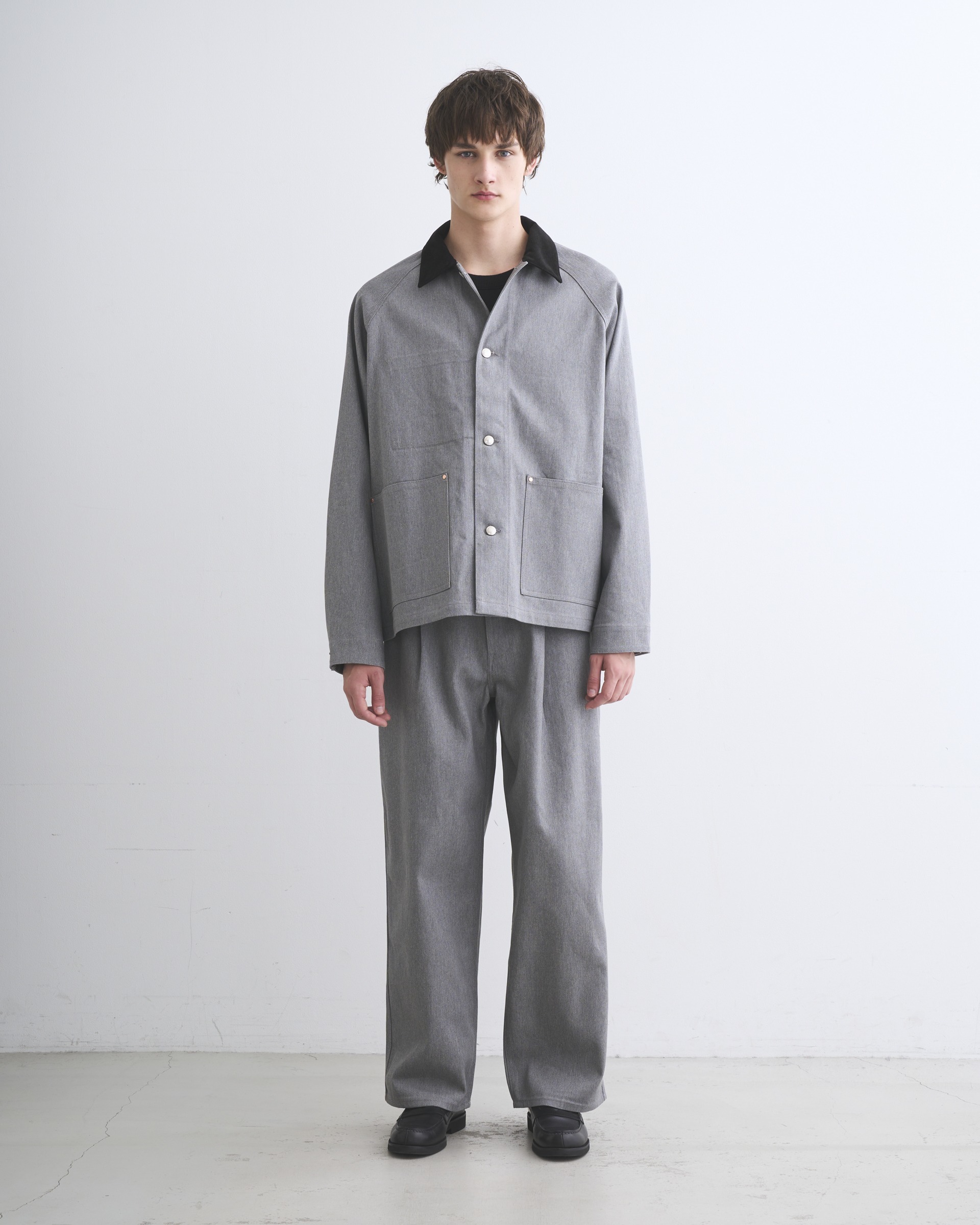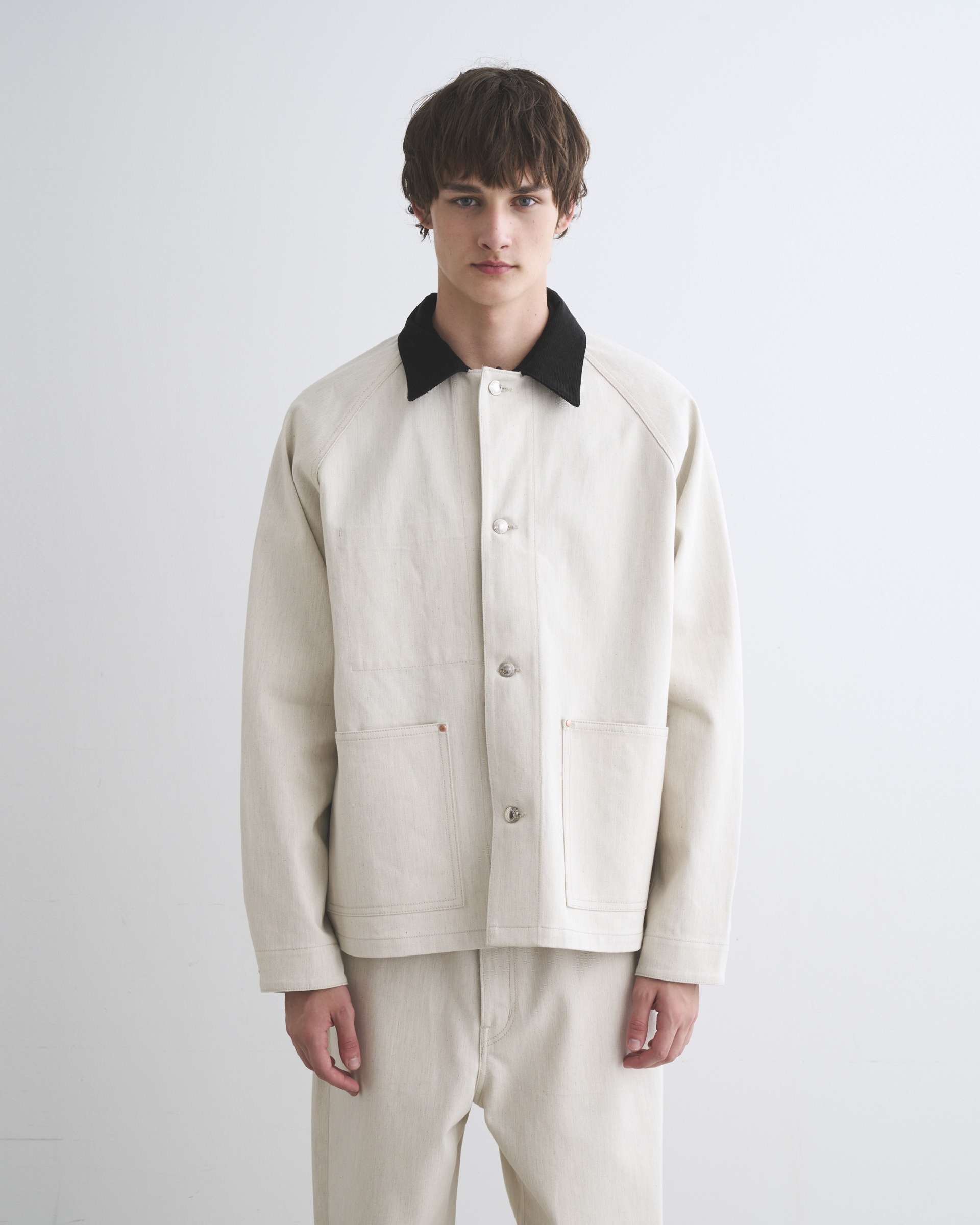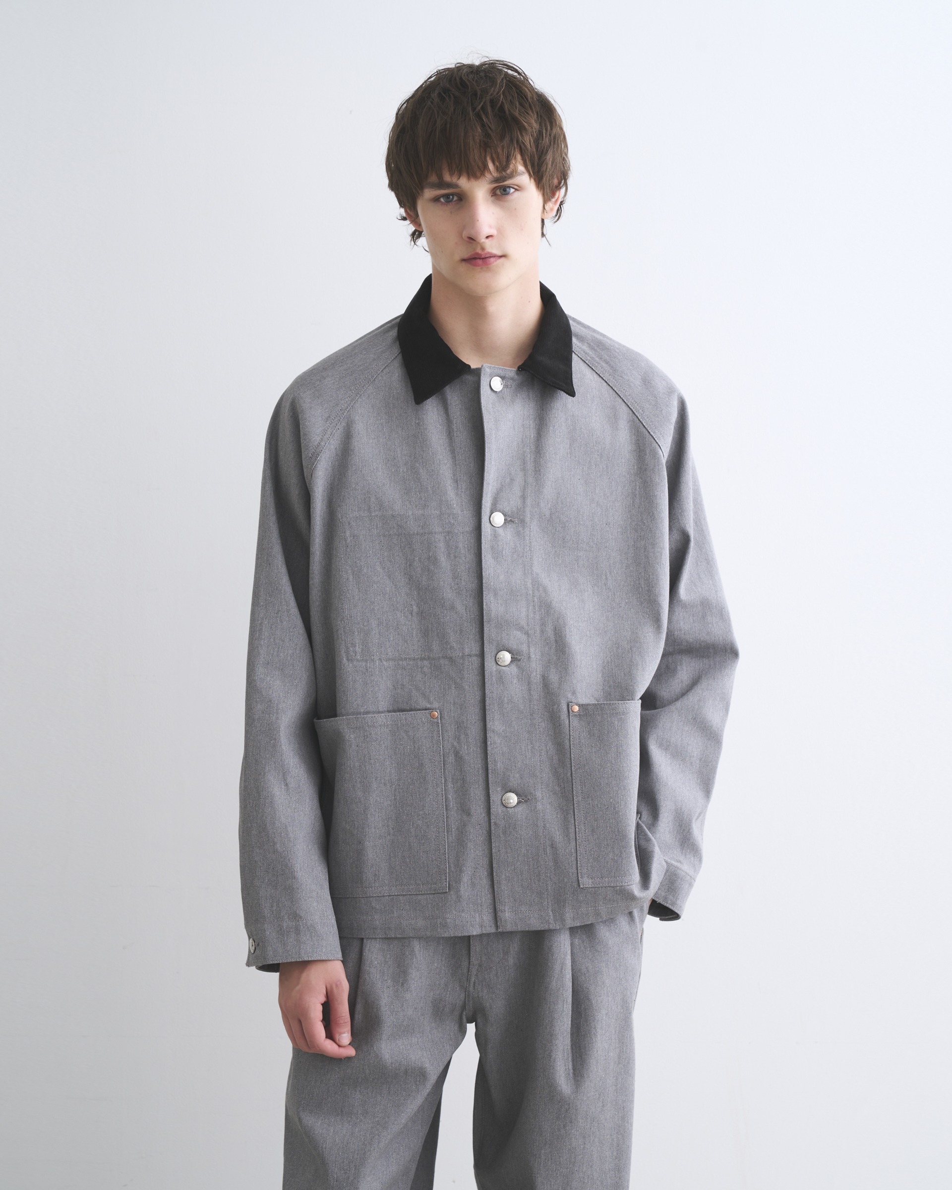 こちらのワークジャケット005Dは、ラグランスリーブとショート丈から生まれる、丸みのある立体的なシルエットが魅力。フロントのシルバーに輝く4つのタックボタンや、フラットなリベットで補強されたスクエアポケットなど、シャープなディテールを配したデザインなので、カジュアルになり過ぎないキレイ目なカバーオールです。経に杢糸を使用した表情のあるデニム素材は、カジュアルになり過ぎずモダンな印象に。第一ボタンを開けて、カジュアルジャケット感覚の着方もオススメです。