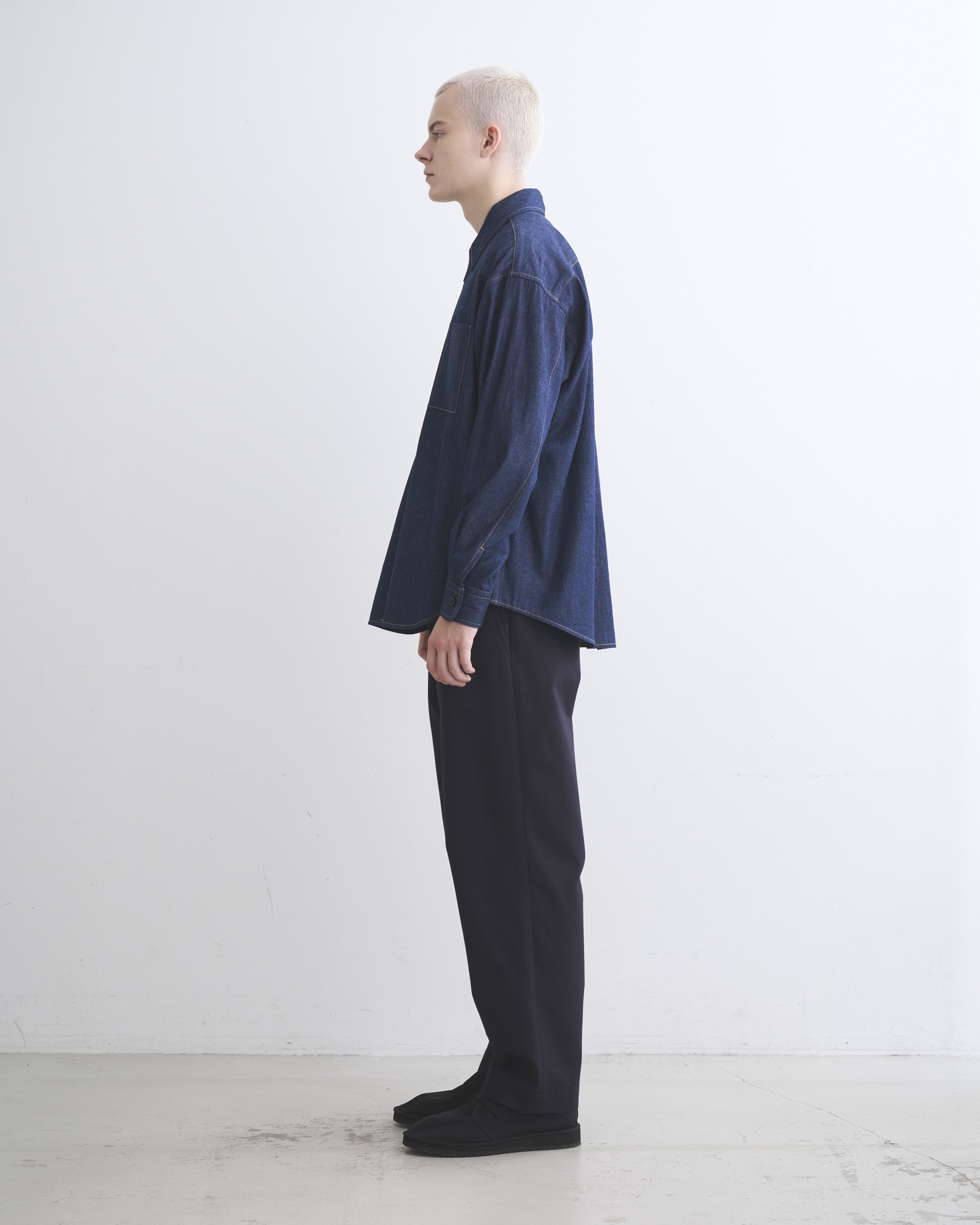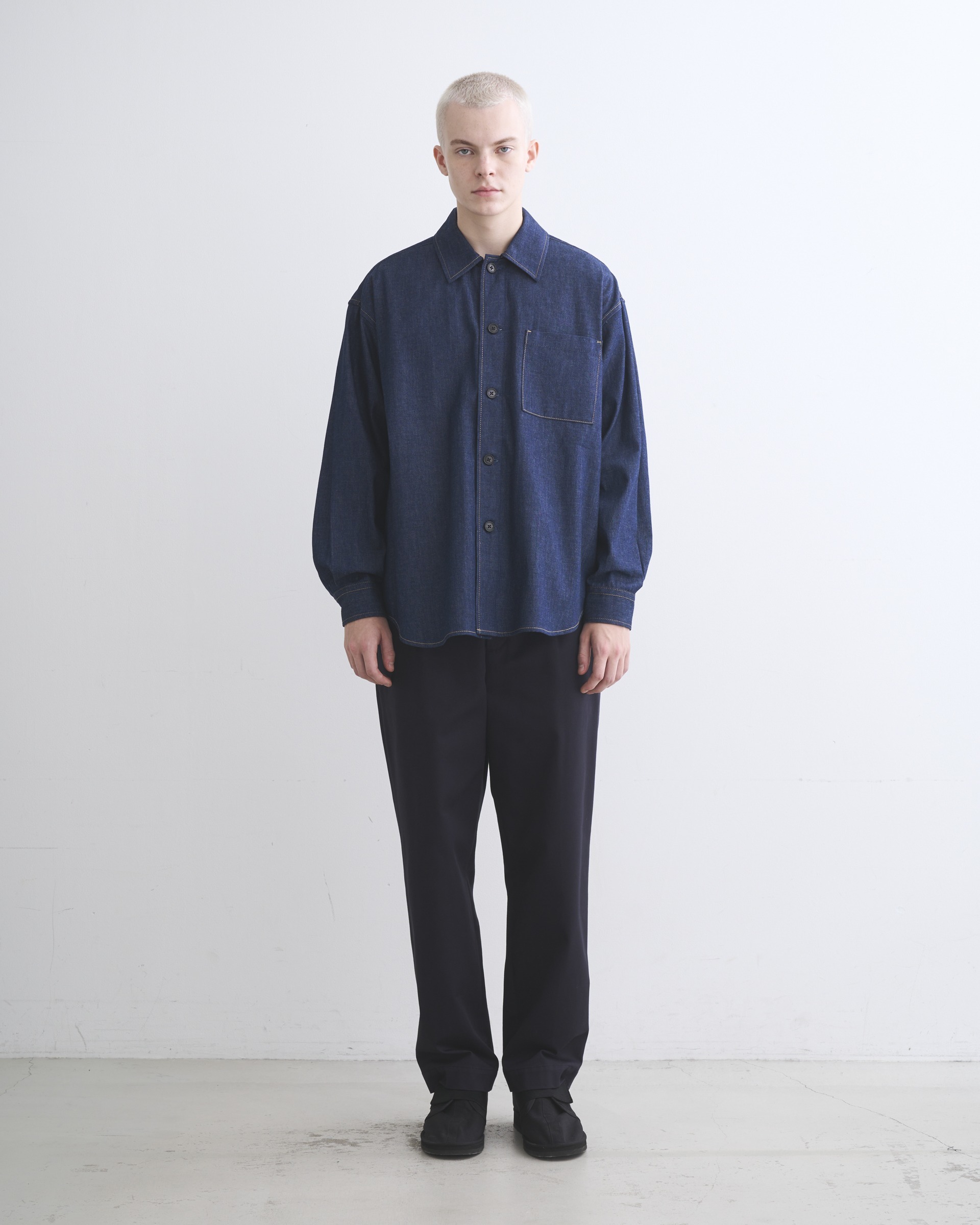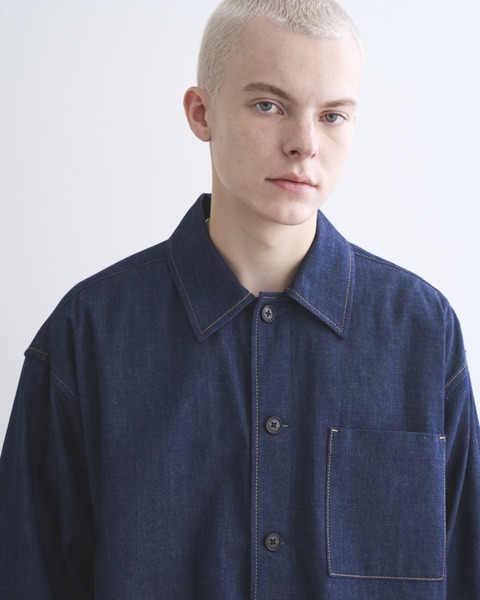 こちらのシャツ 001Dは、程よくドロップしたショルダーラインとボクシーなシルエットが特長で、腰にポケットが付いているので羽織りとしても活躍します。生地の状態でワンウォッシュしてから縫製しているので、アタリが少なくクリーンな印象に。