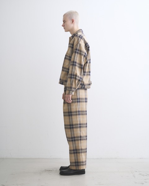 こちらのワークジャケット001は、ゆったりとした身幅とショート丈から生まれる着やすくもすっきりとしたシルエットが魅力です。素材には上質な原料を丁寧に織り上げたハリのあるコットンツイルを使用しているので、立体的な美しいシルエットが際立ちます。シルバーに輝く4つのタックボタンと、コッパーリベットを打ったポケットを一つだけ配しており、ミニマルな印象を与えます。太番手の糸を使用しているので存在感のあるハッキリとしたチェック柄が叶います。