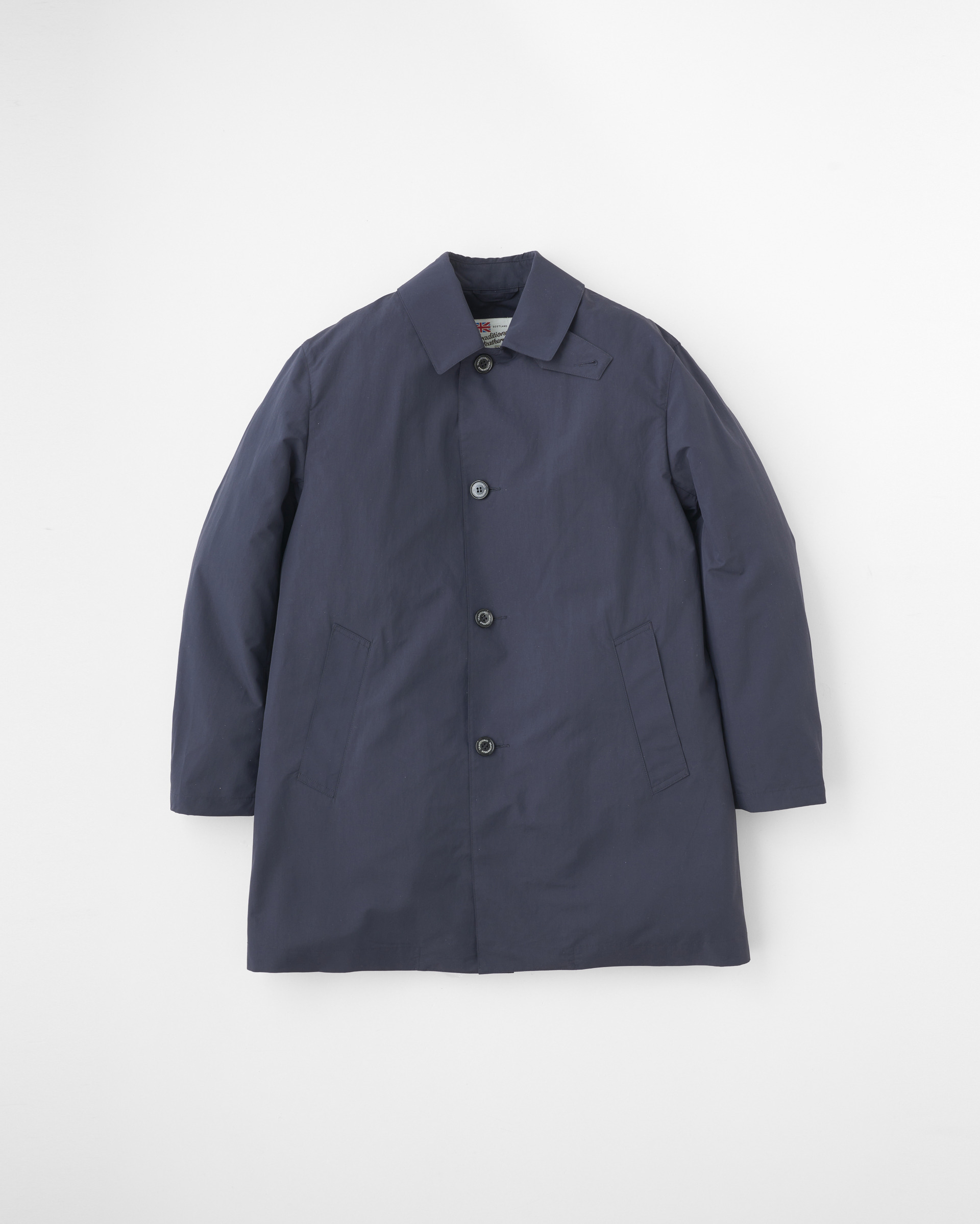 こちらのダービーボタンスルーは、ステンカラーコートのきちんと感がありながら、僅かにドロップしたショルダーラインと、程よくゆとりのある身幅が特長で、ドレス感のある装いから、カジュアルなデニムスタイルまで活躍する、着る人を選ばない万能コートです。襟を立ててチンタブで両襟を留めると、すっきりとした印象に変わります。ポリエステルをゆっくりと繊細に織り上げたこちらの素材は、軽くてしなやかでフラットな表情のあるファブリックです。撥水性もあり、レインジャケットとしても活躍します。