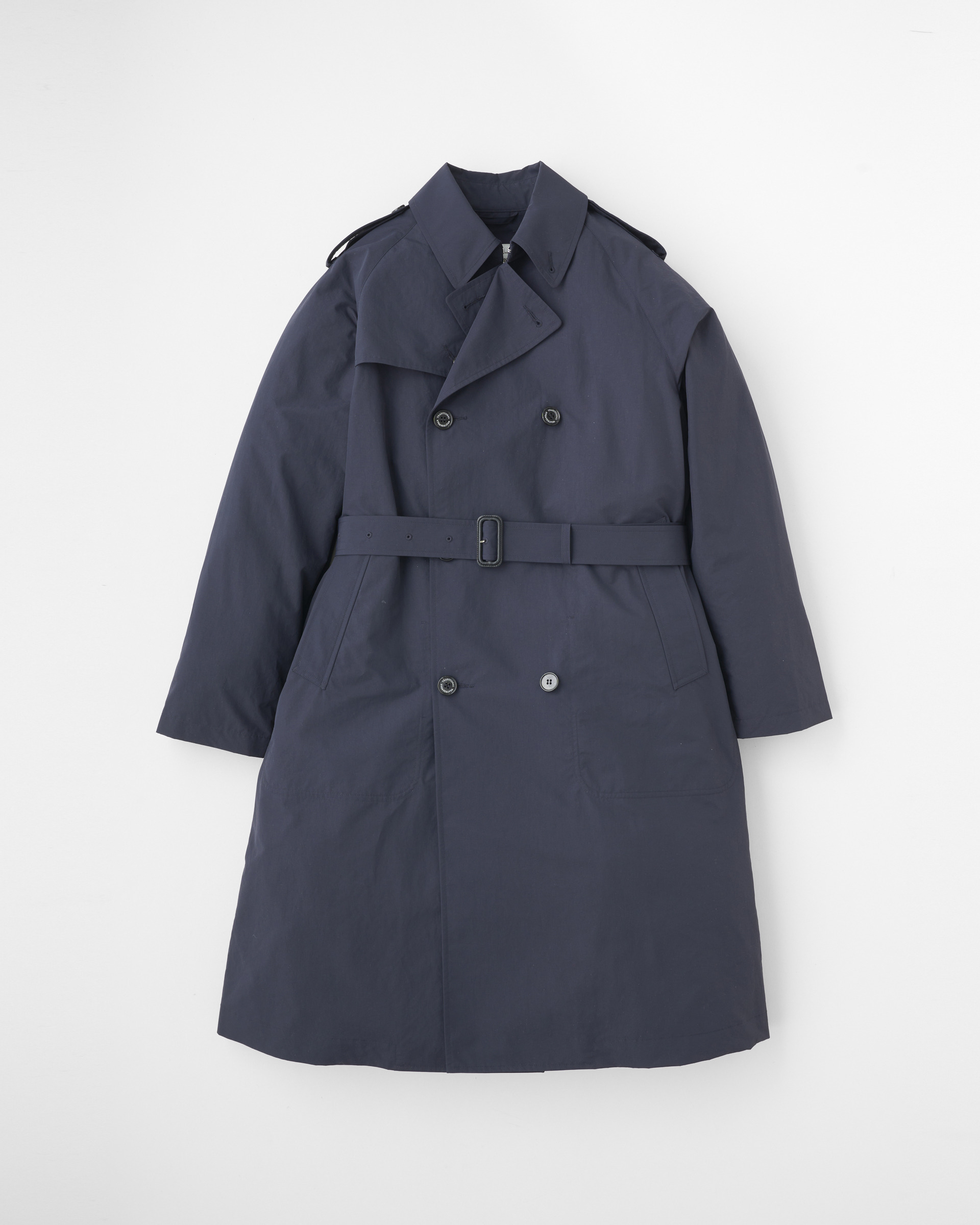 エポレット、アンブレラヨーク、ガンパッチ等のクラシカルなデザインを有したこちらのトレンチコートは、ボリュームのある袖とオーバーサイズのシルエットが魅力で、ドレス感のある装いから、カジュアルなデニムスタイルまで活躍する、着る人を選ばない万能コートです。腰のポケットは、内側からも出し入れできるマガジンポケット仕様になっているので、機能性も抜群。ポリエステルをゆっくりと繊細に織り上げたこちらの素材は、軽くてしなやかでフラットな表情のあるファブリックです。撥水性もあり、レインコートとしても活躍します。