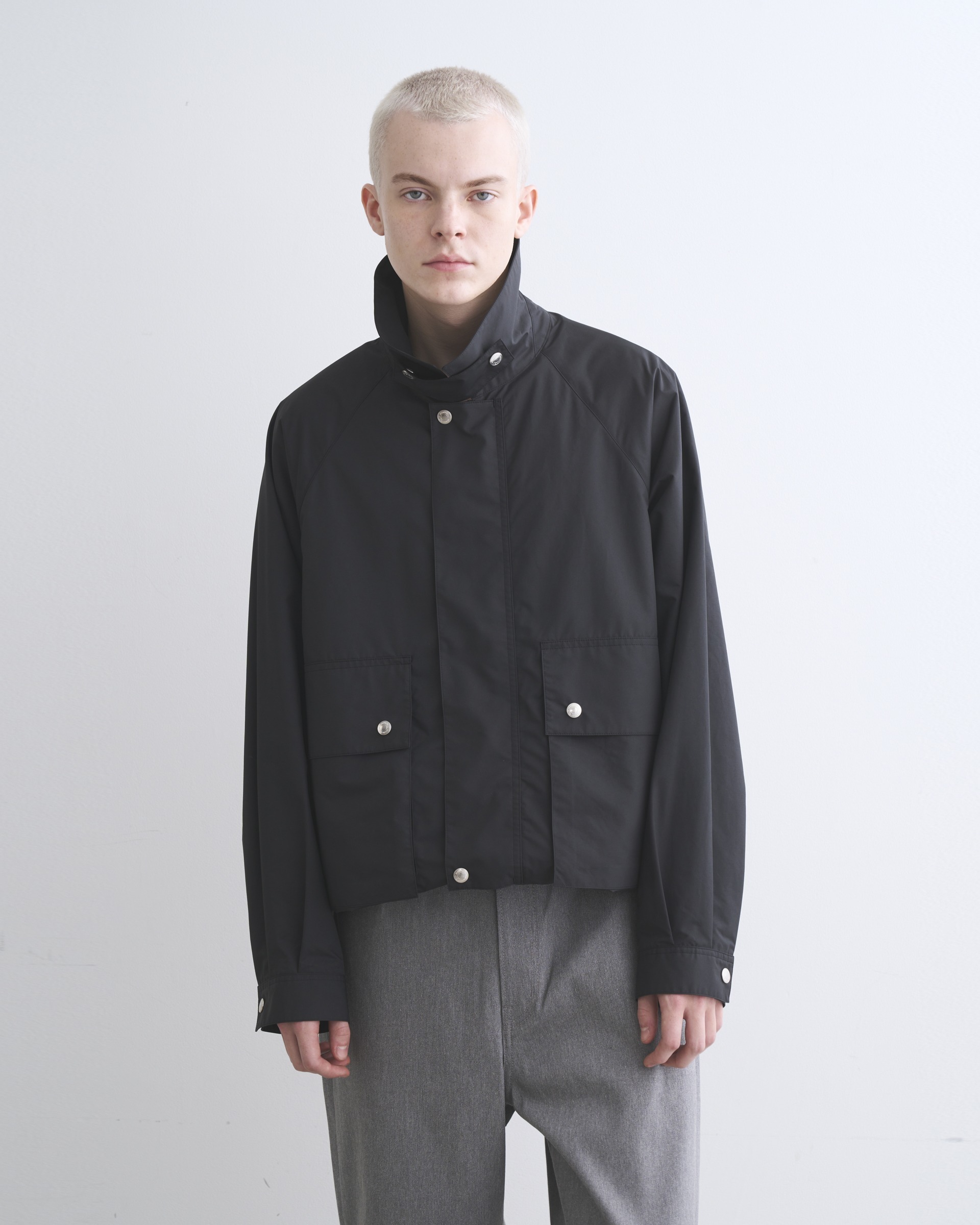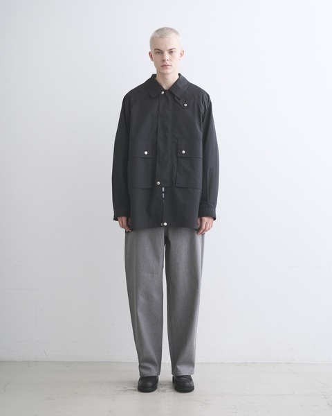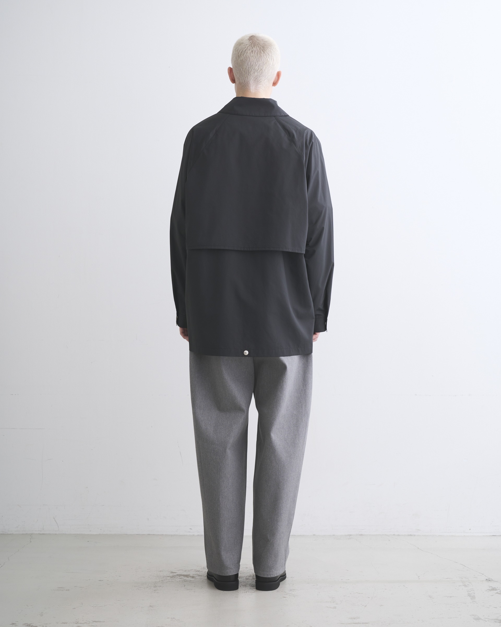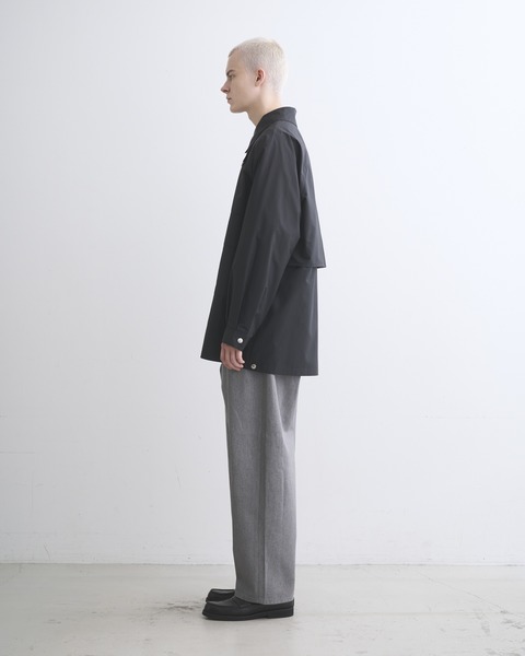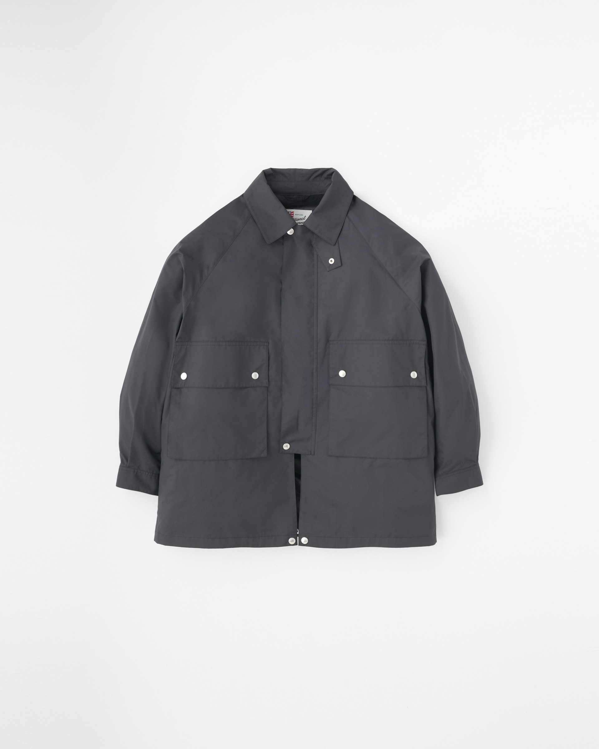 英国伝統のフィールドコートをベースにした、背中の大きなアンブレラヨークや、ラグランスリーブでボリュームのある袖が特長のアウターウェアです。内側に折り返してスナップボタンを留めると着丈が約20cm短くなり、コーディネートのバランスを調節できます。ポリエステルをゆっくりと繊細に織り上げたこちらの素材は、軽くてしなやかでフラットな表情のあるファブリックです。撥水性もあり、レインジャケットとしても活躍します。