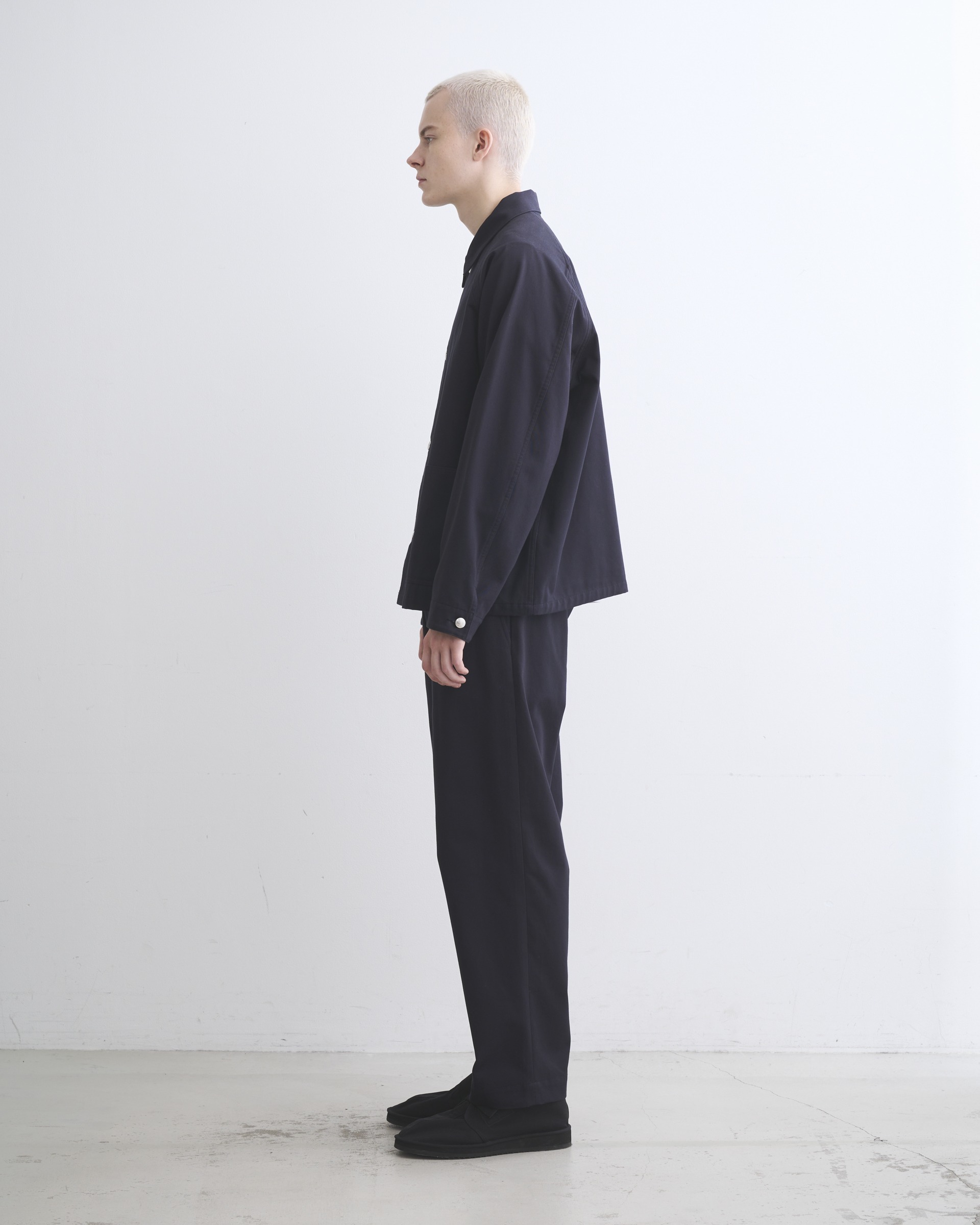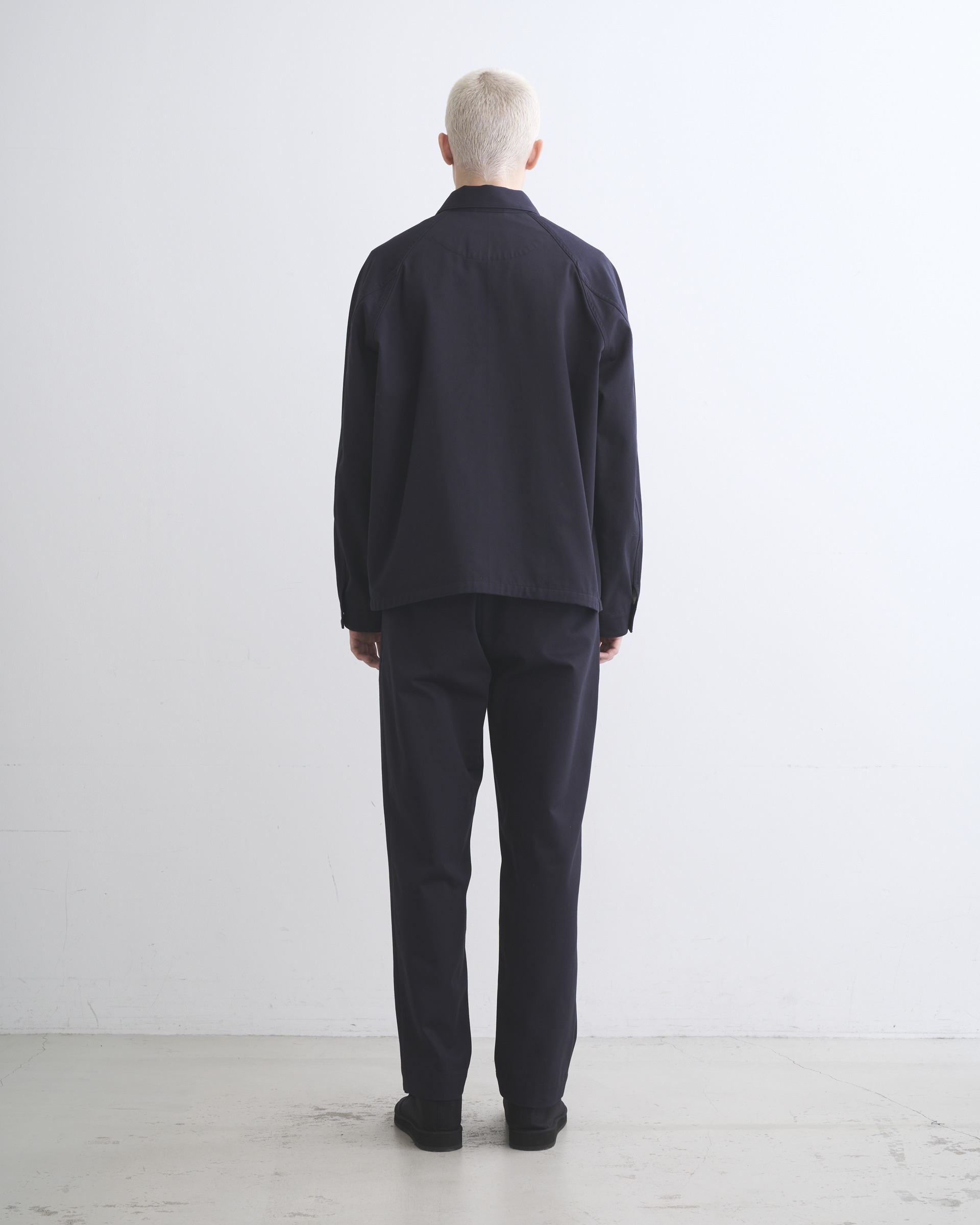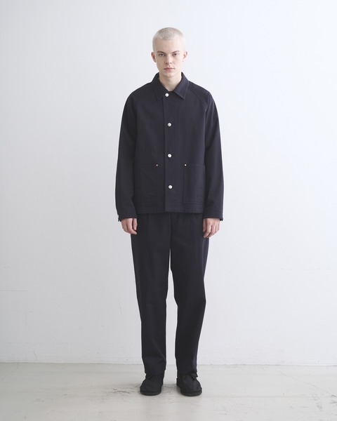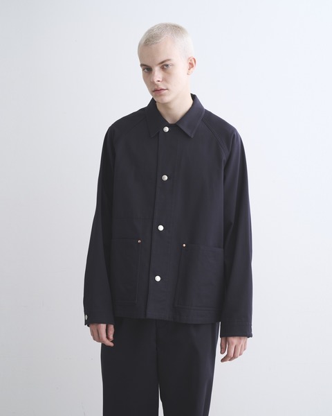 こちらのワークジャケット005Dは、ラグランスリーブとショート丈から生まれる、丸みのある立体的なシルエットが魅力です。コットンを高密度に織り上げた光沢のあるチノ素材を使用しているので、クリーンな表情と深みのある光沢が特長です。フロントのシルバーに輝く4つのタックボタンや、フラットなリベットで補強されたスクエアポケットなど、シャープなディテールを配したデザインなので、カジュアルになり過ぎないキレイ目なカバーオールです。第一ボタンを開けて、カジュアルジャケット感覚の着方もオススメです。