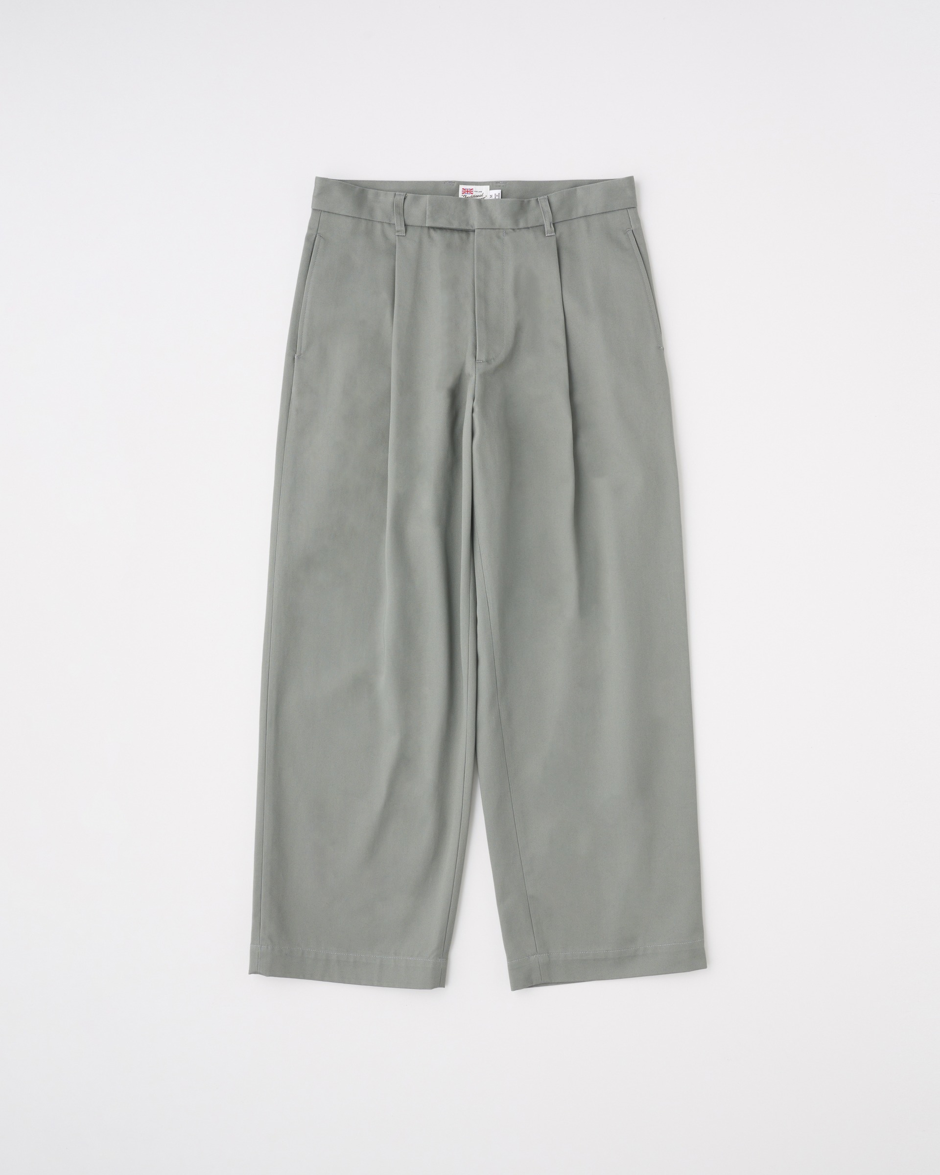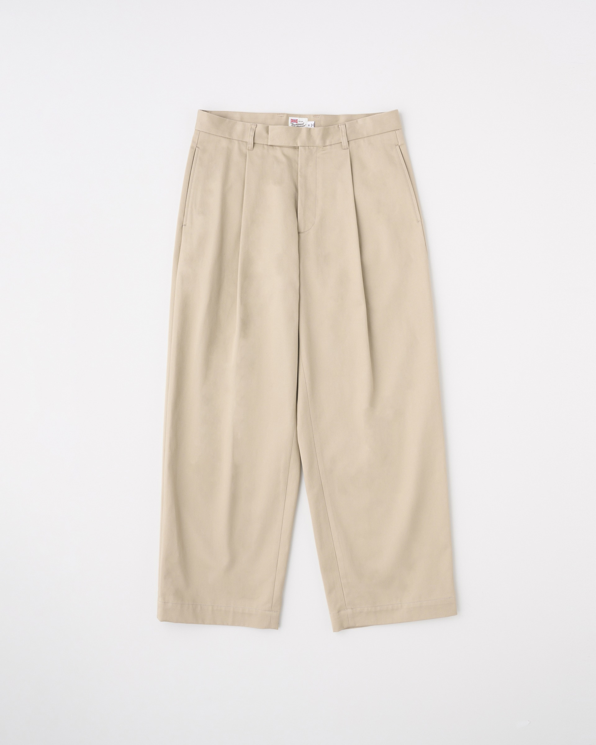 こちらの人気No.1のユニオンスラック102は、深いタックの入ったワイドパンツの103のタックの深さを半分(往復5cm)にすることで、パンツ幅を少し狭めたセミワイドパンツです。極太美脚パンツの代名詞"103"の唯一無二のシルエットを活かしながらも、緩やかなセミワイドにした汎用性の高いモデルです。フロントボタンが表に出ない6cmの持ち出しが付いている仕様なので、ベルトレスで着用した際のキマりが抜群です。バックは、クラシカルな両玉縁ポケットを左右に配置。高密度に織られたハイカウントチノを使用しています。