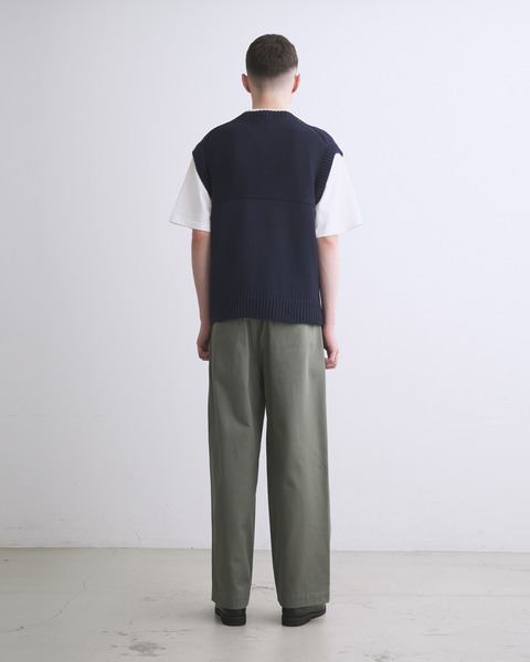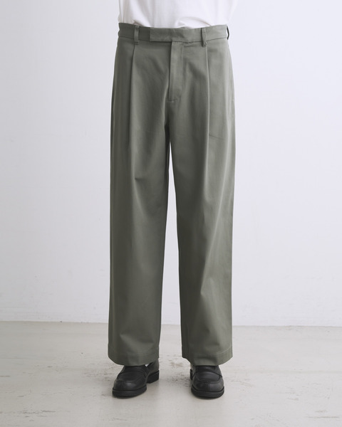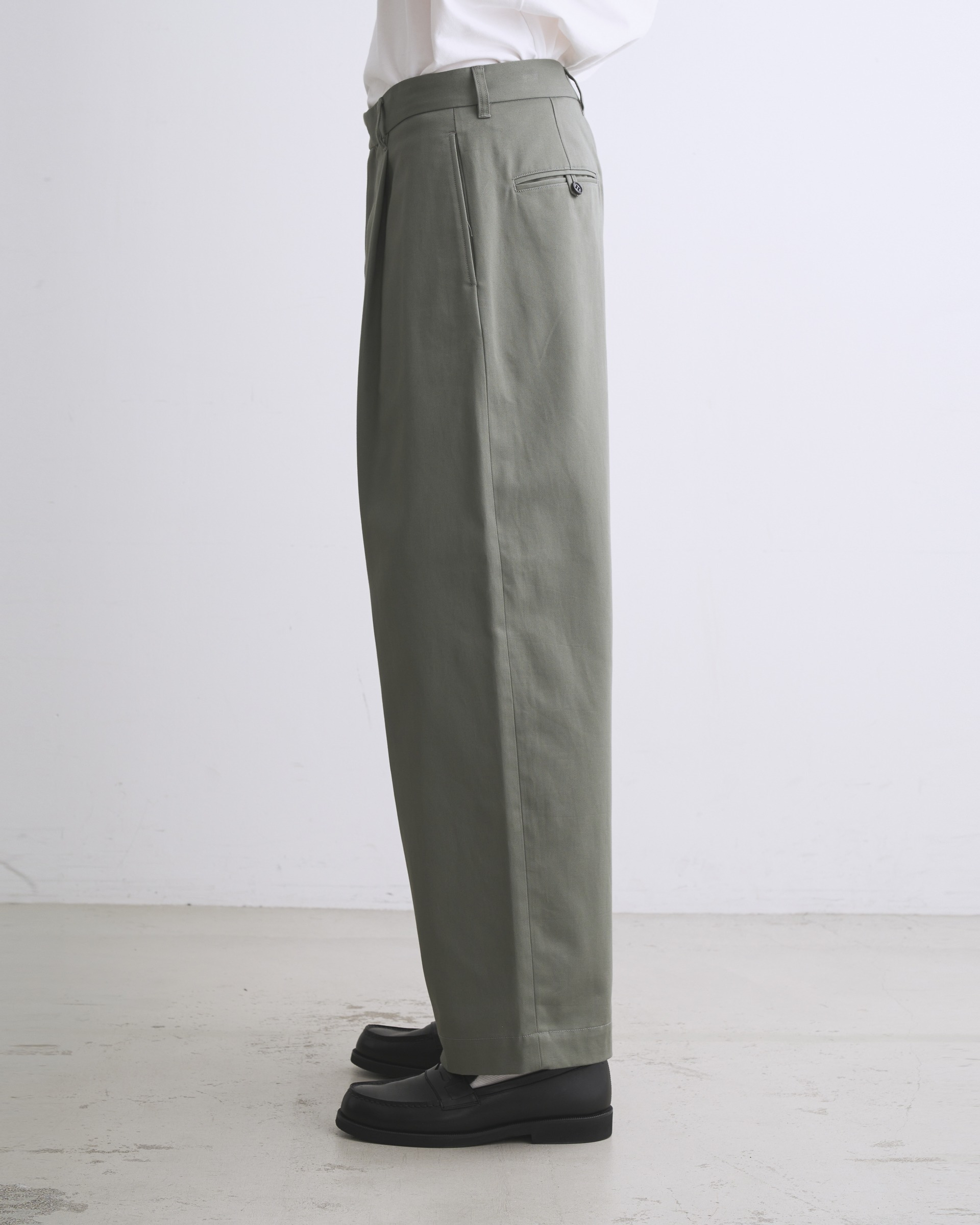 こちらの人気No.1のユニオンスラック102は、深いタックの入ったワイドパンツの103のタックの深さを半分(往復5cm)にすることで、パンツ幅を少し狭めたセミワイドパンツです。極太美脚パンツの代名詞"103"の唯一無二のシルエットを活かしながらも、緩やかなセミワイドにした汎用性の高いモデルです。フロントボタンが表に出ない6cmの持ち出しが付いている仕様なので、ベルトレスで着用した際のキマりが抜群です。バックは、クラシカルな両玉縁ポケットを左右に配置。高密度に織られたハイカウントチノを使用しています。