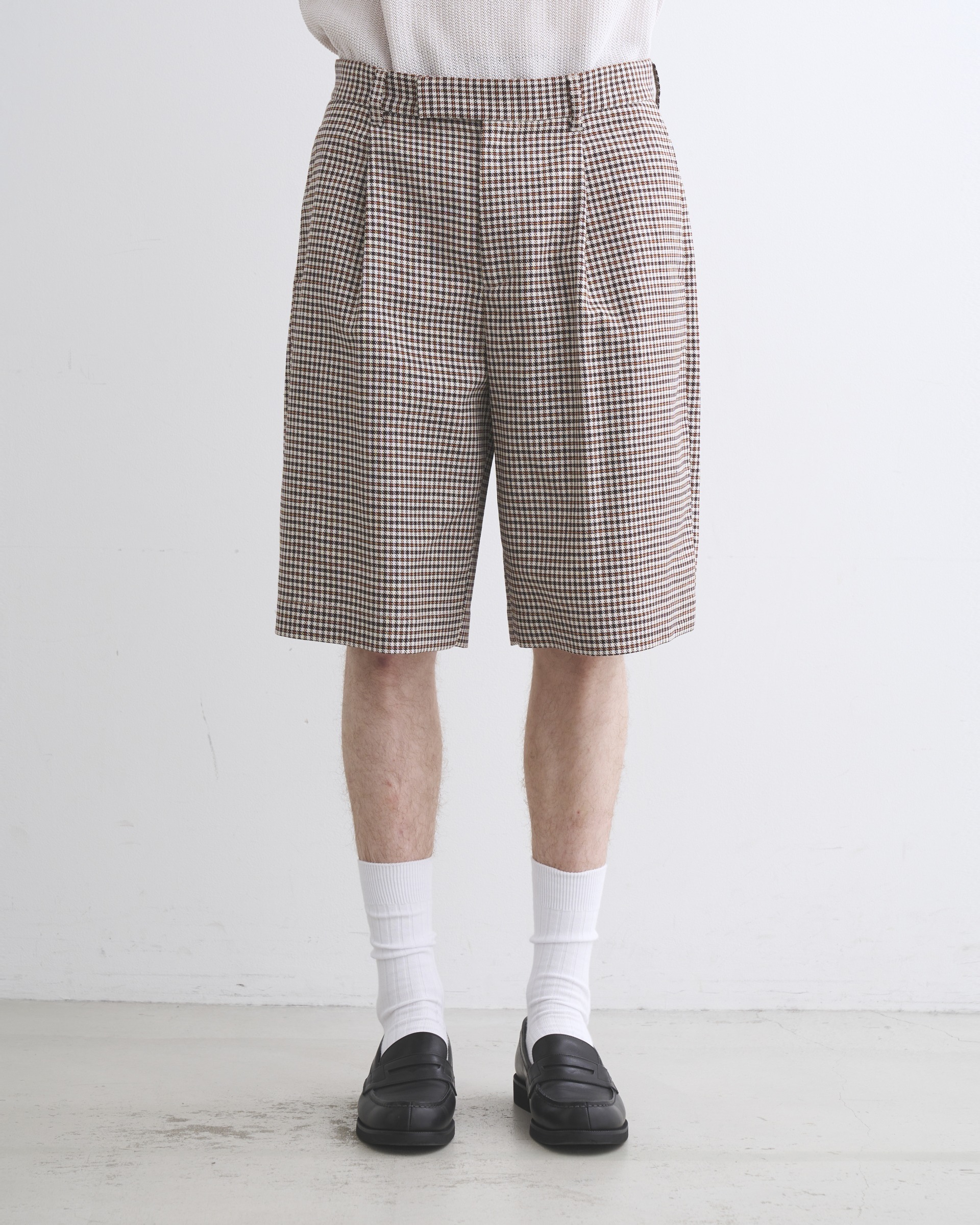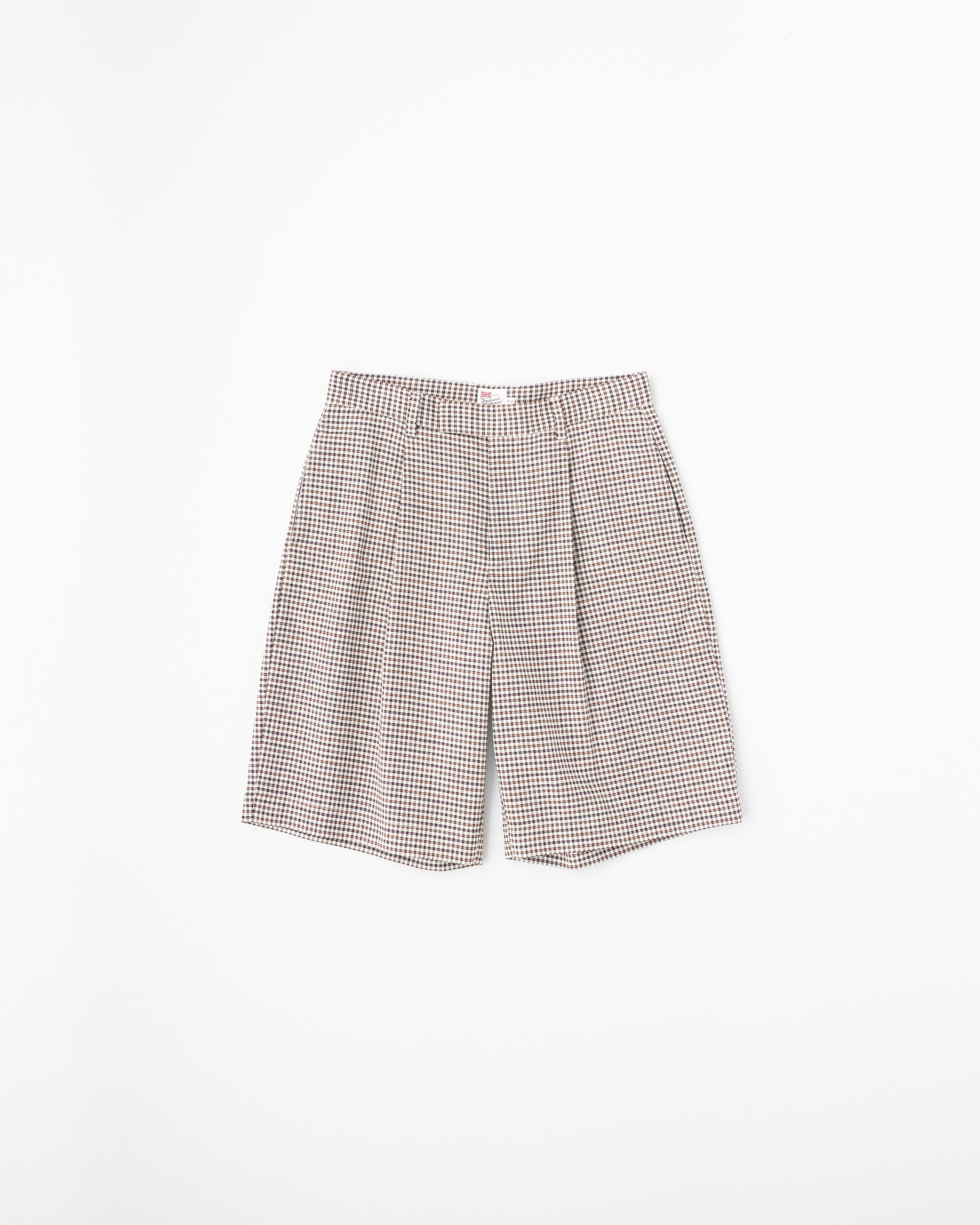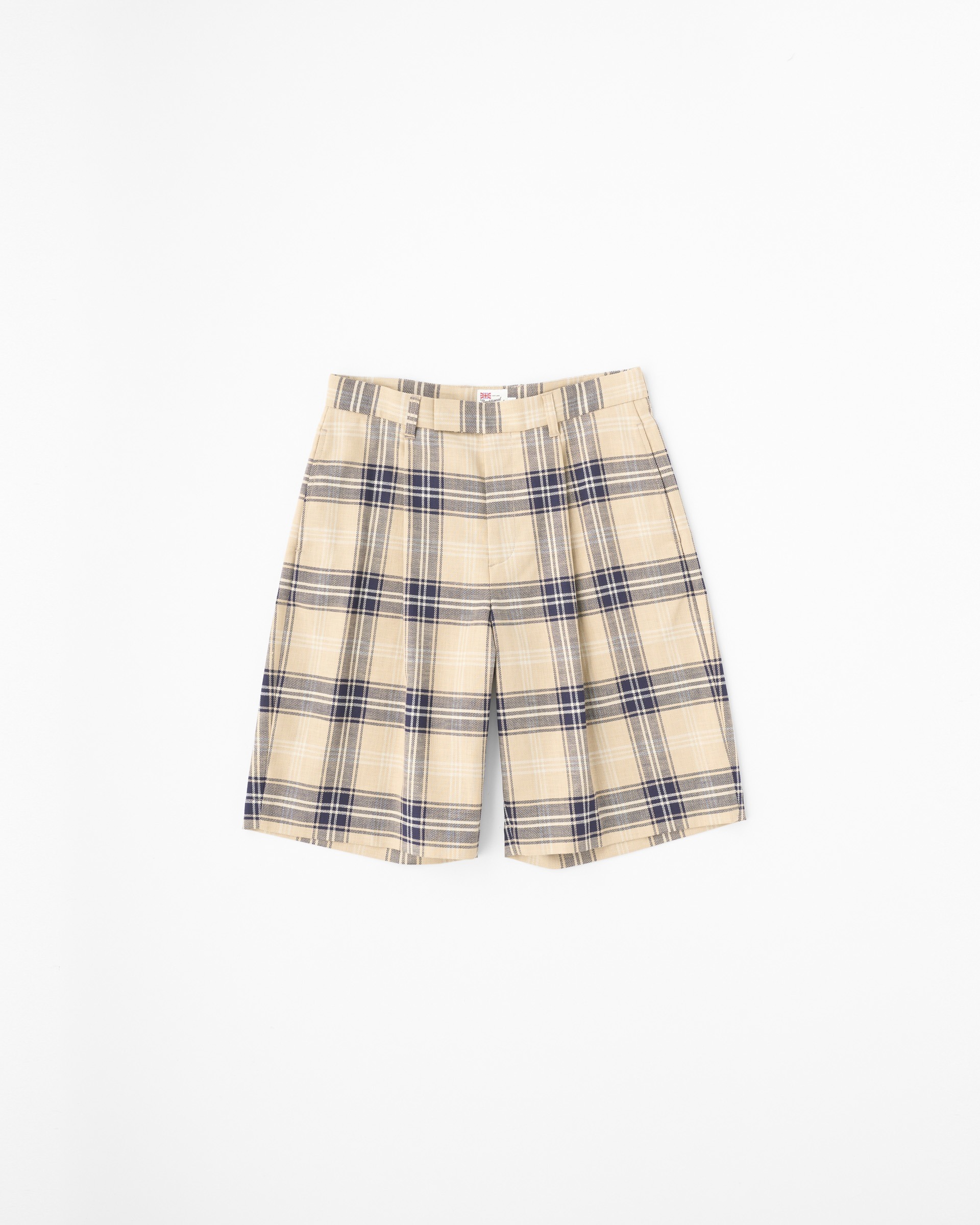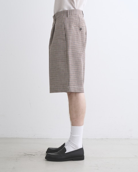 こちらのユニオンスラック107は、往復5cmの程よいタックを有した、セミワイドシルエットのショーツです。ワイドで直線的なシルエットがモダンな印象で、コディネートが子供っぽく見えないデザインです。フロントボタンが表に出ない6cmの持ち出しが付いている仕様なので、ベルトレスで着用した際のキマりが抜群です。素材には上質な原料を丁寧に織り上げたハリのあるコットンツイルを使用しているので、立体的な美しいシルエットが際立ちます。太番手の糸を使用しているので存在感のあるハッキリとしたチェック柄が叶います。。