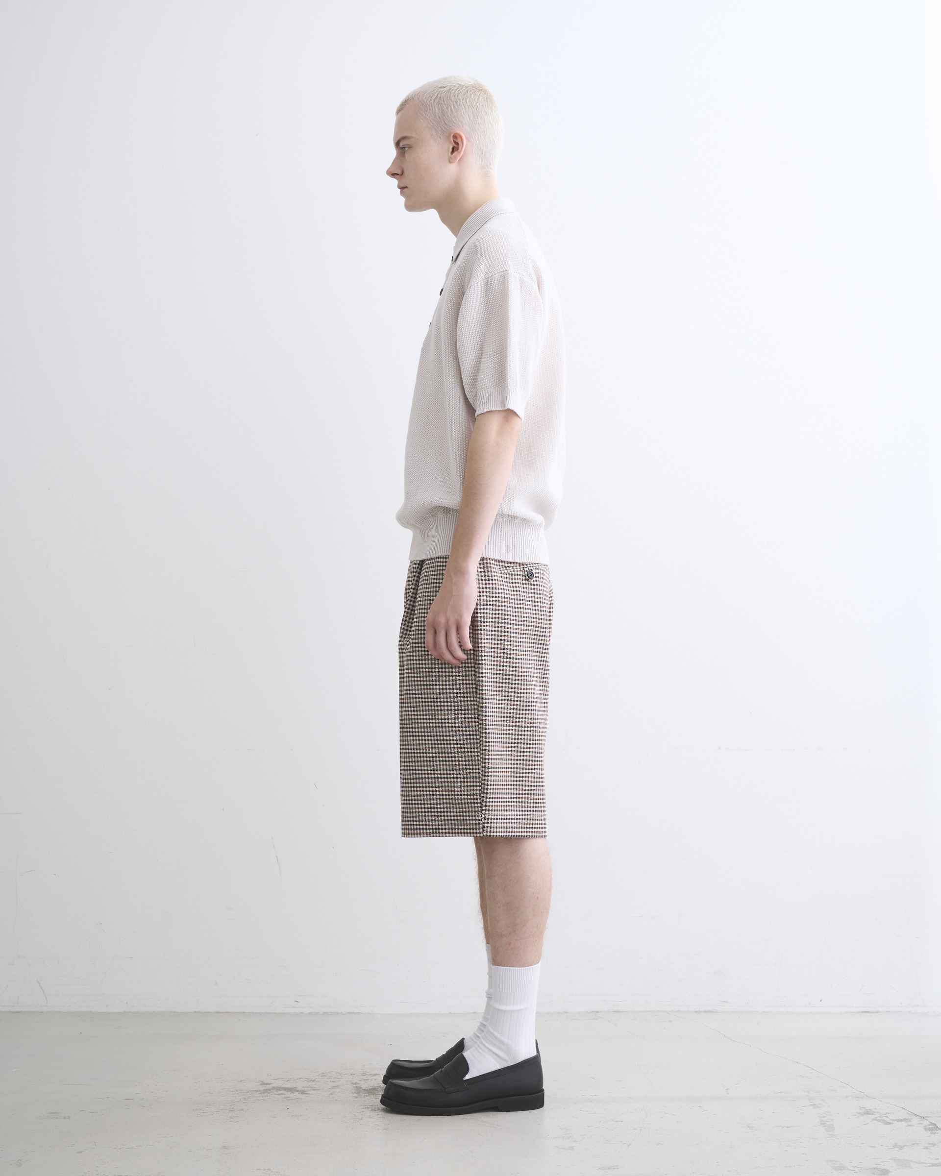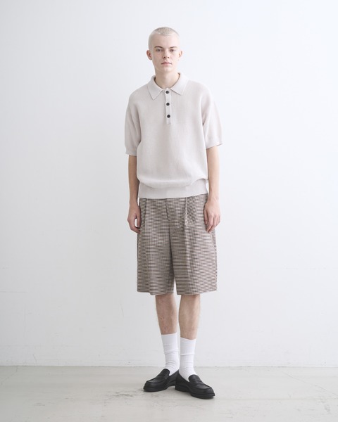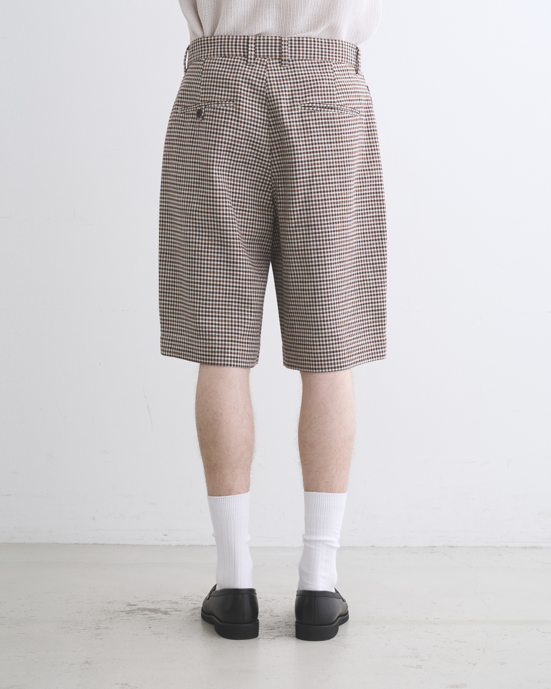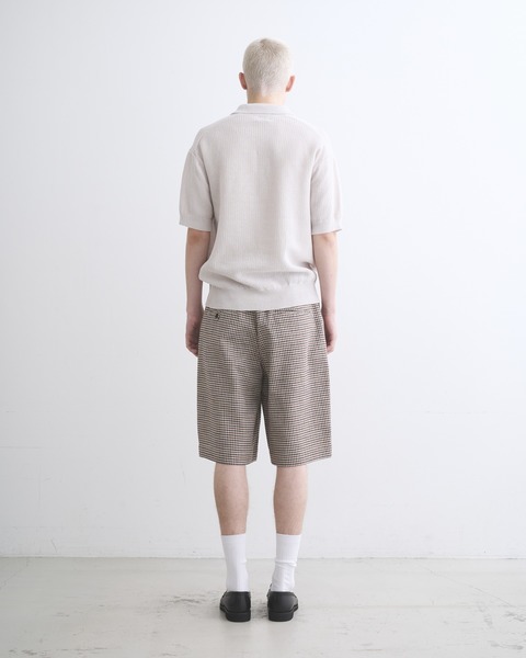 こちらのユニオンスラック107は、往復5cmの程よいタックを有した、セミワイドシルエットのショーツです。ワイドで直線的なシルエットがモダンな印象で、コディネートが子供っぽく見えないデザインです。フロントボタンが表に出ない6cmの持ち出しが付いている仕様なので、ベルトレスで着用した際のキマりが抜群です。素材には上質な原料を丁寧に織り上げたハリのあるコットンツイルを使用しているので、立体的な美しいシルエットが際立ちます。太番手の糸を使用しているので存在感のあるハッキリとしたチェック柄が叶います。。