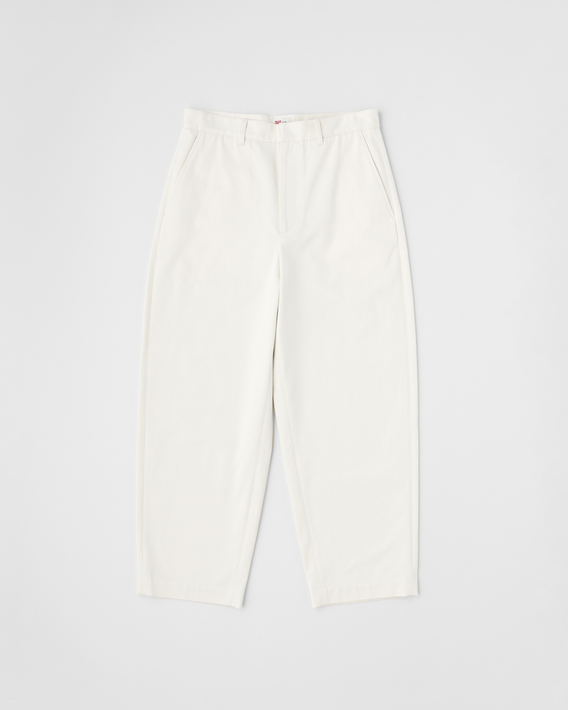 こちらのユニオンスラック112は、丸みのあるシルエットが魅力のテーパードパンツです。フロントポケットの下からサイドシームにそって緩やかにカーブする美しいシルエットが特長です。フロントボタンが表に出ない仕様なので、ベルトレスで着用した際のキマりが抜群です。高密度に織られたハイカウントチノを使用しています。