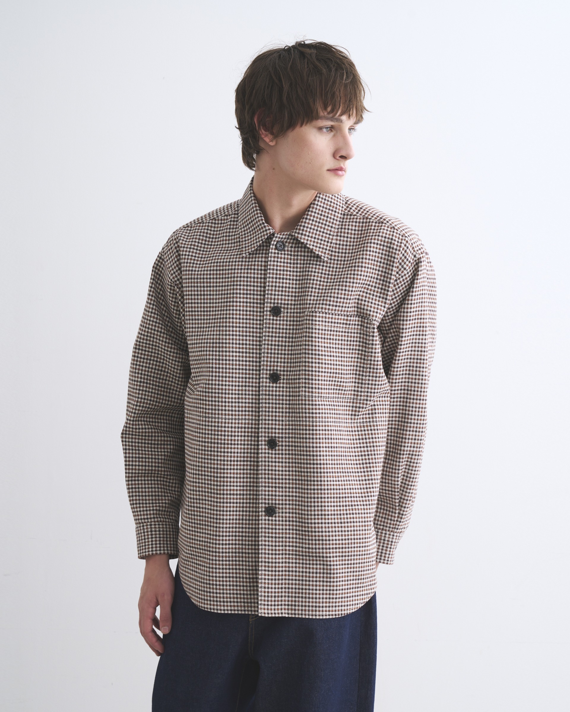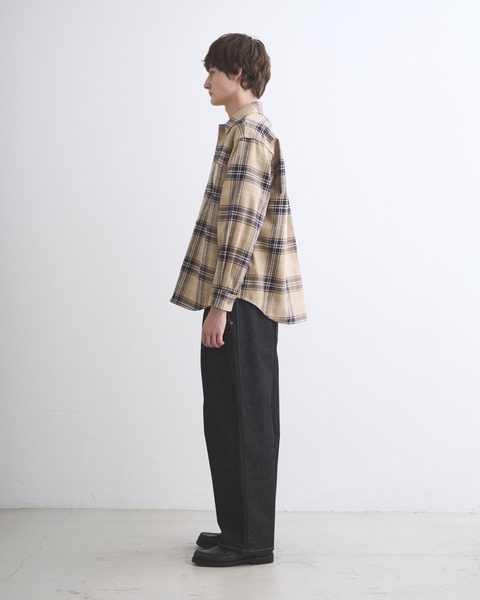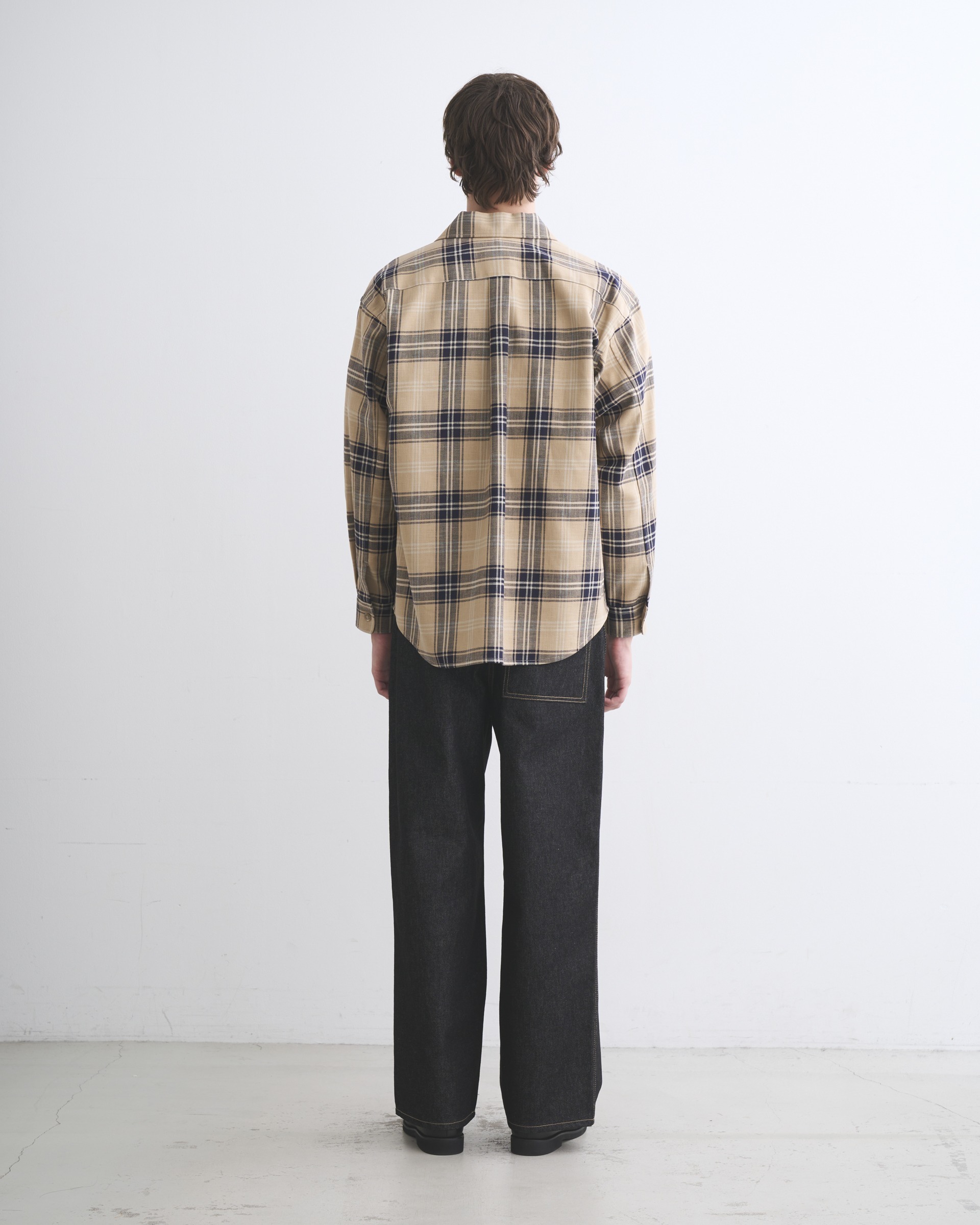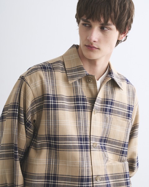 こちらのシャツ 001は、程よくドロップしたショルダーラインとボクシーなシルエットが特長で、腰にポケットが付いているので羽織りとしても活躍します。素材には上質な原料を丁寧に織り上げたハリのあるコットンツイルを使用しているので、立体的な美しいシルエットが際立ちます。太番手の糸を使用しているので存在感のあるハッキリとしたチェック柄が叶います。