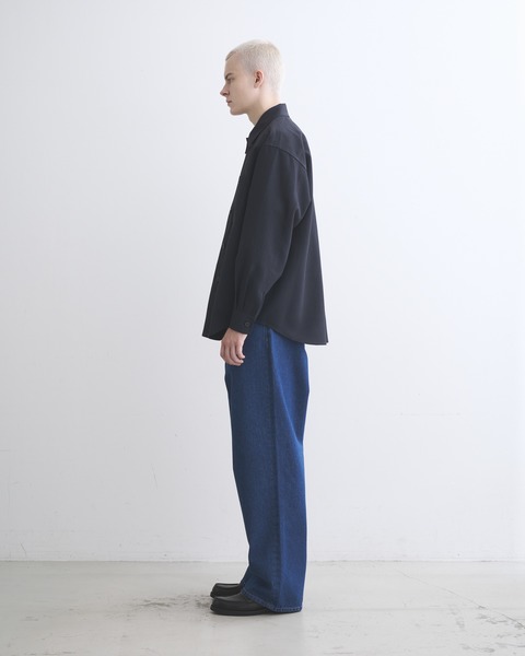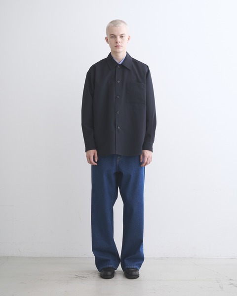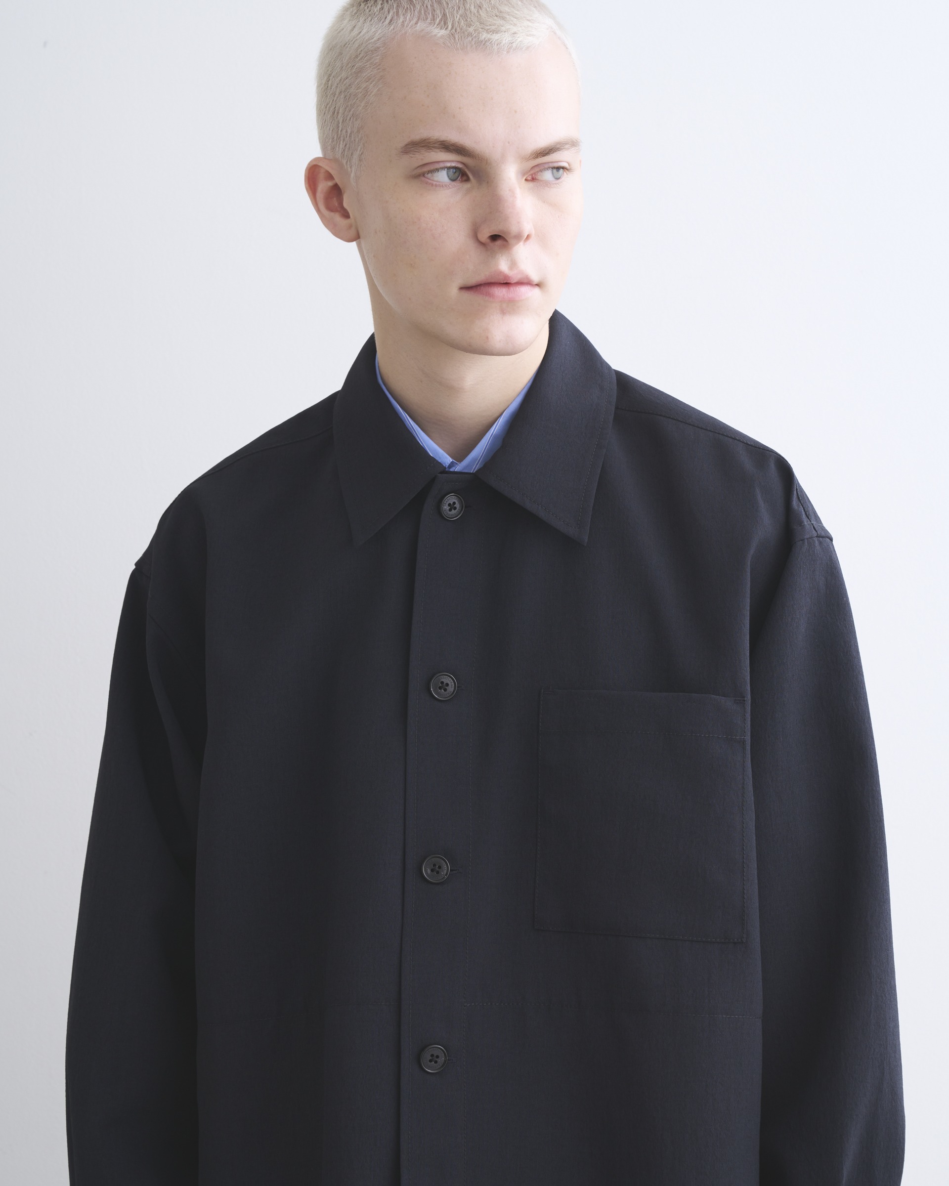 こちらのシャツ 001は、程よくドロップしたショルダーラインとボクシーなシルエットが魅力で、羽織りとしてもアウターのインナーとしても活躍する万能アイテムです。中が空洞のポリエステルの糸(中空糸)で丁寧に織られたPY素材製なので、きめ細やかで少し光沢のあるリュクスなムードがあって、さらさらした手触りで驚くほどの軽さが魅力。通気性も良く乾きやすい、快適な素材です。