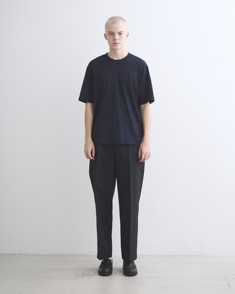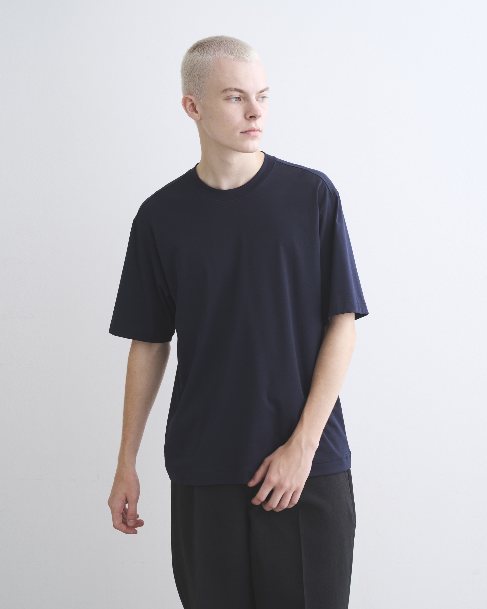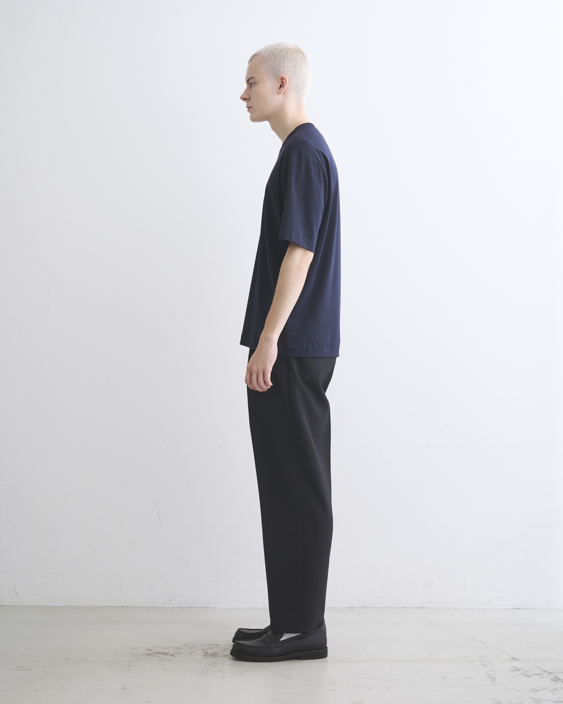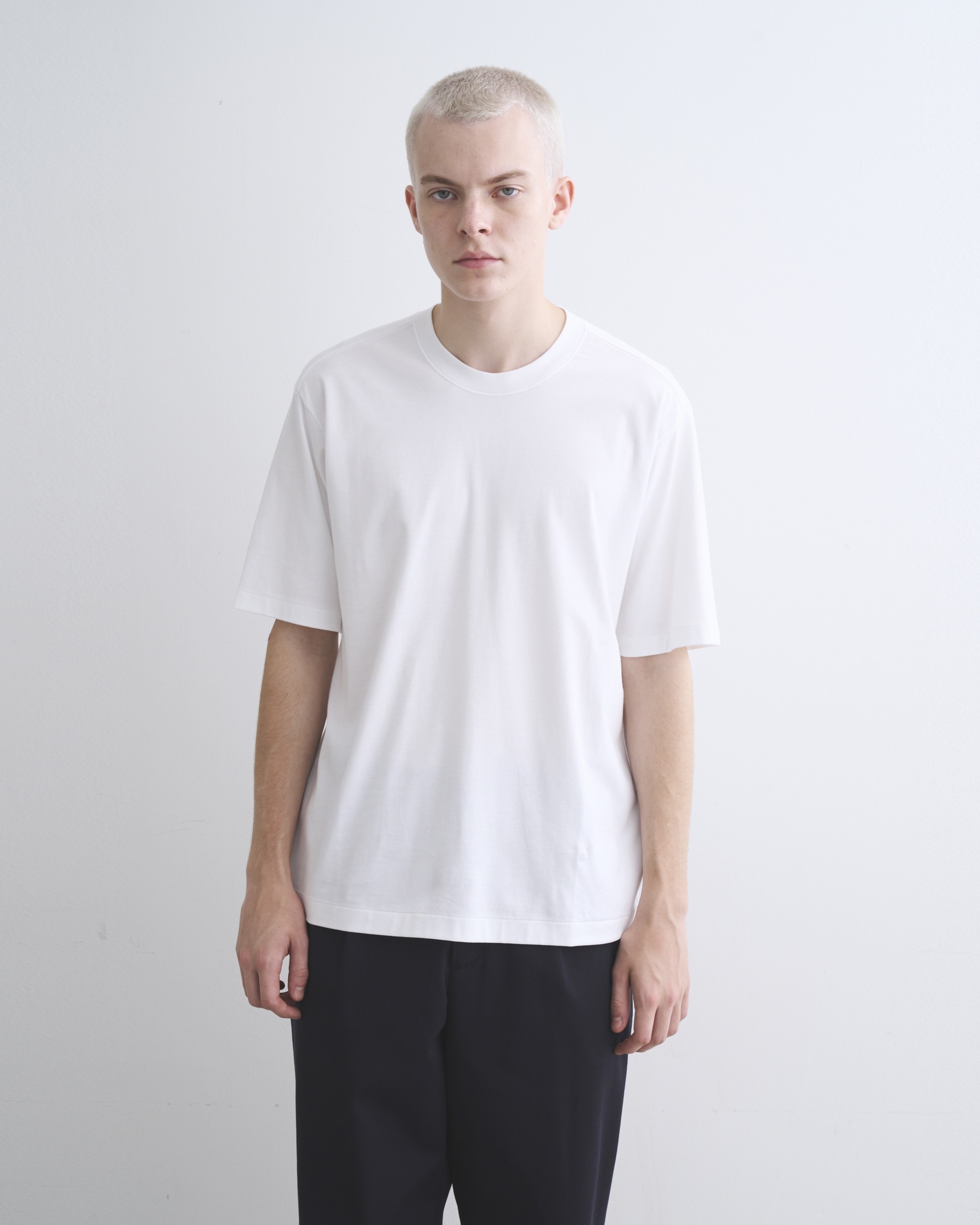 こちらのTEE 004は、すっきりとした身幅でありながらも程良く可動域があるスタンダードなシルエットです。カジュアルなデニムから、キレイ目なウールパンツまで、どんなパンツでもキマる、着る人を選ばない万能Tシャツです。水中で特別な起毛を施したコットン素材を採用しており、柔らかくしっとりした風合いが魅力で、インナーにもアウターにも活躍します。スムースと呼ばれる横に伸縮する編み方なので、レギュラーシルエットでも動きやすく、ストレス無く着用できる一着です。