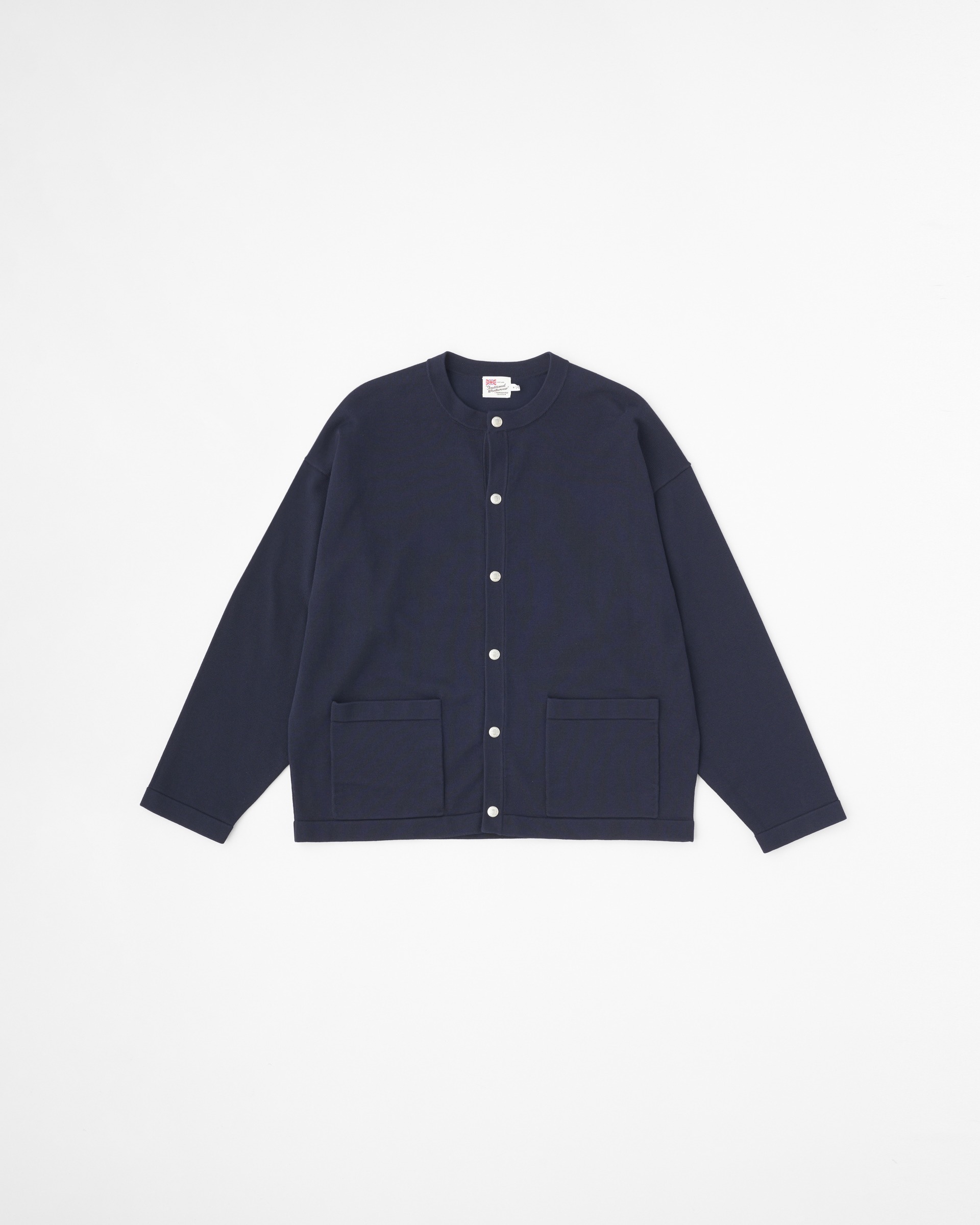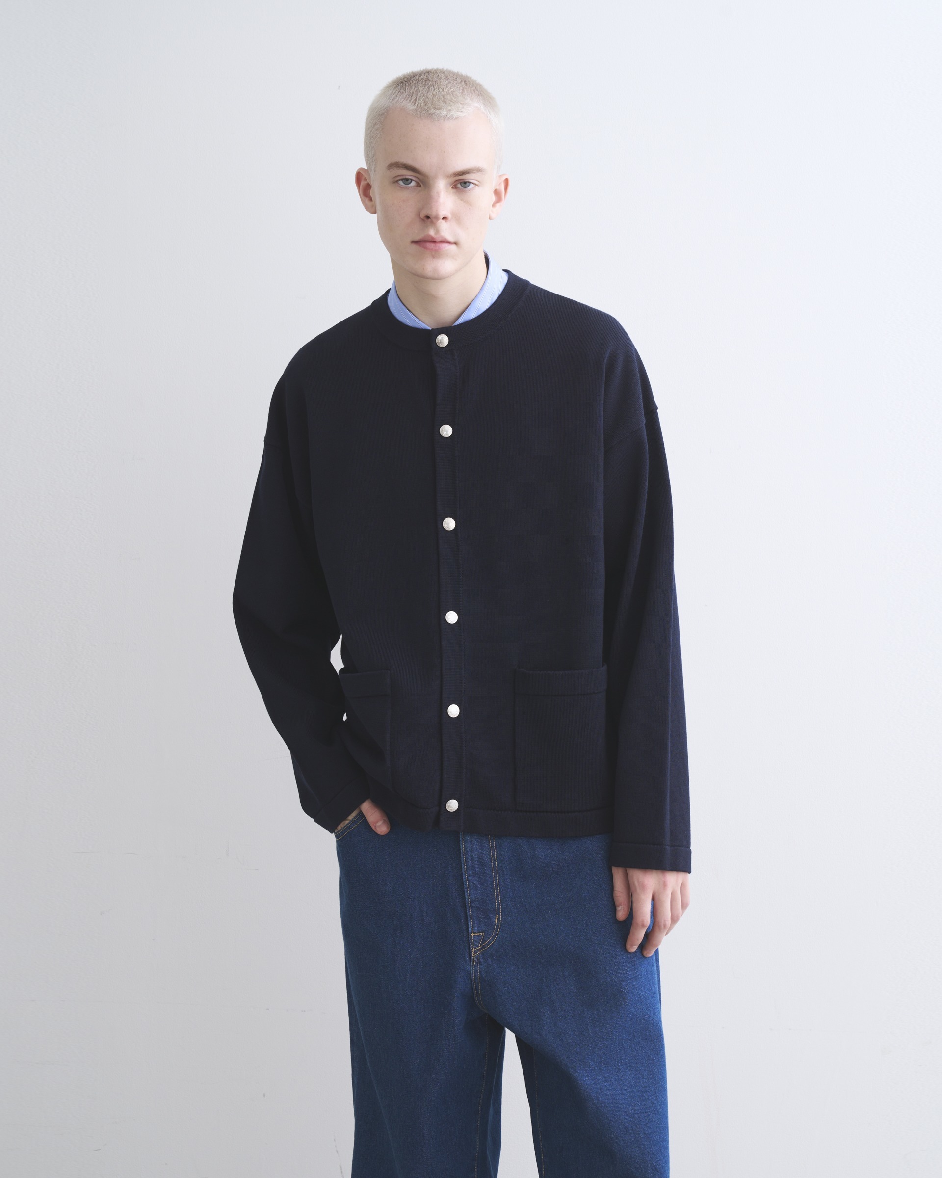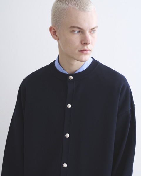 レディースで圧倒的な人気を誇る、アウター替わりにもなるベストセラーのクルーネックカーディガン、ARKLEY KNIT(アークリー ニット)のメンズフィッティングのモデル。