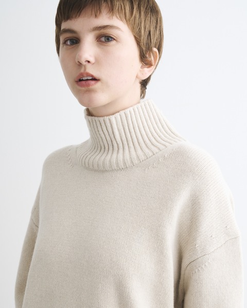 程よい着丈とゆったりとした優しいシルエットが特徴の、ミドルゲージのハイネックニット。 上質なラムウール糸を丁寧に編み上げたこちらのニットは、カジュアル感と上品さを兼ね備えた一着です。ゆったりめなボクシーシルエットが、クリーンで優しい印象です。 モデル身長:173cm