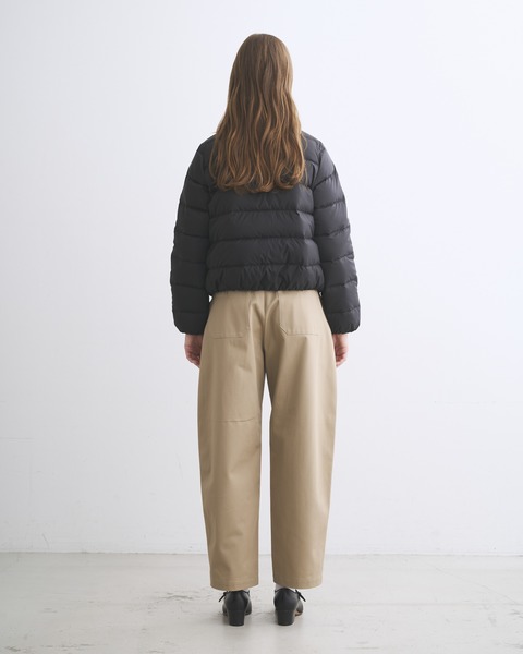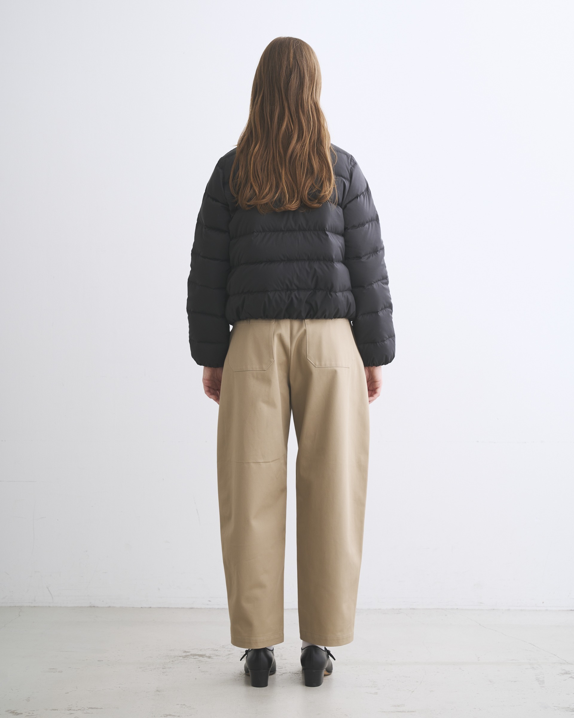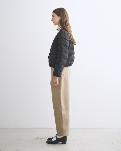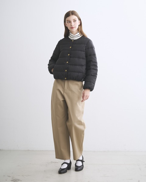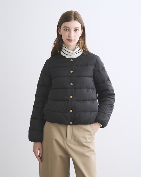 コンパクトなフォルムでアウターとしてはもちろん、真冬にはコートのインナーにも着用でき、ロングシーズン活躍します。高密度に織りあげた光沢のあるポリエステル素材。ノーカラーなのでマフラーやストールを巻いてももたつかず、すっきりとした首元に仕上がります。