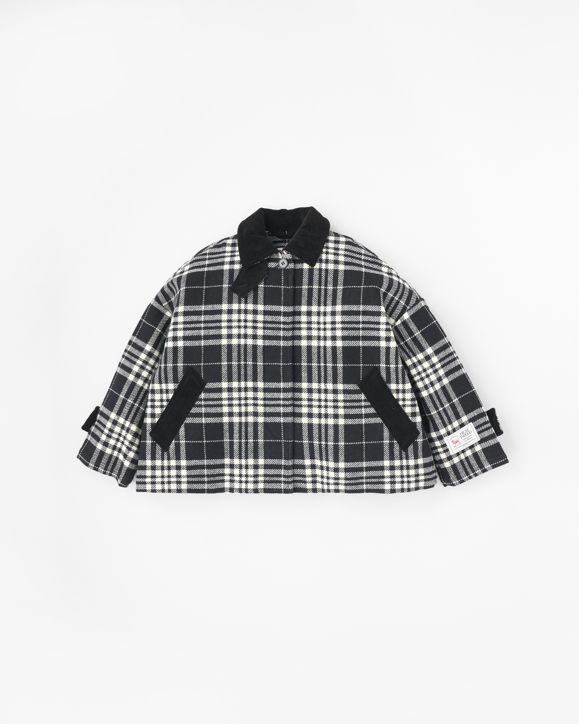 ブラック×アイボリーの大柄チェック(表地)×アイボリー(裏地)、ブラック(表地)×チャコール(裏地)、グレーヘリンボーン(表地)×ネイビー(裏地)、ブラウンヘリンボーン(表地)×グリーン(裏地)の4色展開です。