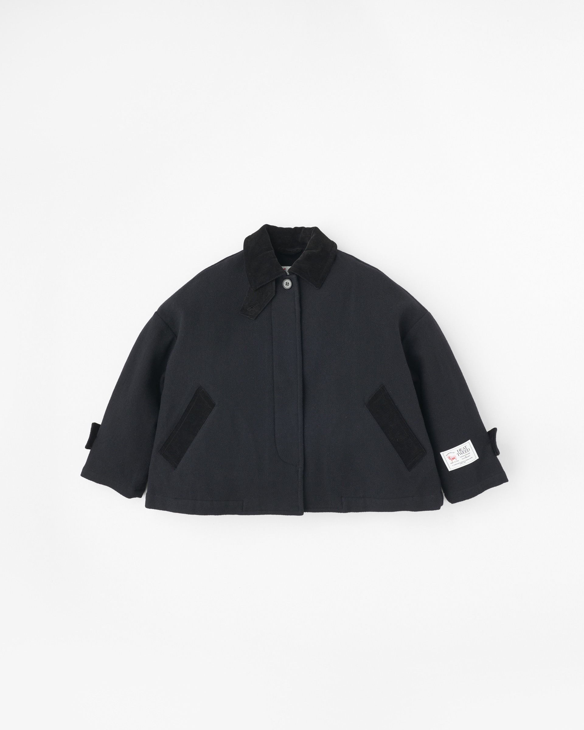こちらのヒートツィード製のマールトン ショートは、袖を通すと驚くほどの軽さで使い勝手が抜群です。ステンカラーコートのきちんと感がありながら、ゆったりとした優しいシルエットが魅力です。襟を立ててチンタブで両襟を留めると、ニュアンスをつけることが出来ます。