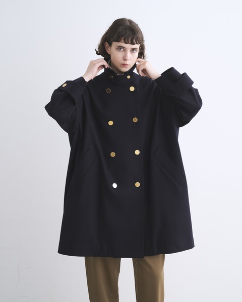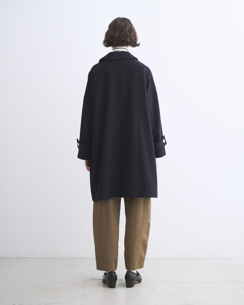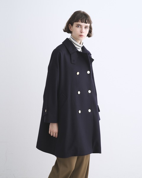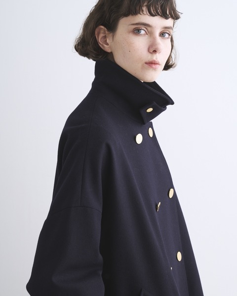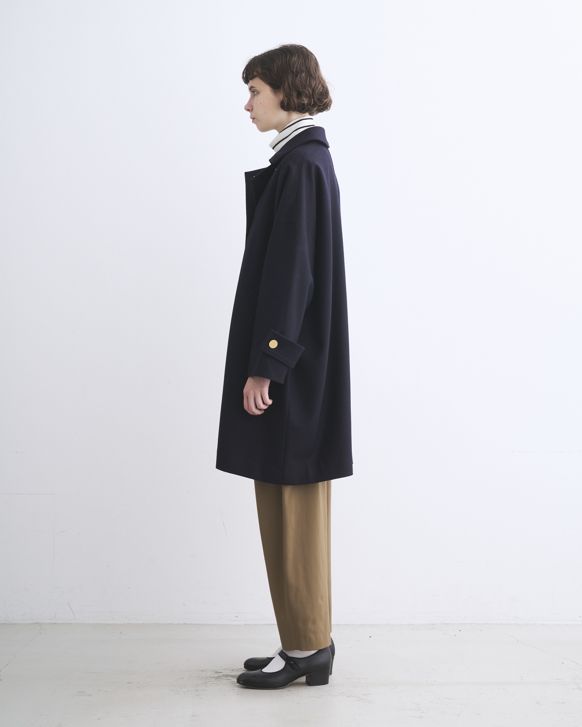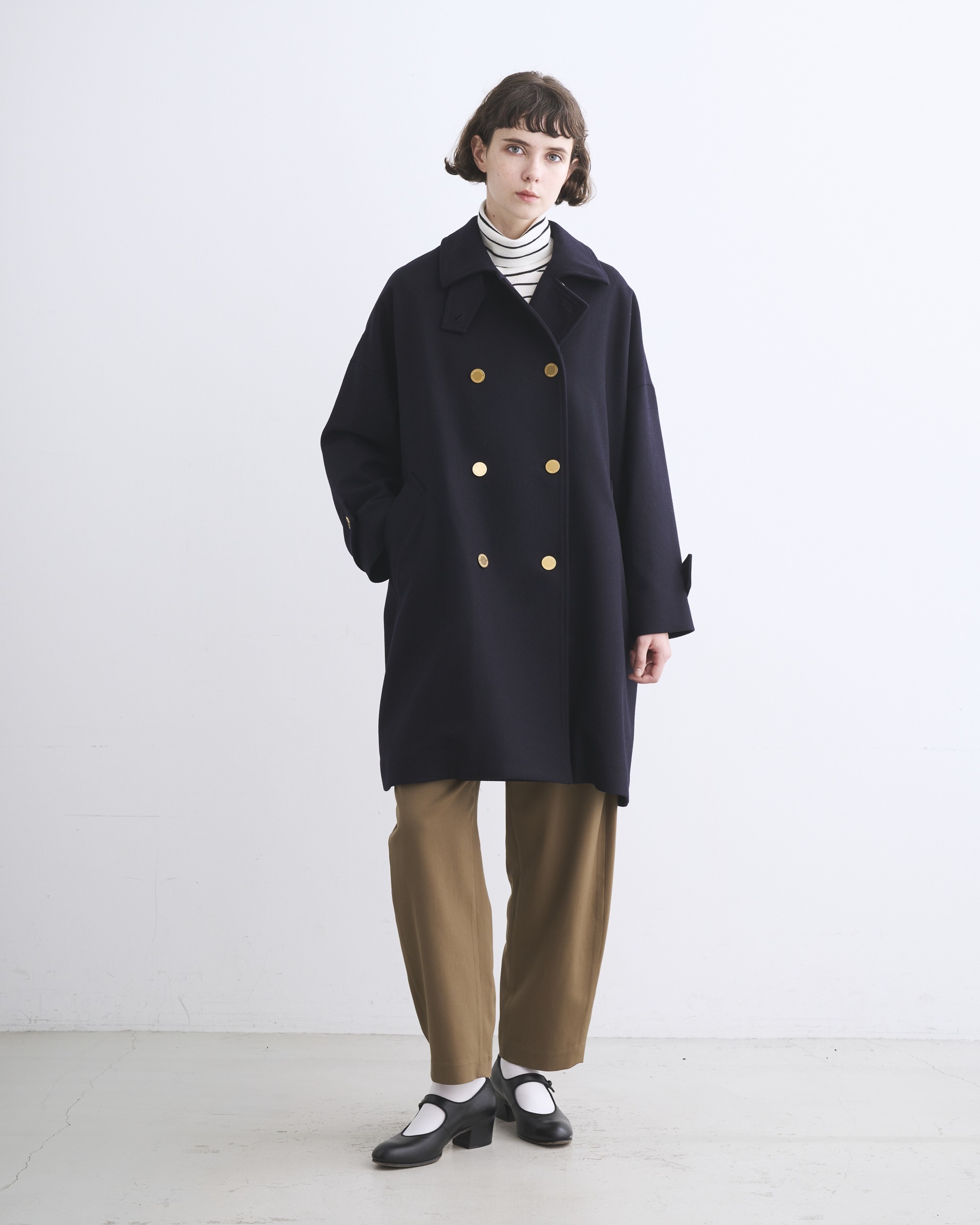 こちらの新モデルは、ゆったりとした優しいシルエットが魅力で、リュクスなドレス感のある装いから、カジュアルなデニムスタイルまで幅広く活躍する、着る人を選ばない万能コートです。フラットなゴールドに輝くボタンが、きりりと全体の印象を引き締めます。