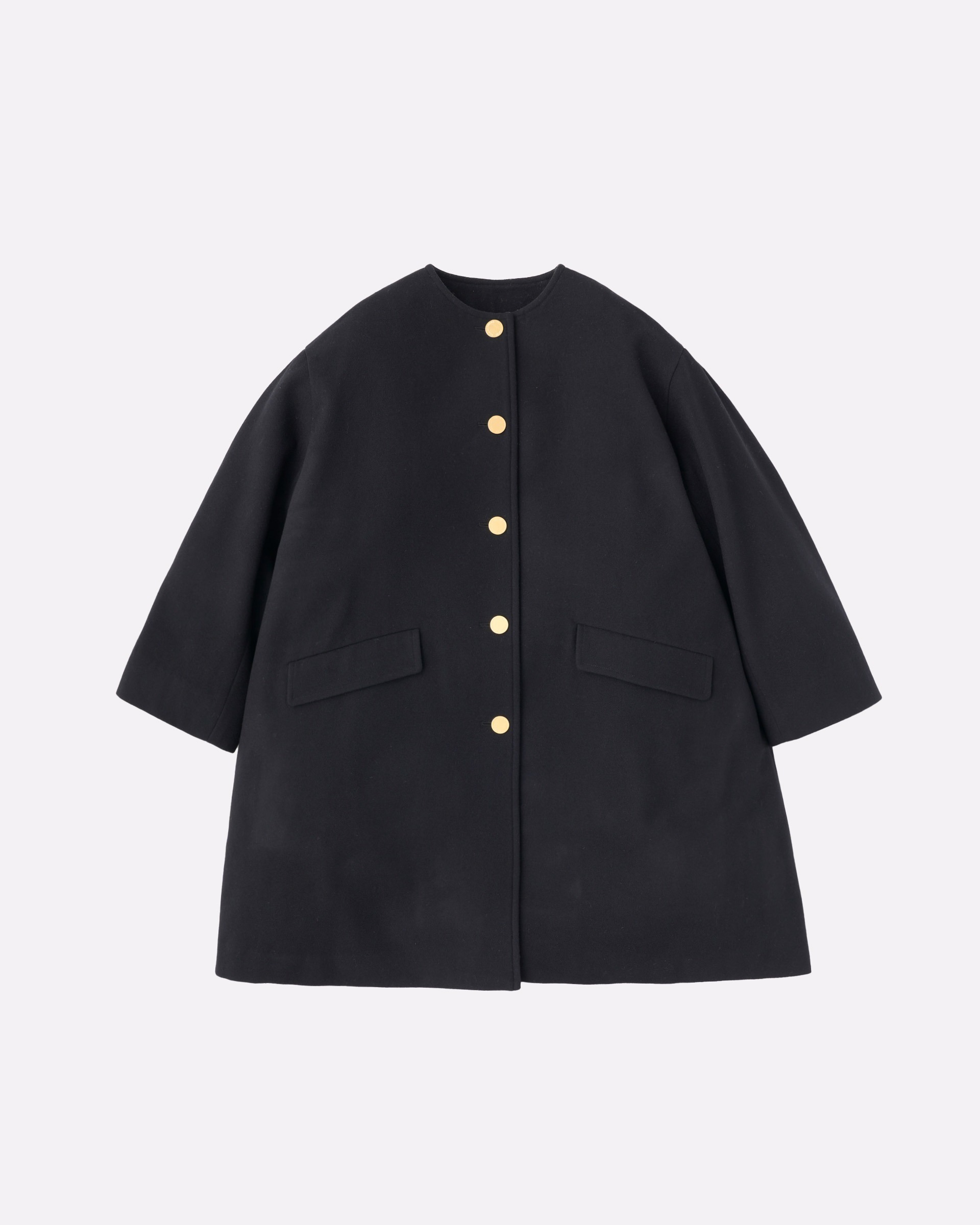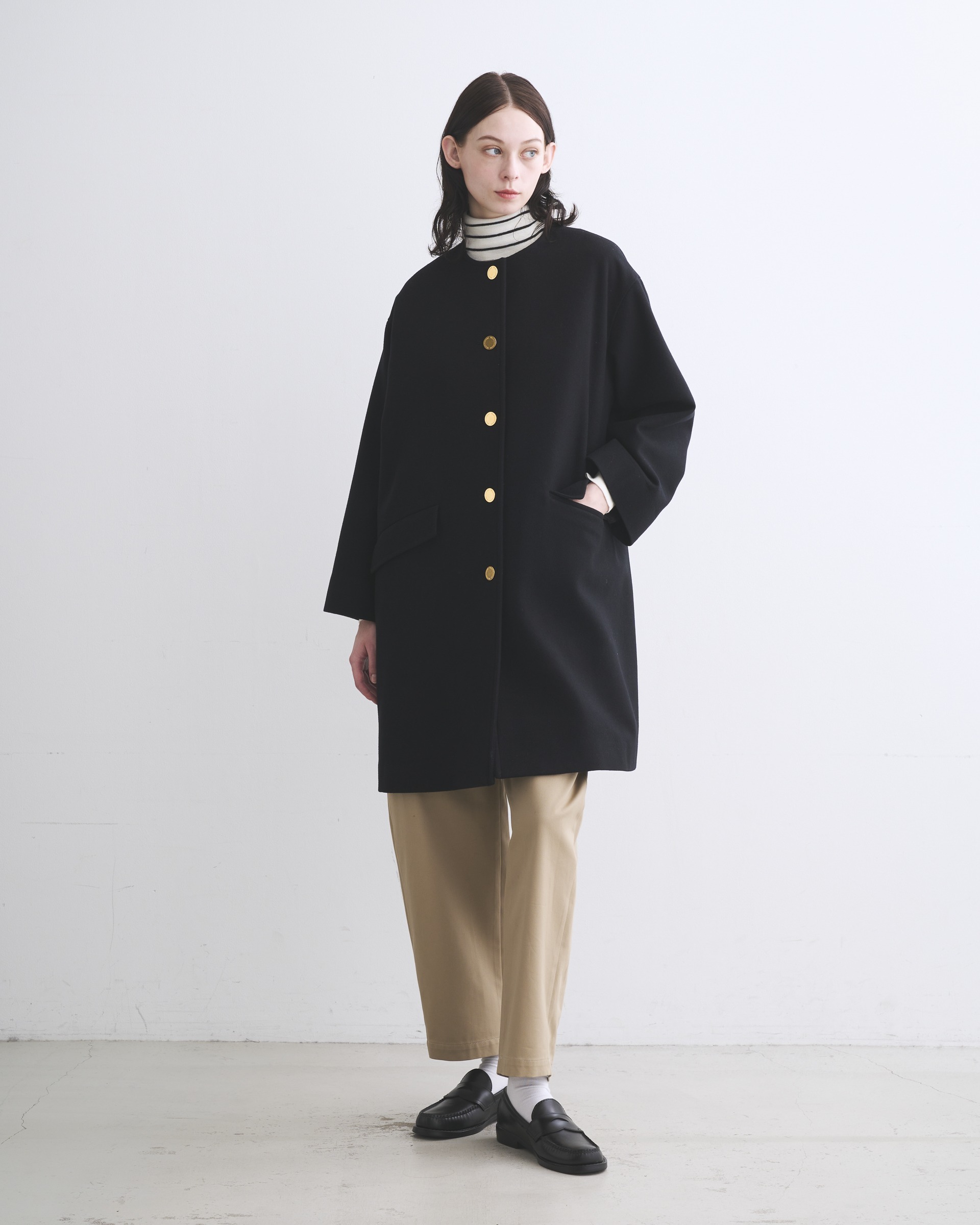 こちらのリントン ノーカラーは、身幅がゆったりとしているのに肩回りがすっきりしていて、エレガントさがありながらもモダンな印象を与える着る人を選ばない万能コートです。丁寧に織り上げたメルトン素材を使用しているのでハリと膨らみがあり、立体的なシルエットが際立ちます。フラップポケット付。