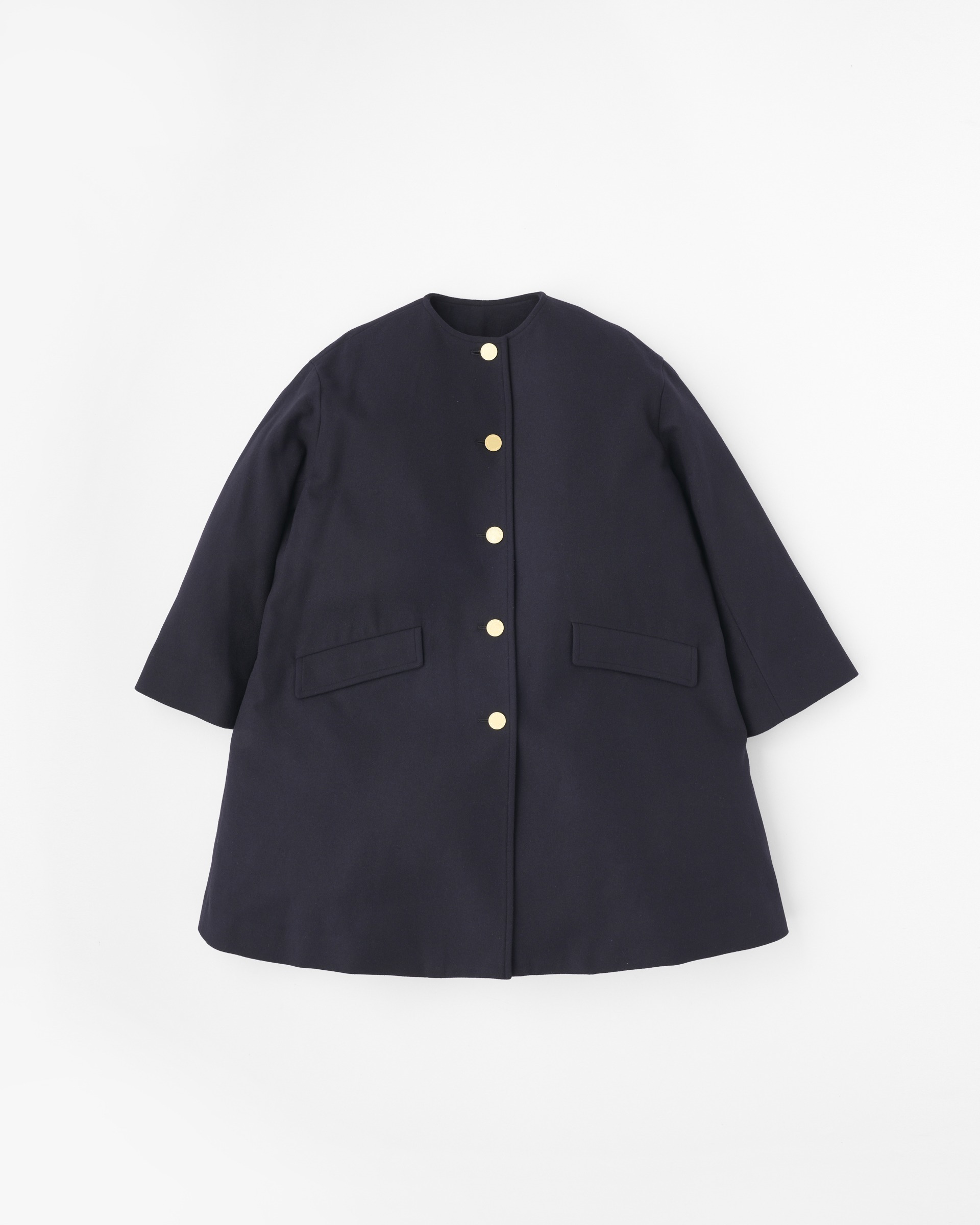 こちらのリントン ノーカラーは、身幅がゆったりとしているのに肩回りがすっきりしていて、エレガントさがありながらもモダンな印象を与える着る人を選ばない万能コートです。丁寧に織り上げたメルトン素材を使用しているのでハリと膨らみがあり、立体的なシルエットが際立ちます。フラップポケット付。