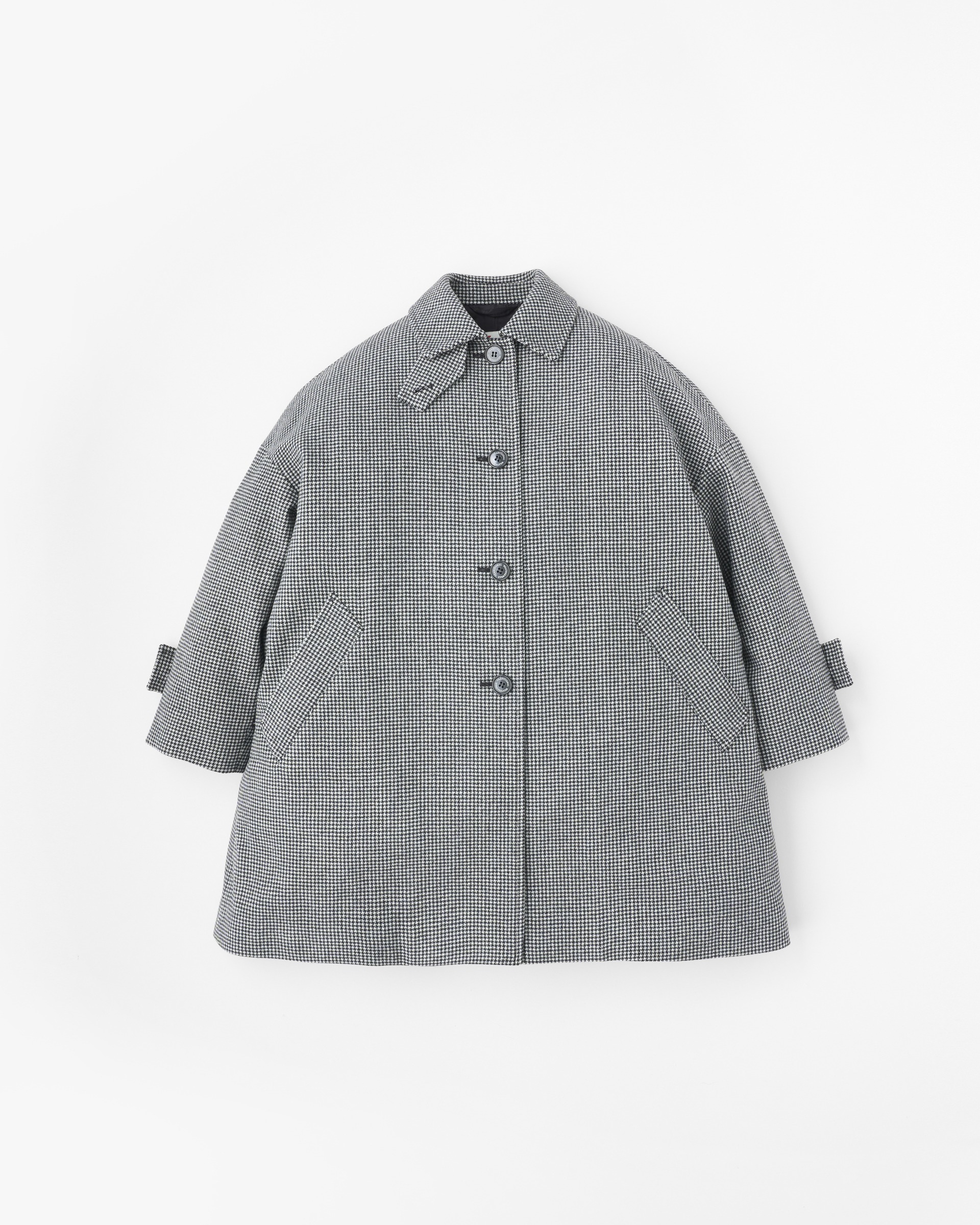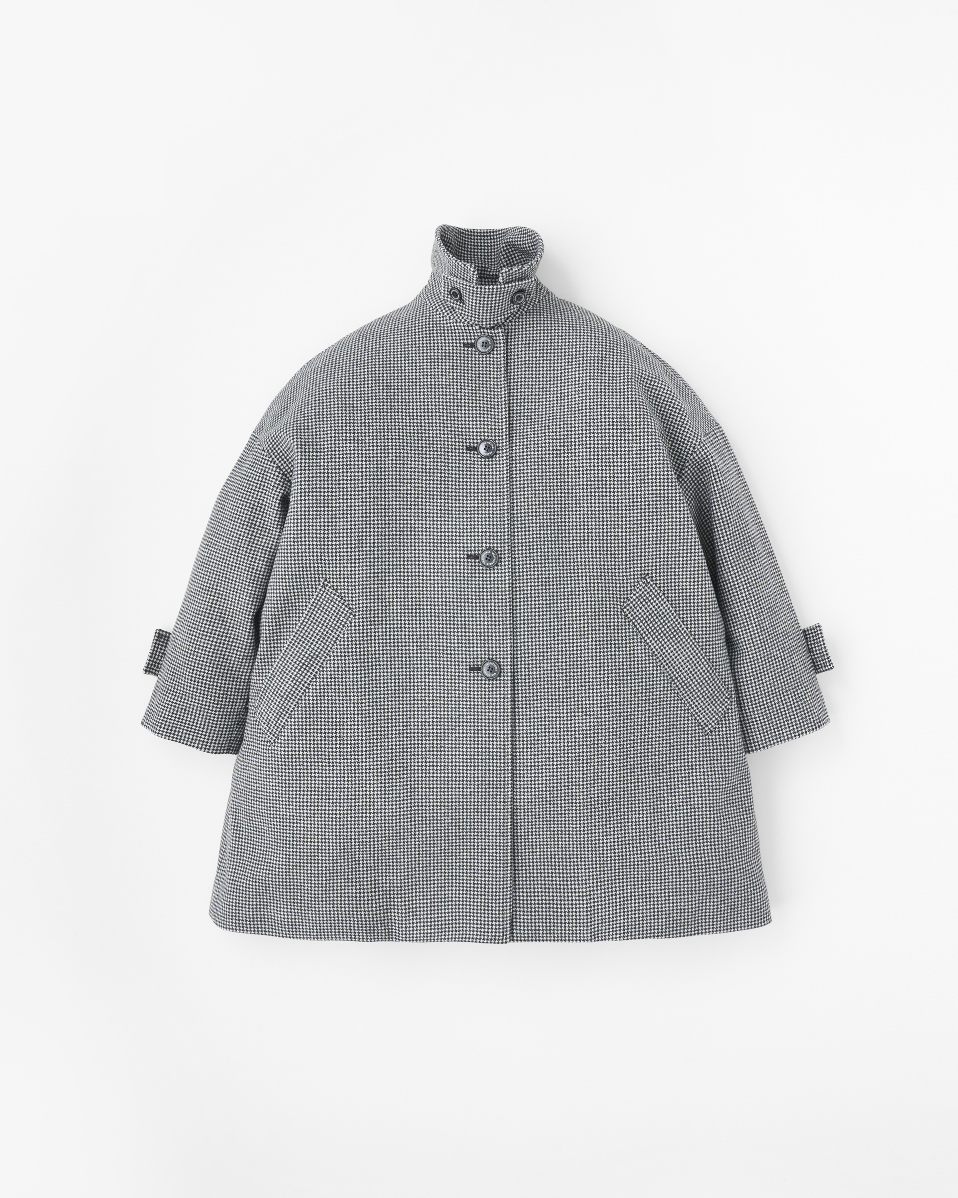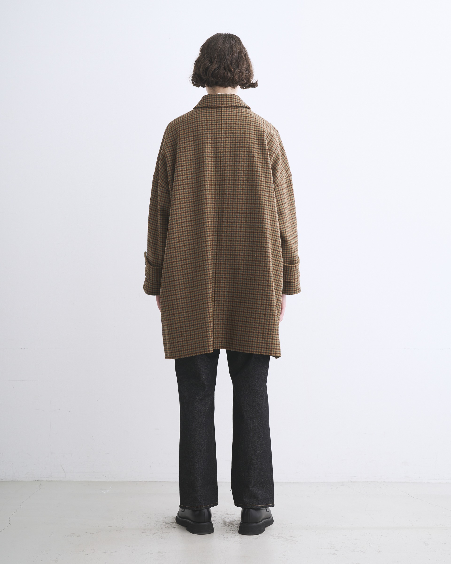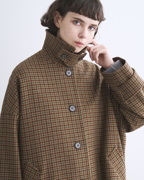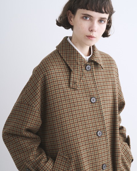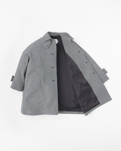ステンカラーコートのきちんと感がありながら、ゆったりとした優しいシルエットが魅力で、リュクスなドレス感のある装いから、カジュアルなデニムスタイルまで活躍する、着る人を選ばない万能コートです。こちらは程よいハリと膨らみが特長のメルトン製なので、立体的なシルエットが際立ちます。襟を立ててチンタブで両襟を留めると、キリっとした印象に。