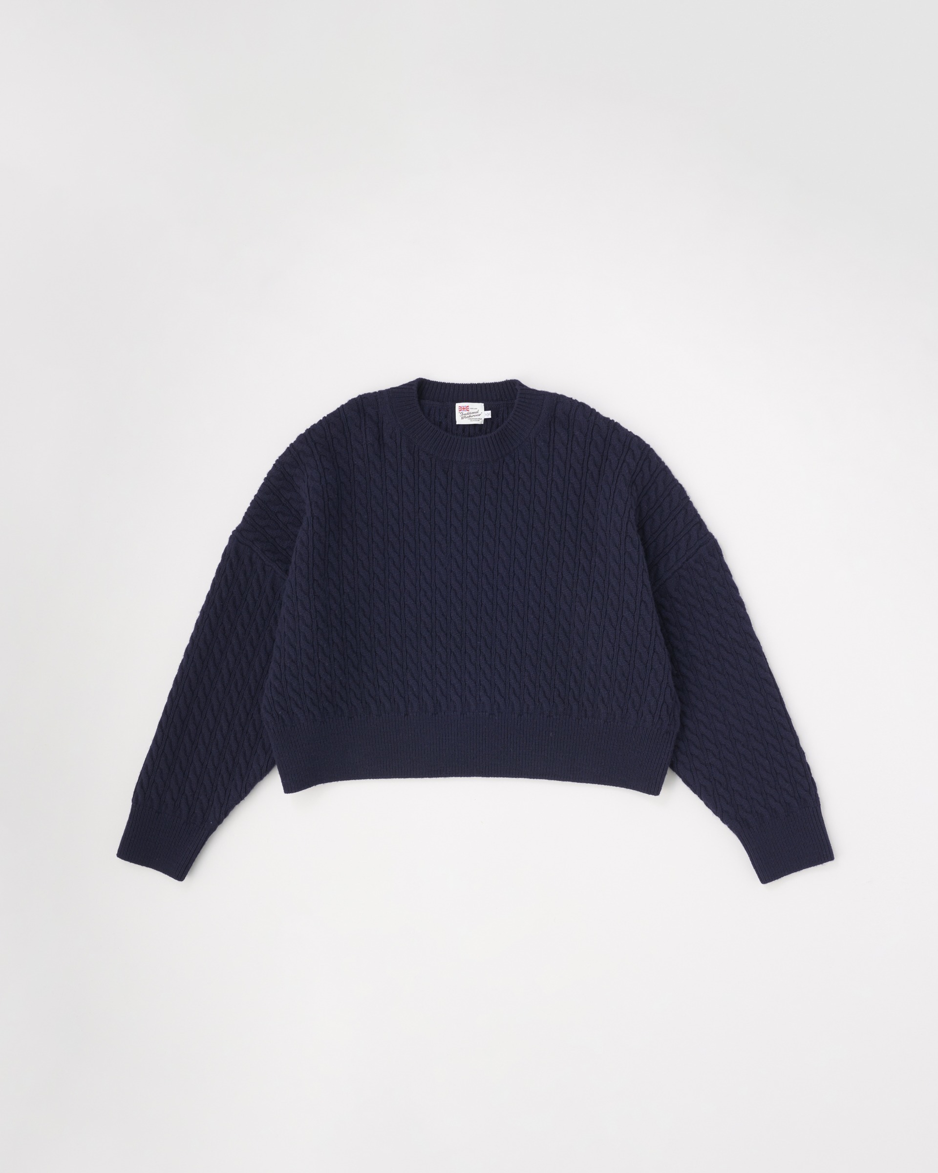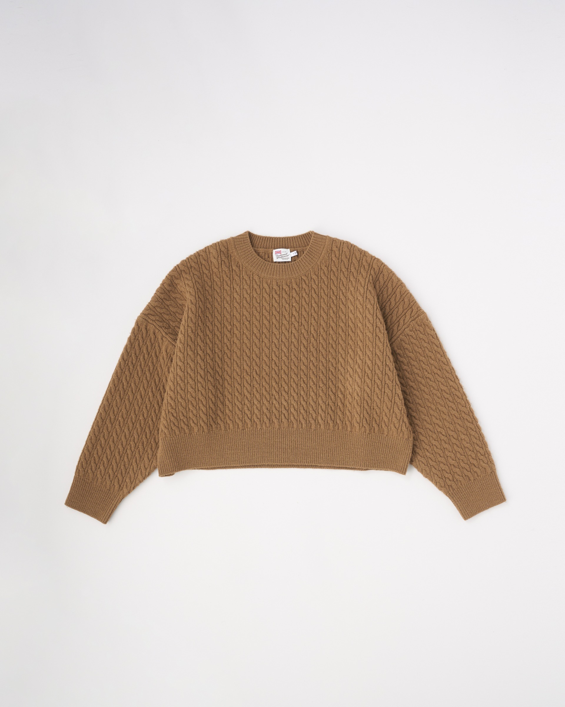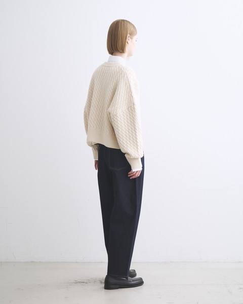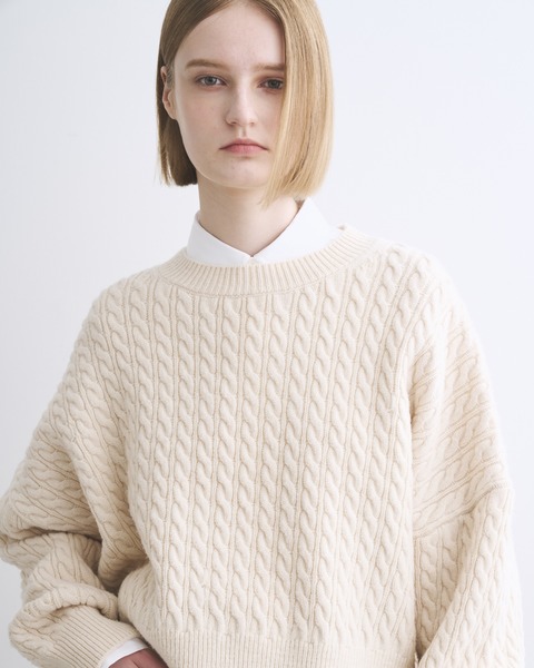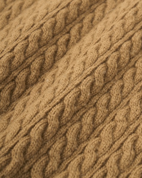 温かみのある上質なメリノウールの糸を丁寧に編み上げたこちらのニットは、立体感のあるケーブルの編地と、奇麗な発色が特長。度目が詰まっていてしっかりとしたハリがあるので、立体的なシルエットが際立ちます。