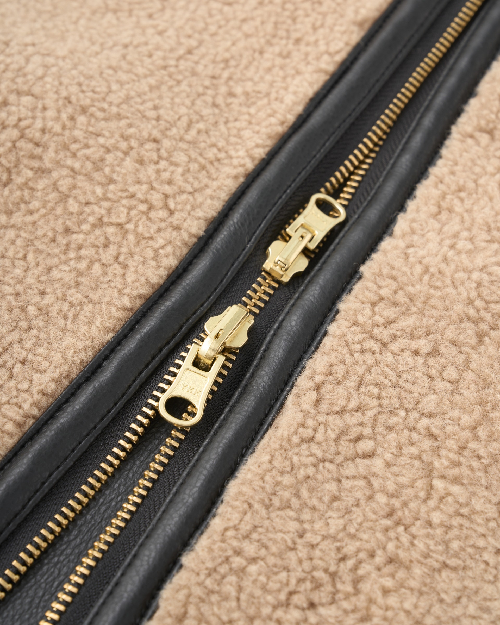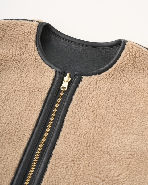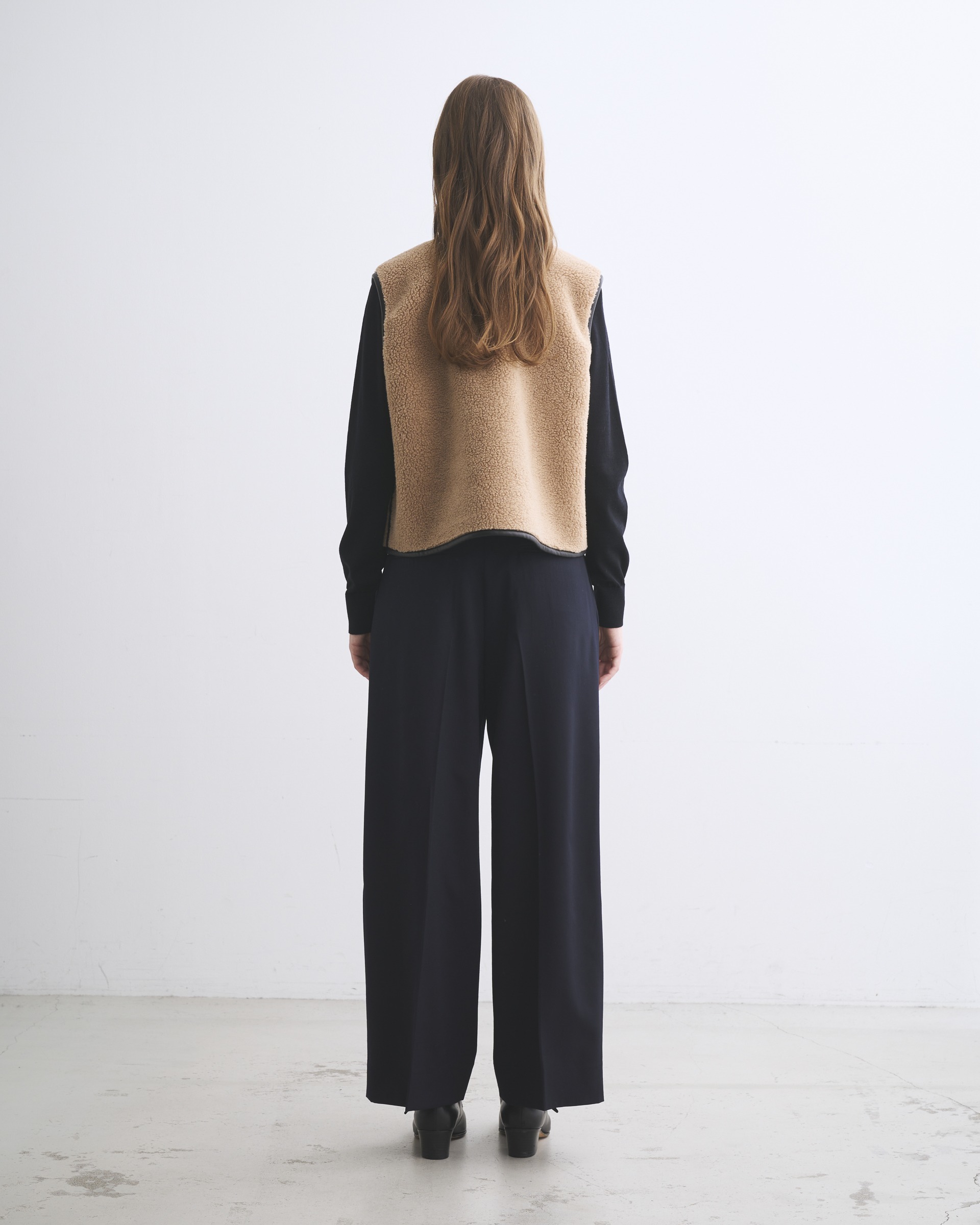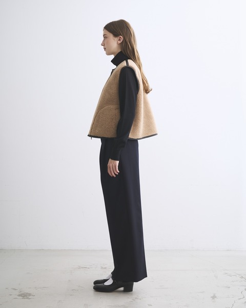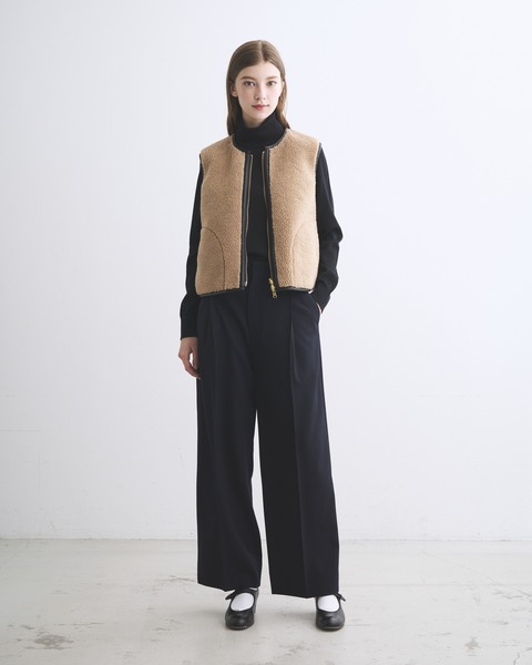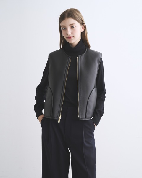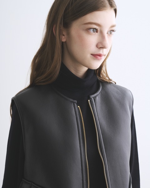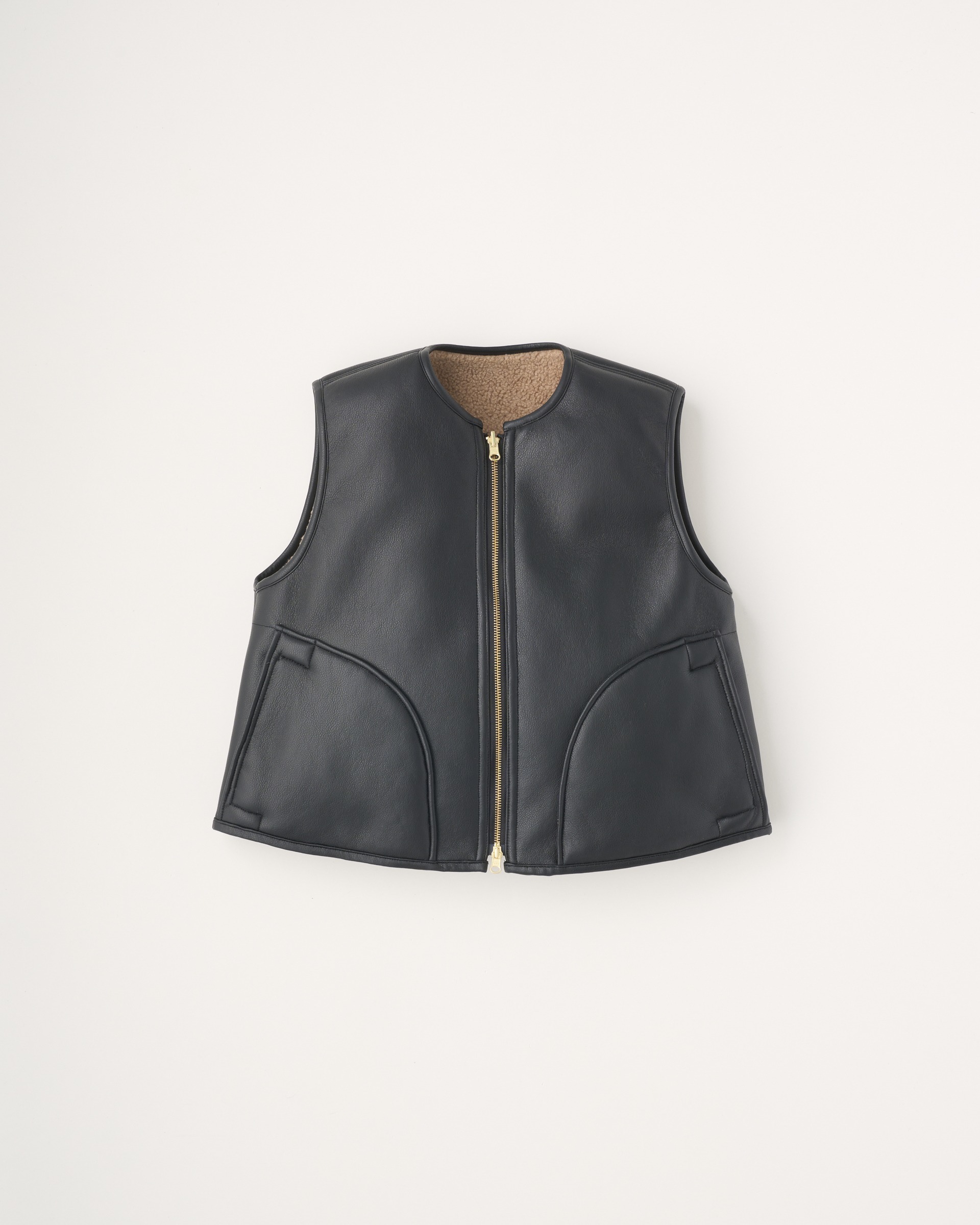 表面は天然のファーのようなリュクスで暖かみのあるエコファー素材を使用したボアベスト、裏面はしっとりとした肌触りの合成皮革を使用したライダースベスト、という両A面が魅力の万能アイテムです。程よくドロップしたショルダーラインで、抜け感のある少しAラインのシルエットが魅力。エレガントな装いから、カジュアルなデニムスタイルまで幅広いシーンで活躍します。