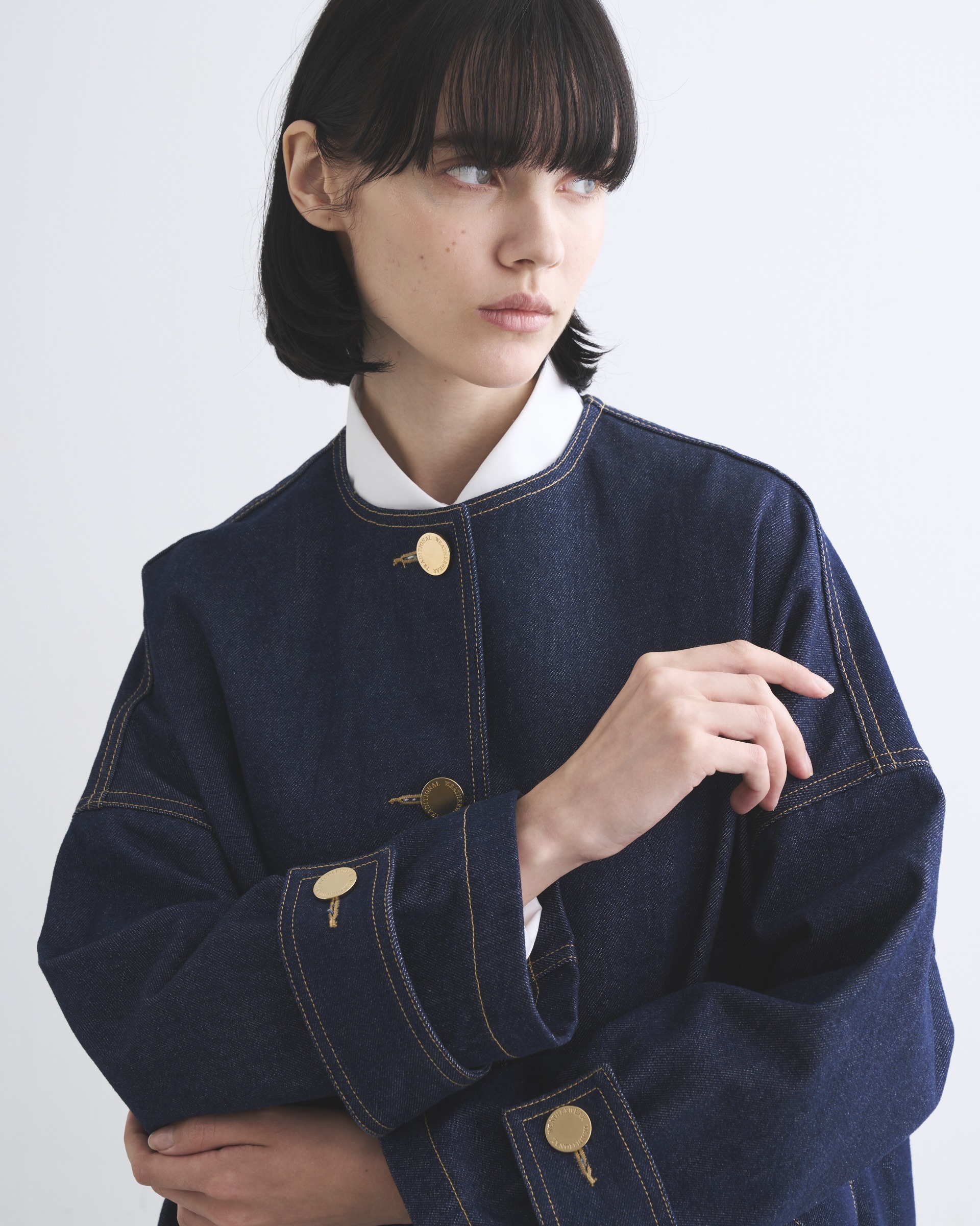繊細なブリーチ加工を施したデニム素材は、程よいハリが特長で、立体的な美しいシルエットが際立ちます。フフラットなゴールドに輝くボタンが、きりりと全体の印象を引き締めます。