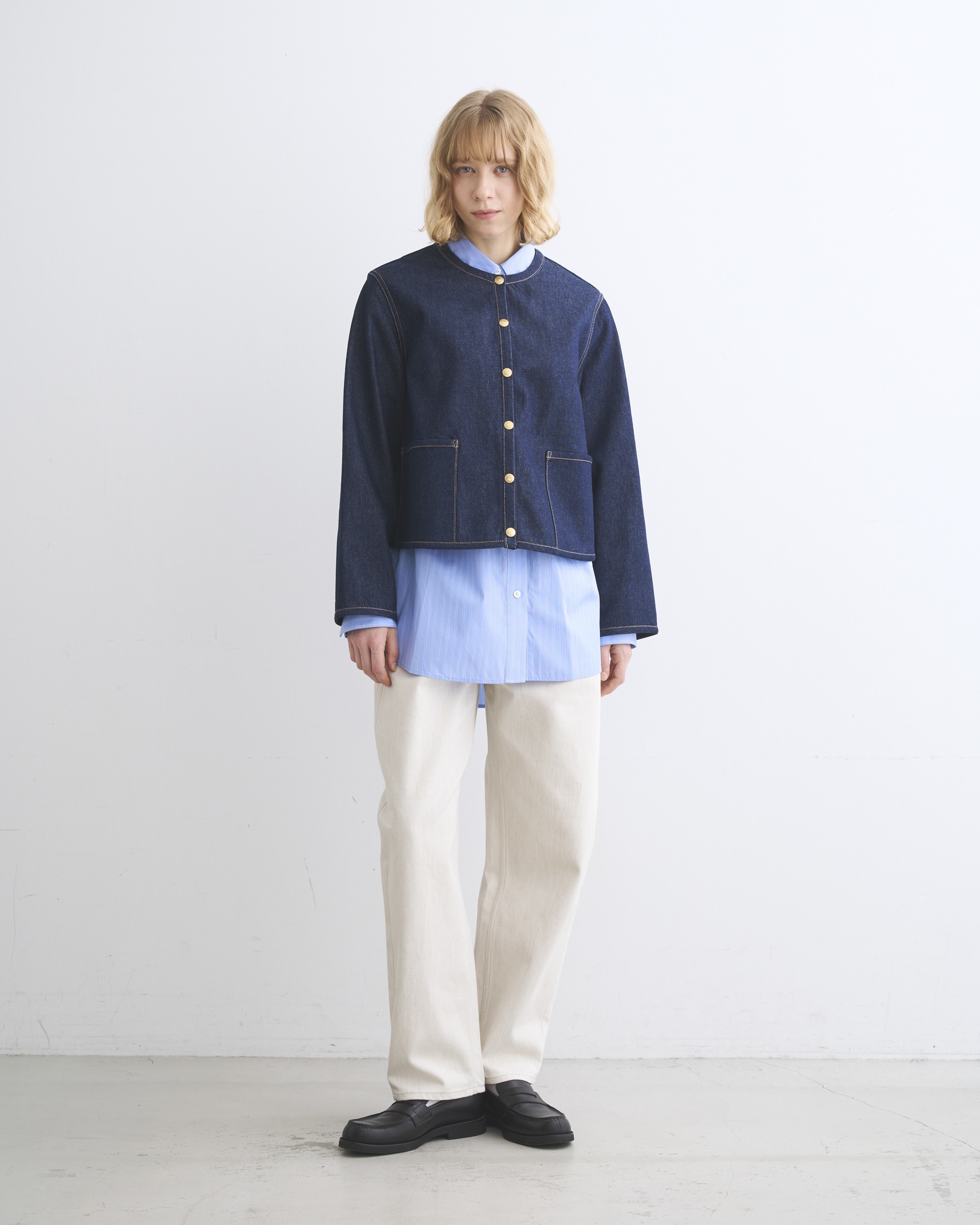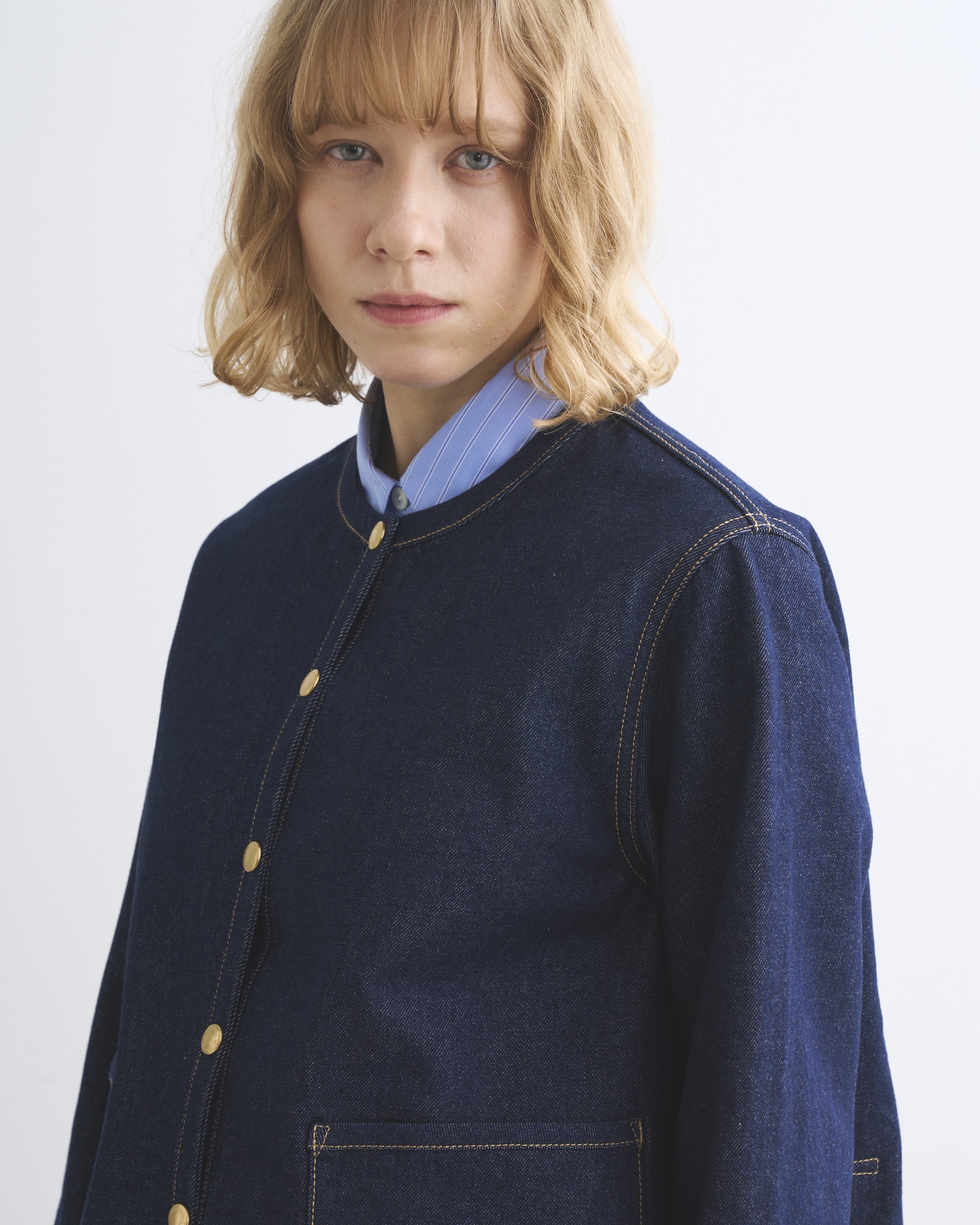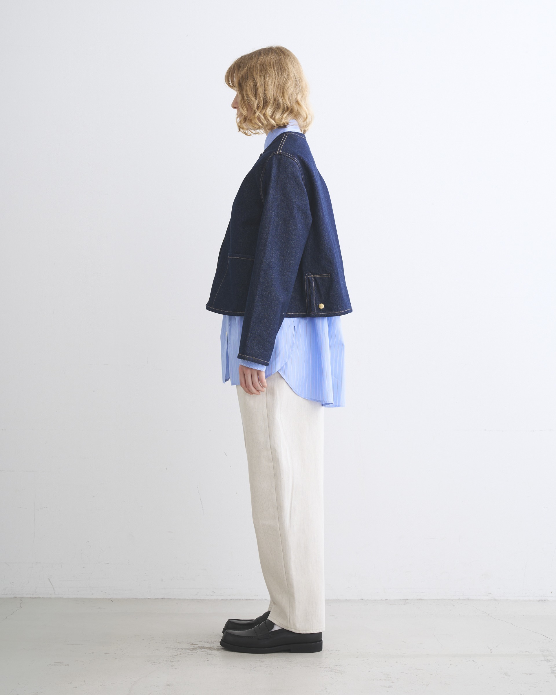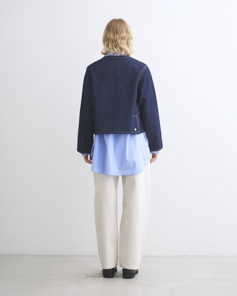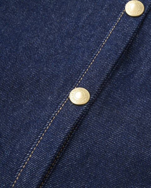 こちらのワンウォッシュデニム素材は、程よいハリが特長で、立体的な美しいシルエットが際立ちます。生地の状態でワンウォッシュしてから縫製しているので、あたりが少なくクリーンな印象に。ゴールドに輝くドットボタンがきりりと全体の印象を引き締めます。