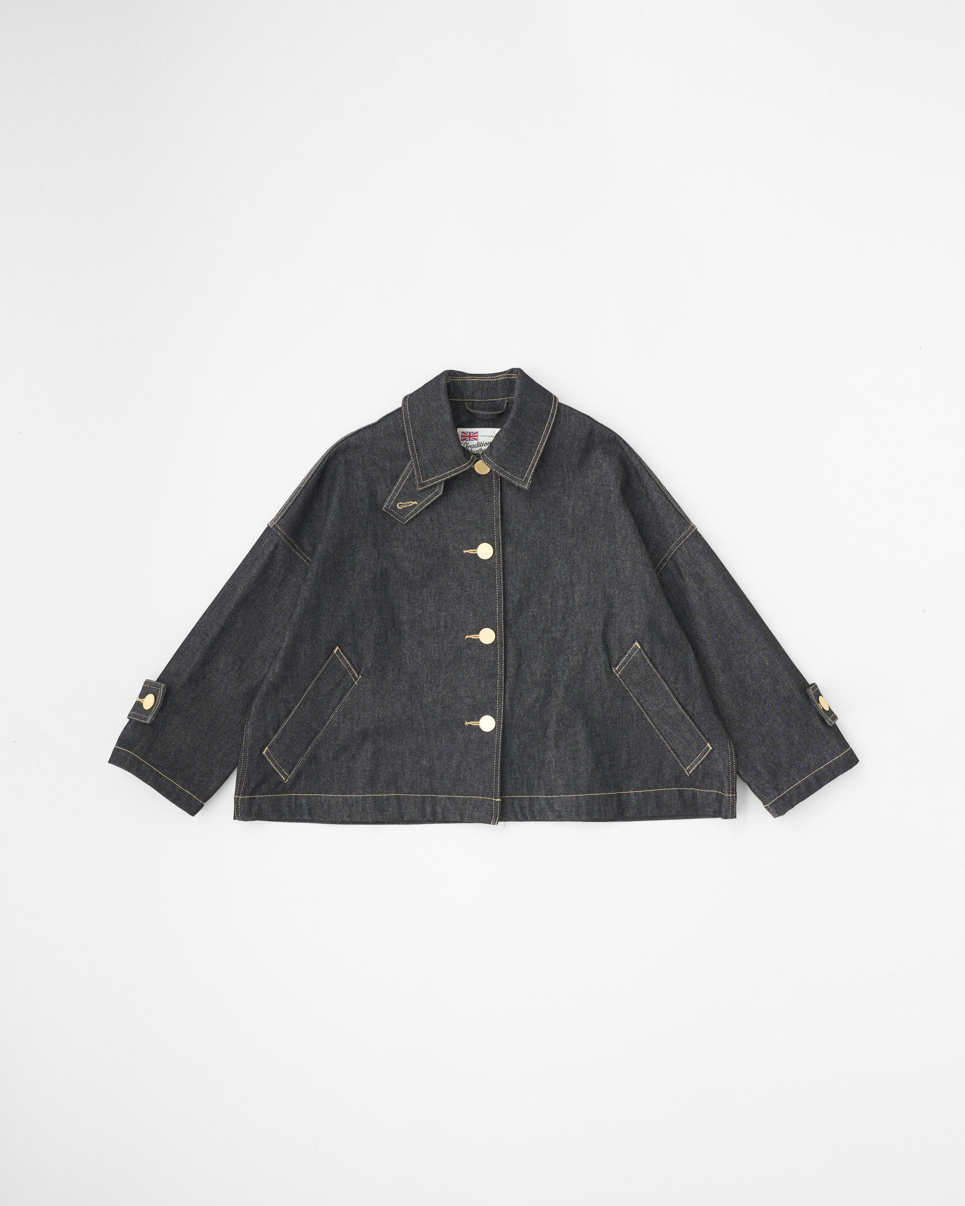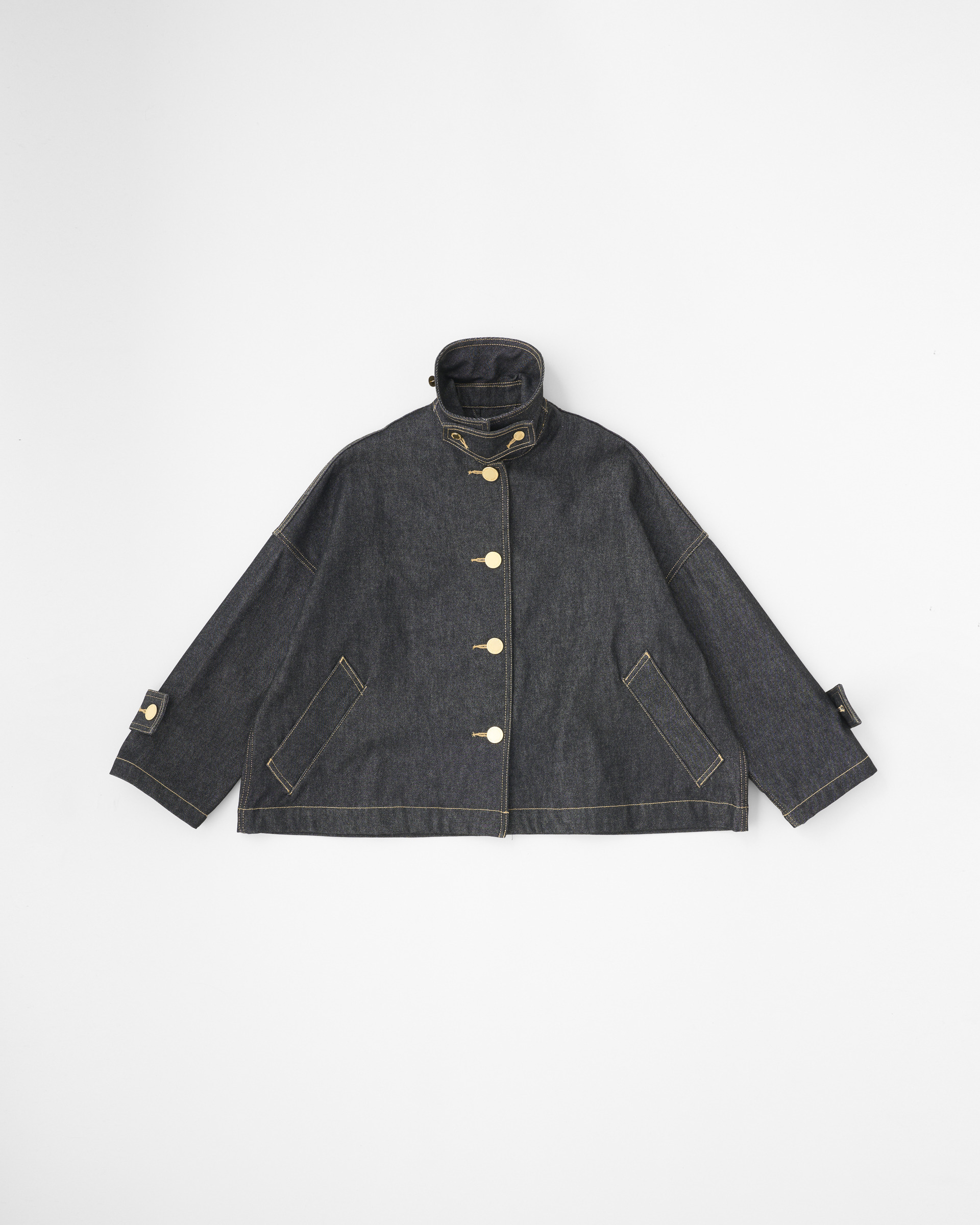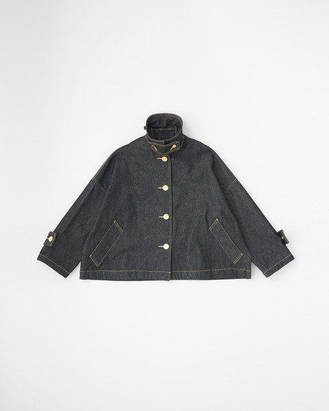 生地の状態でワンウォッシュしてから縫製しているので、あたりが少なくクリーンな印象に。程よいハリが特長のデニム素材製で、立体的な美しいシルエットが際立ちます。フラットなゴールドに輝くボタンが、きりりと全体の印象を引き締めます。