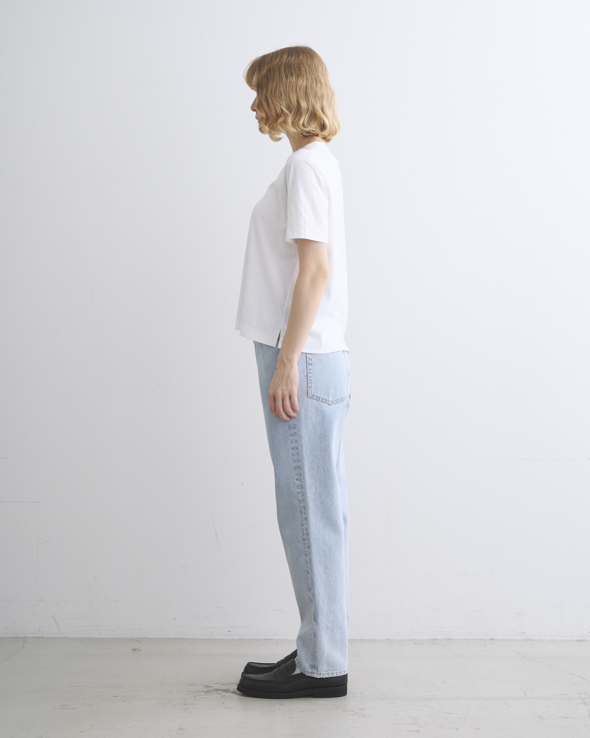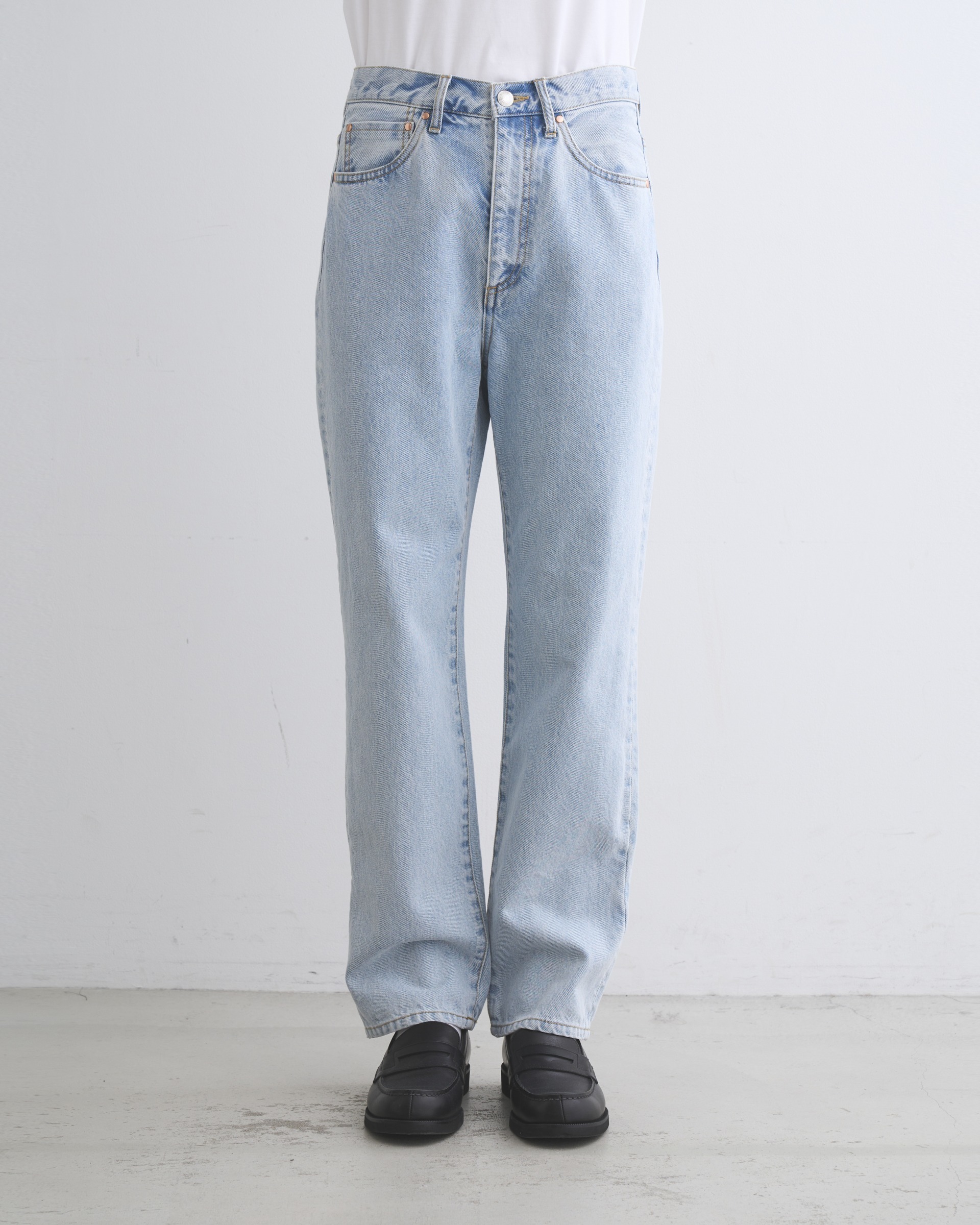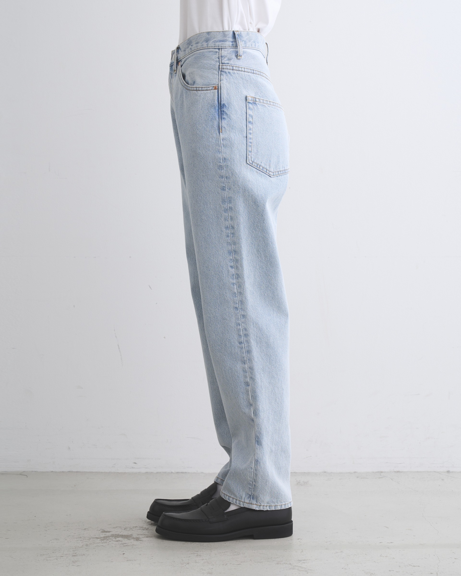 こちらの5ポケットデニムは、ヒップ下から裾にかけてまっすぐに落ちる美しいストレートラインが魅力です。繊細なブリーチ加工を施したデニム素材は、程よいハリが特長で、立体的な美しいシルエットが際立ちます。フロントのポケットに配した補強用のコッパーリベットがきらりと光ります。