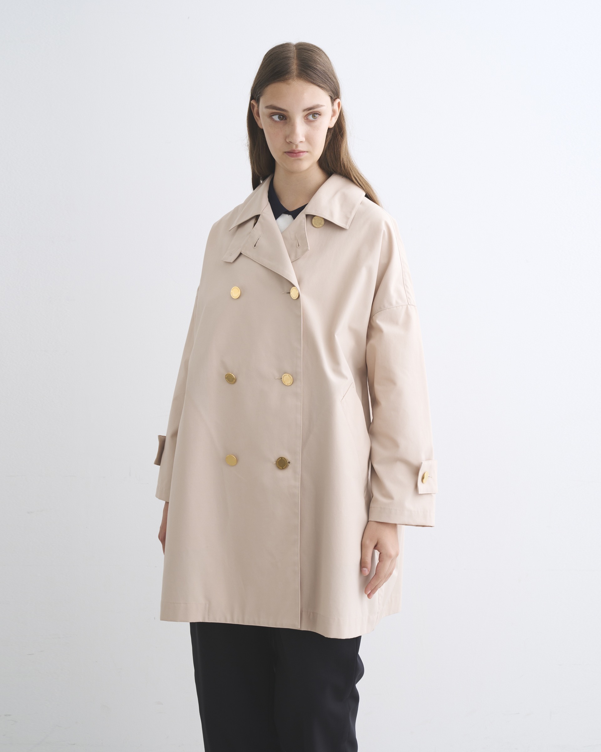 こちらのモデルは、ゆったりとした優しいシルエットが魅力で、リュクスなドレス感のある装いから、カジュアルなデニムスタイルまで幅広く活躍する、着る人を選ばない万能コートです。春夏シーズンのアウターウェアに欠かせない2大定番生地のひとつ、RO素材はしっかりとしたハリと光沢が特長で立体的なシルエットが際立ちます。フラットなゴールドに輝くボタンが、きりりと全体の印象を引き締めます。