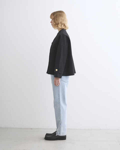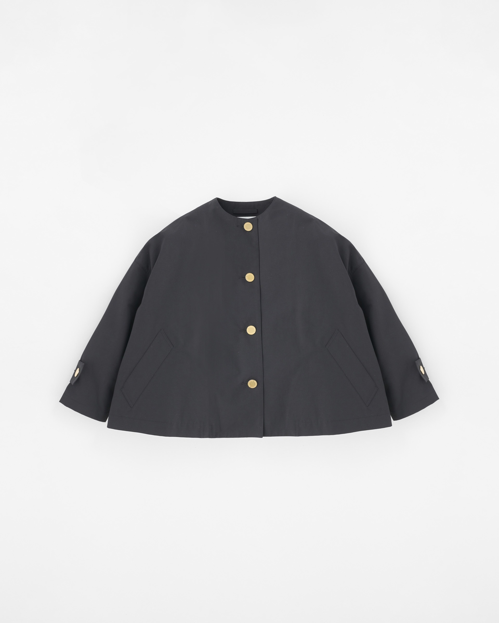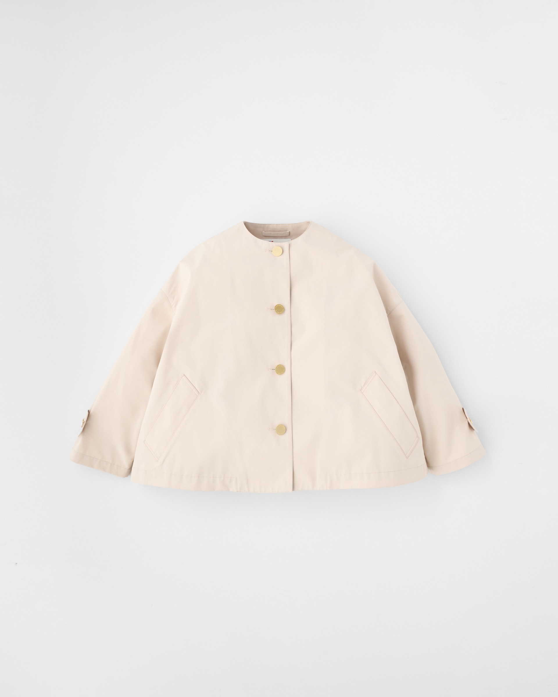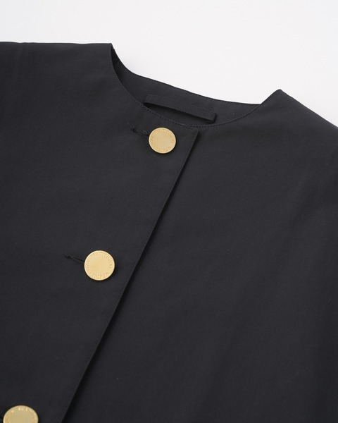こちらのモデルは、ベストセラーのマールトンノーカラーの雰囲気はそのままに、着丈が25cm程短くなった軽やかなショートコートで、ジャケット代わりにも活躍し、ジュアルなデニムからフェミニンなスカートまで幅広いボトムスと相性が良い万能アイテムです。春夏シーズンのアウターウェアに欠かせない2大定番生地のひとつ、RO素材はしっかりとしたハリと光沢が特長で立体的なシルエットが際立ちます。フラットなゴールド(シルバー)に輝くボタンが、きりりと全体の印象を引き締めます。