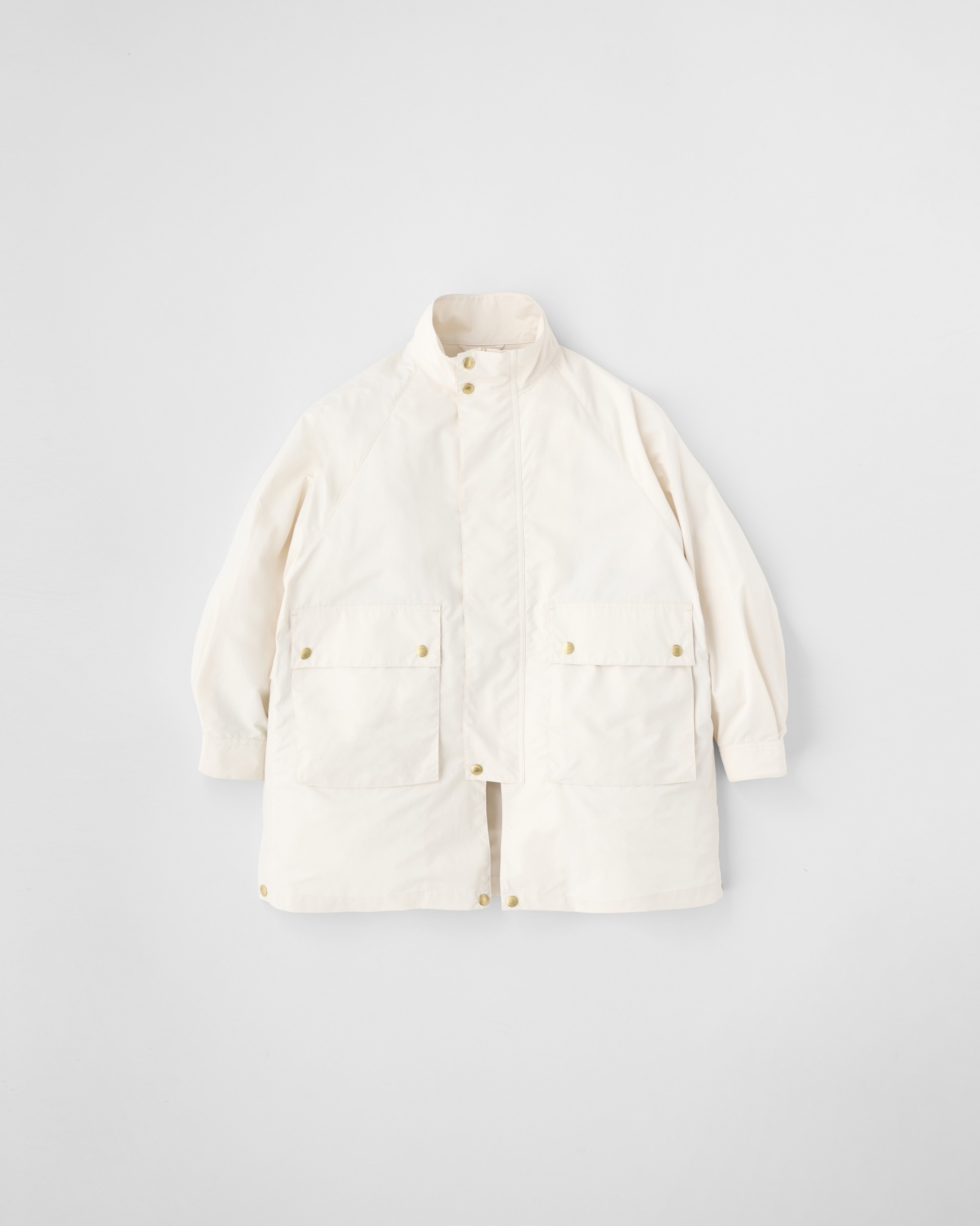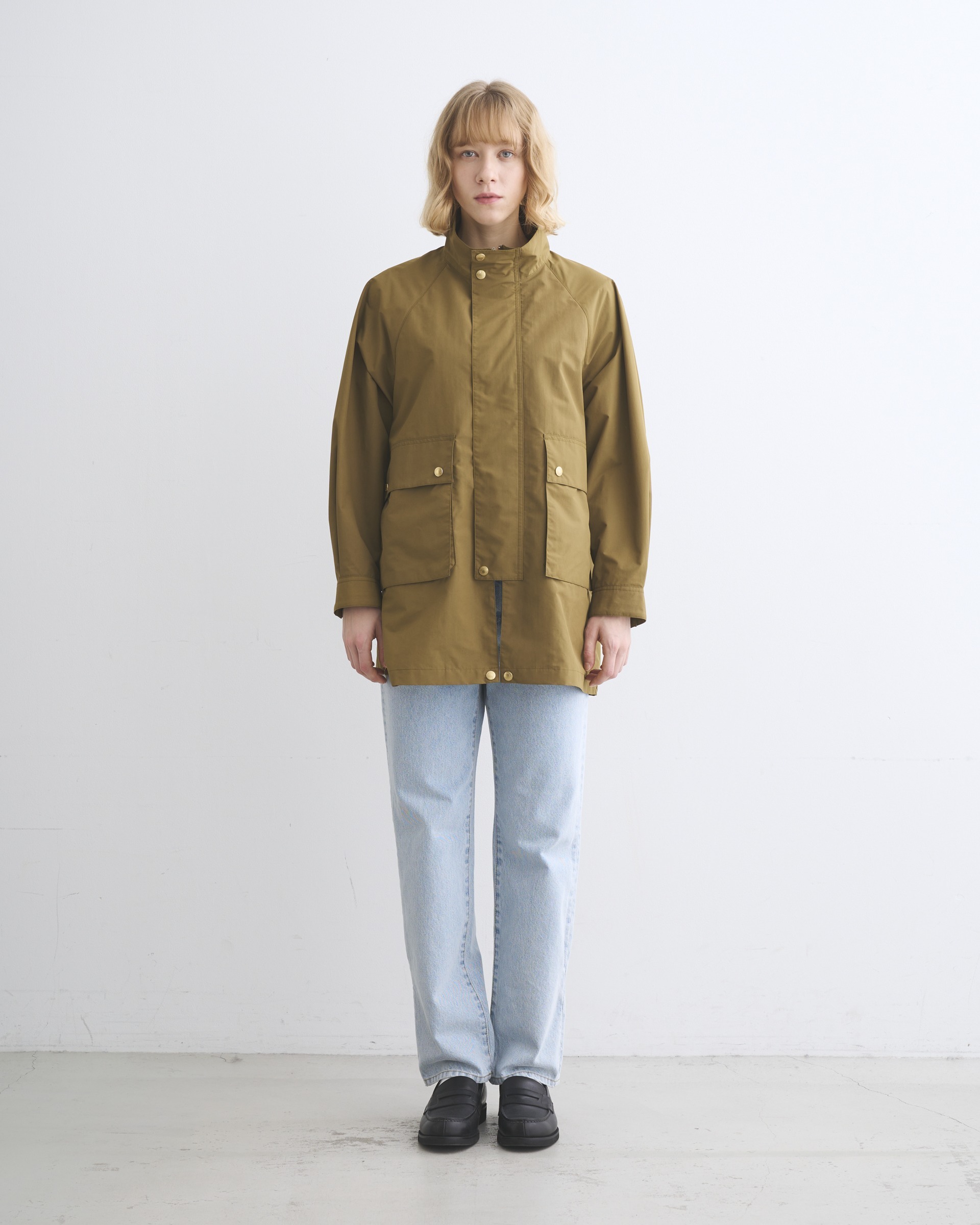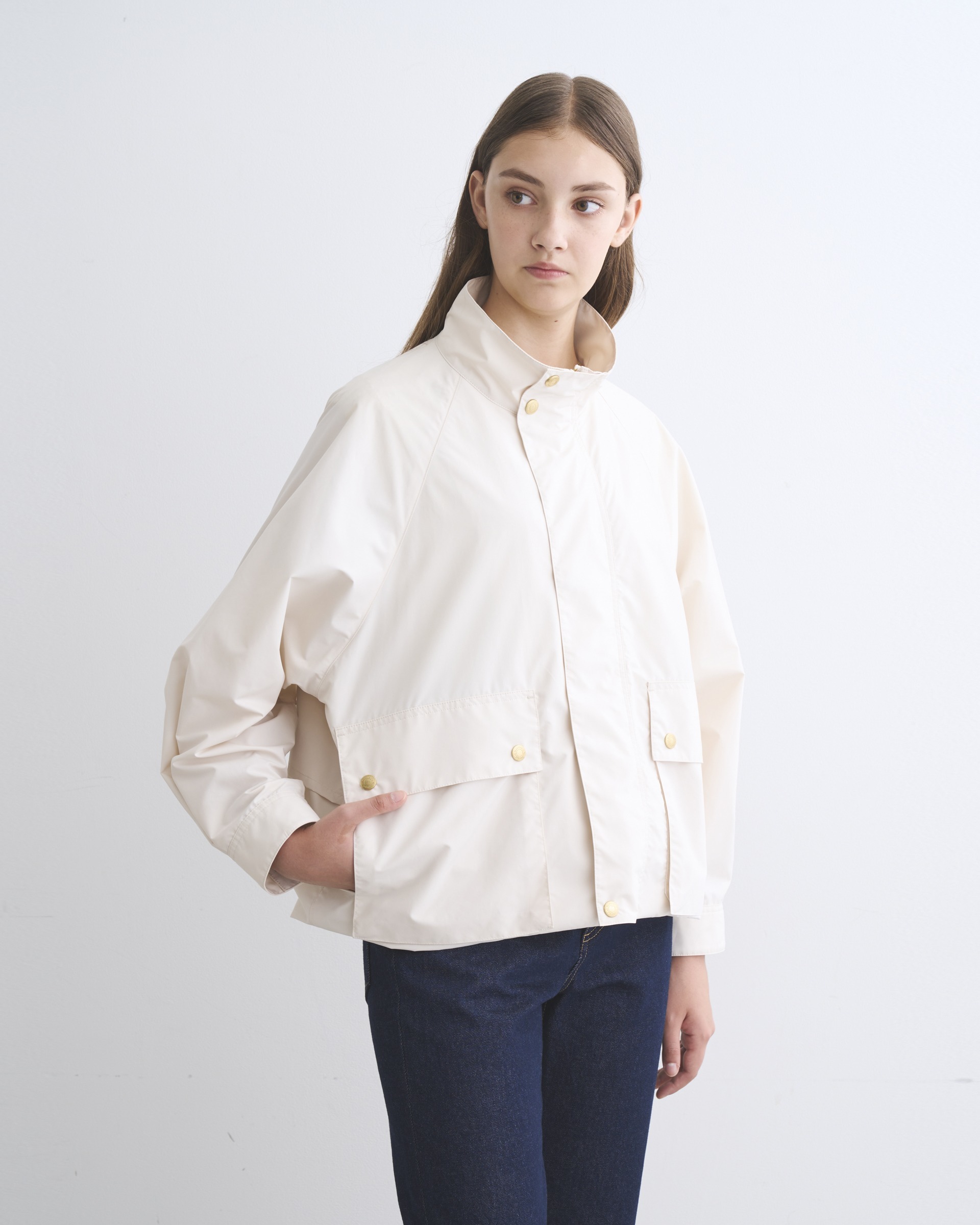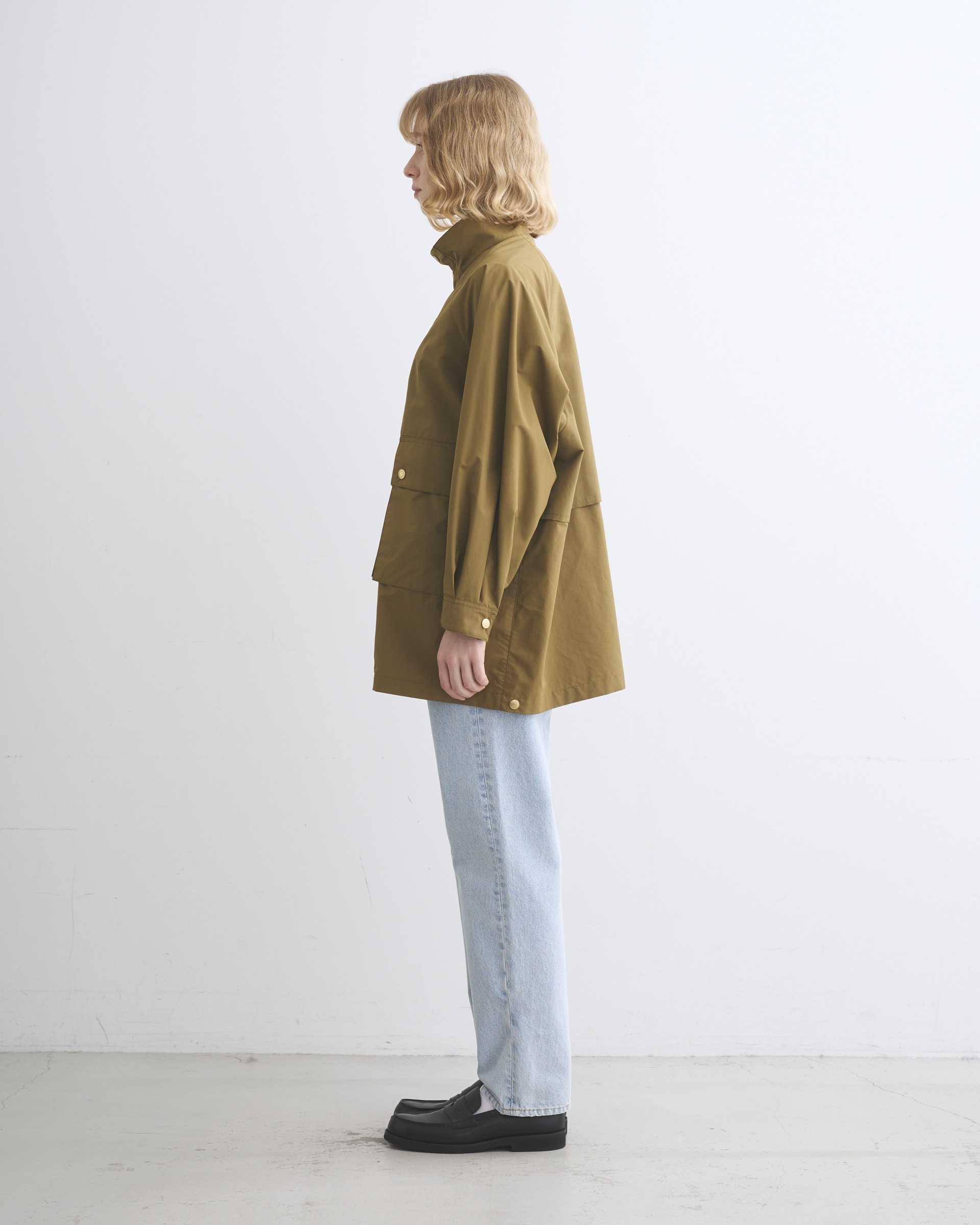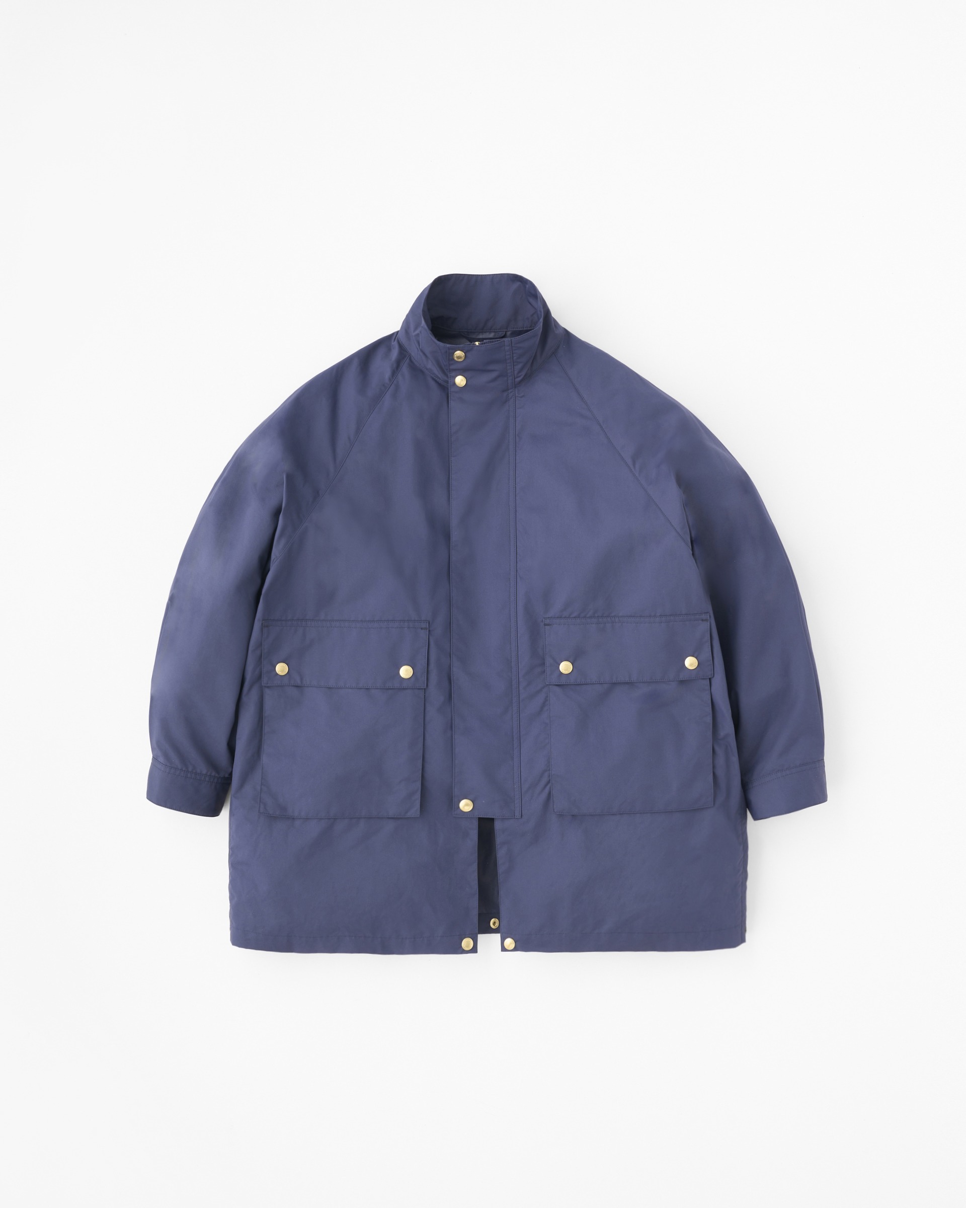こちらは英国伝統のフィールドジャケットの襟をスタンドカラーにしたモデルで、背中のアンブレラヨークが特長です。内側に折り返してスナップボタンを留めると着丈が17cm程短くなり、フィールドジャケットがショートブルゾンに早変わり。折り返して短くなった裾の部分がふんわりとして柔らかな印象です。春夏シーズンのアウターウェアに欠かせない2大定番生地のひとつ、E生地はポリエステルをゆっくりと繊細に織り上げたもので、軽くてしなやかでフラットな表情のあるファブリックです。撥水性もあり、レインジャケットとしても活躍します。