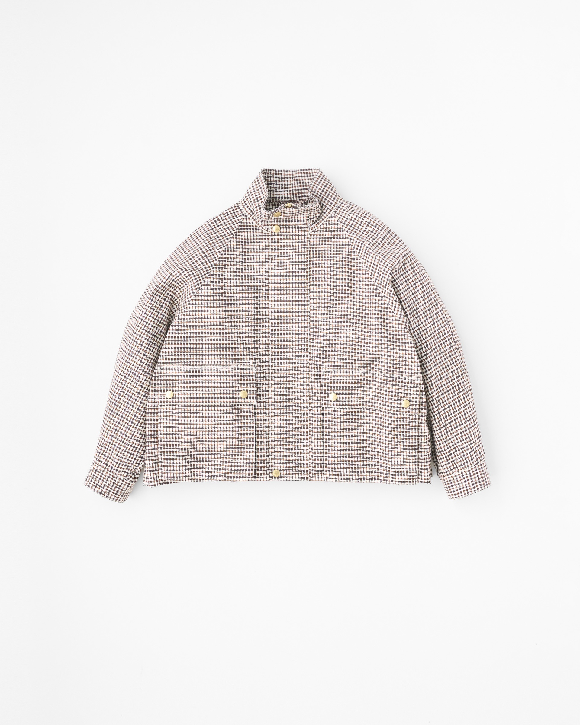 こちらはフィールドジャケットの襟をスタンドカラーにしたモデルで、背中のアンブレラヨークが特長です。内側に折り返してスナップボタンを留めると着丈が17cm程短くなり、フィールドジャケットがショートブルゾンに早変わり。折り返して短くなった裾の部分がふんわりとして柔らかな印象です。素材には上質な原料を丁寧に織り上げたハリのあるコットンツイルを使用しているので、立体的な美しいシルエットが際立ちます。ゴールドに輝くドットボタンが、きりりと全体の印象を引き締めます。