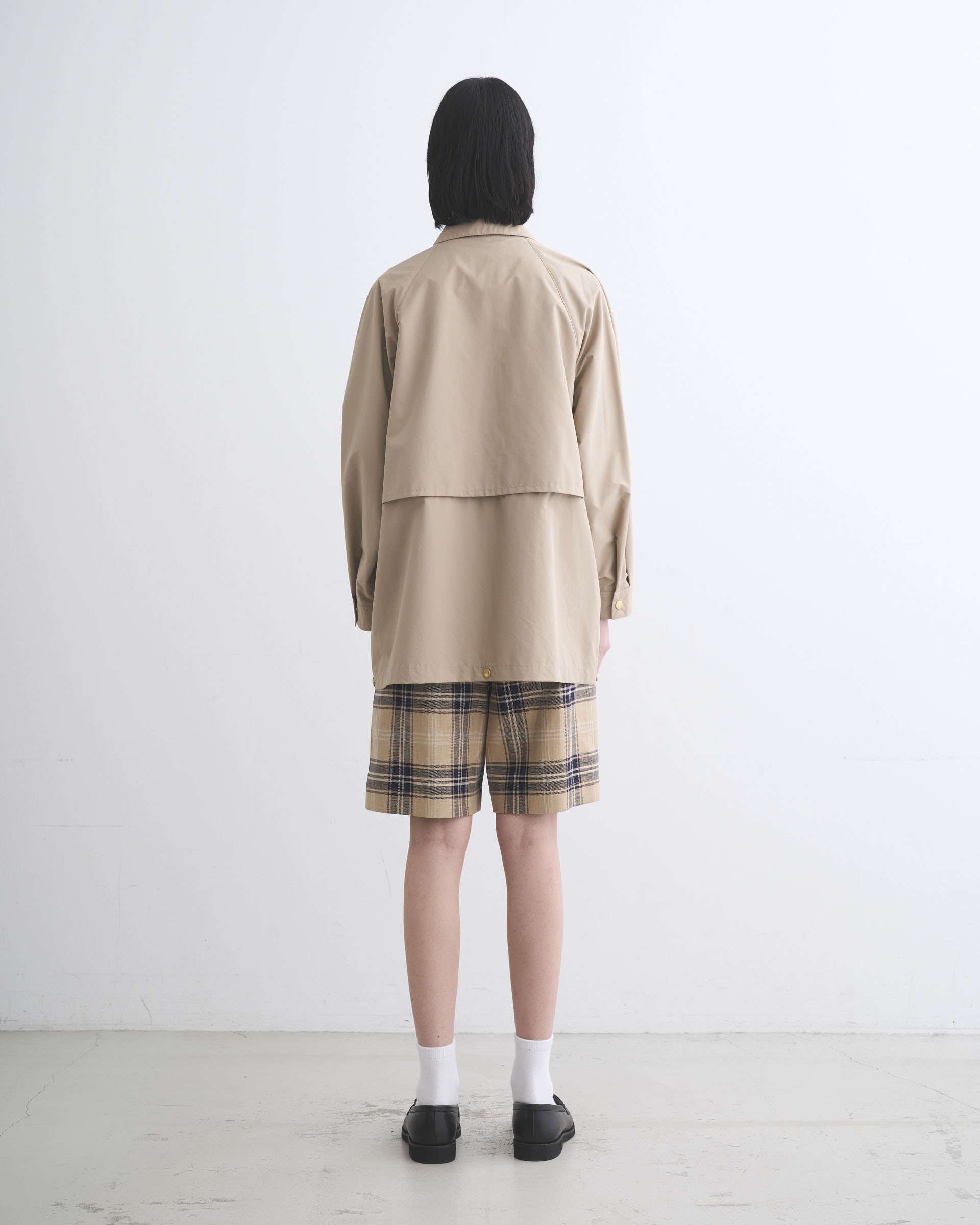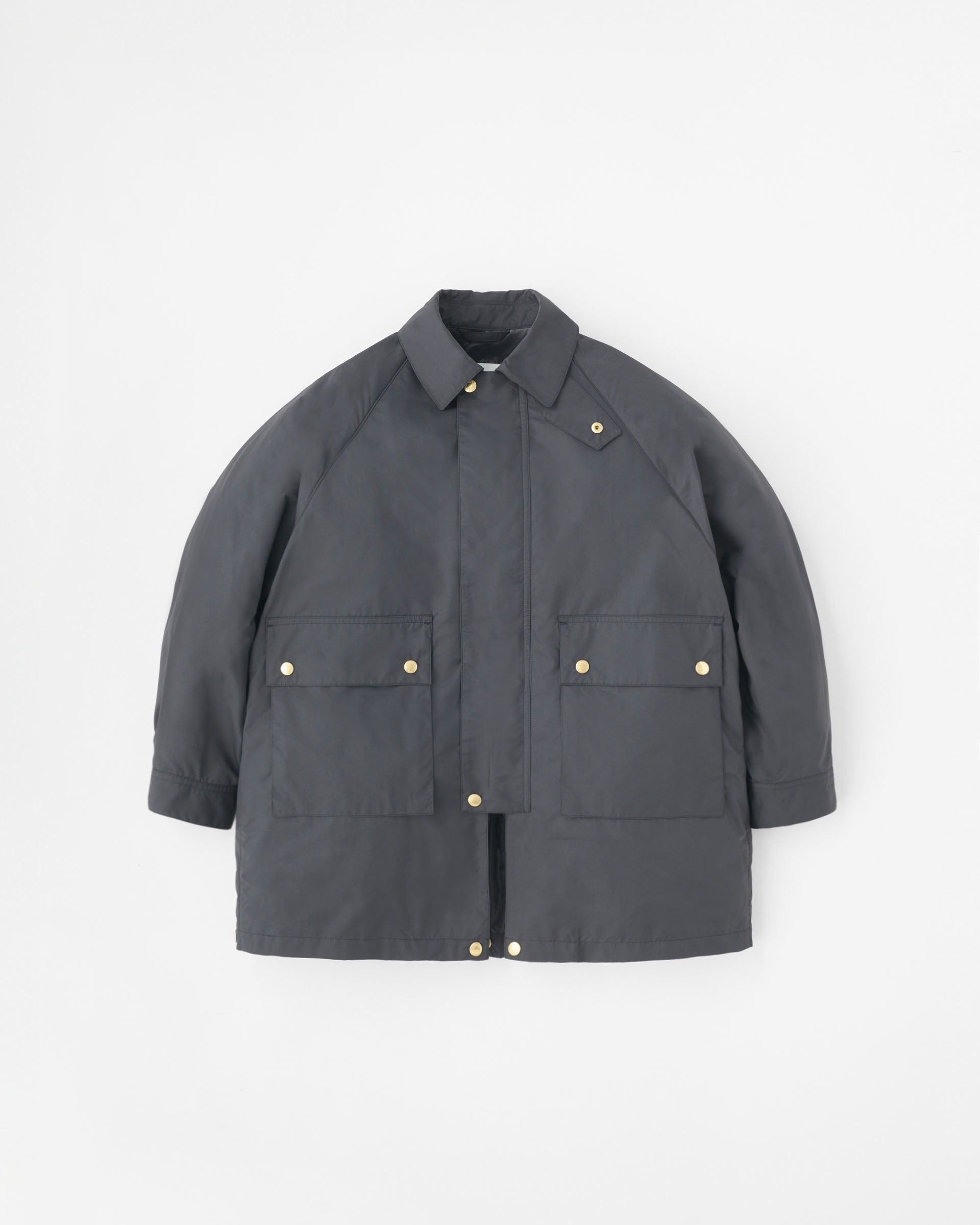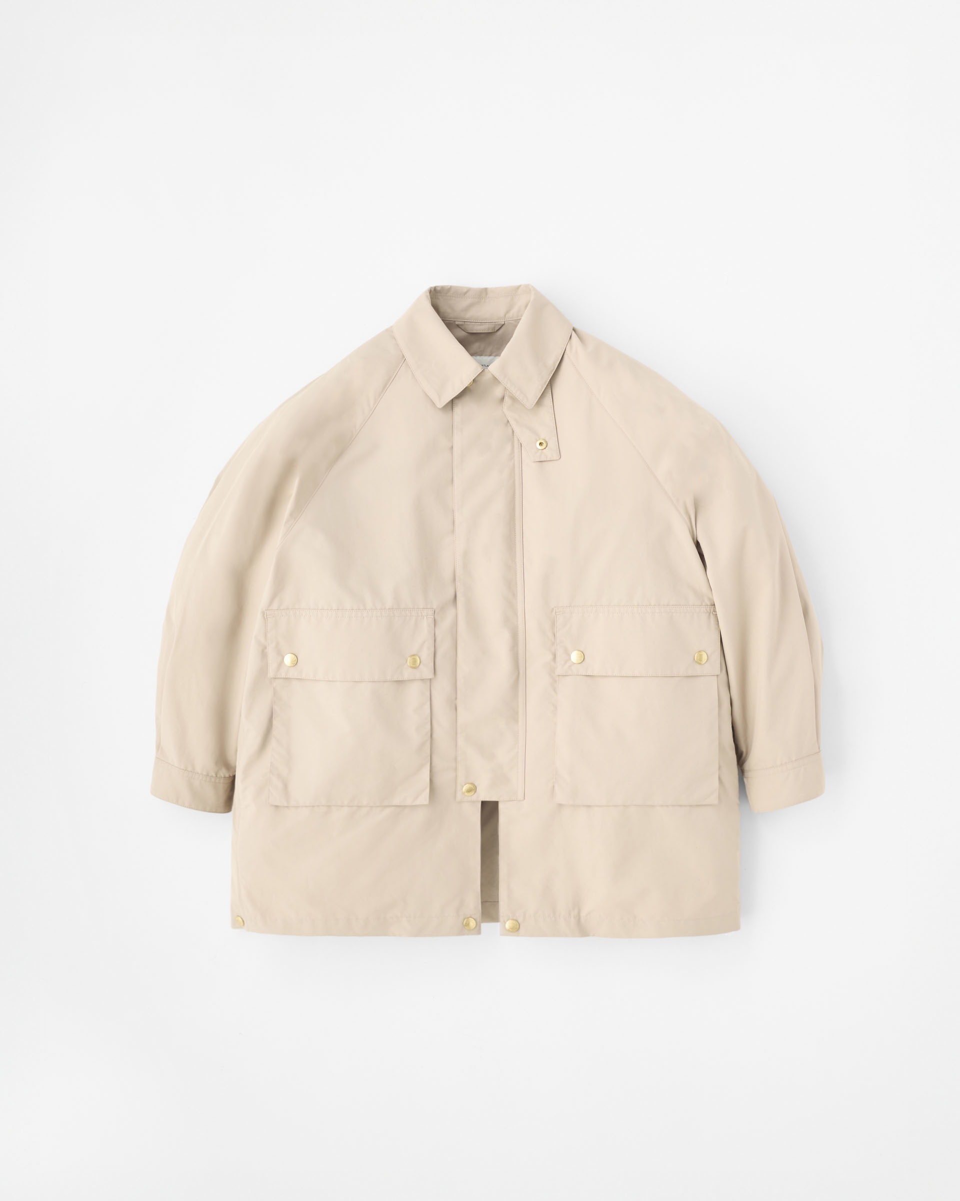 こちらの新モデルは、ボリュームのあるラグランスリーブと、背中のアンブレラヨークが特長のフィールドジャケットです。内側に折り返してスナップボタンを留めると着丈が17cm程短くなり、ショートブルゾンに早変わり。折り返して短くなった裾の部分がふんわりとして柔らかな印象です。春夏シーズンのアウターウェアに欠かせない2大定番生地のひとつ、E生地はポリエステルをゆっくりと繊細に織り上げたもので、軽くてしなやかでフラットな表情のあるファブリックです。撥水性もあり、レインジャケットとしても活躍します。