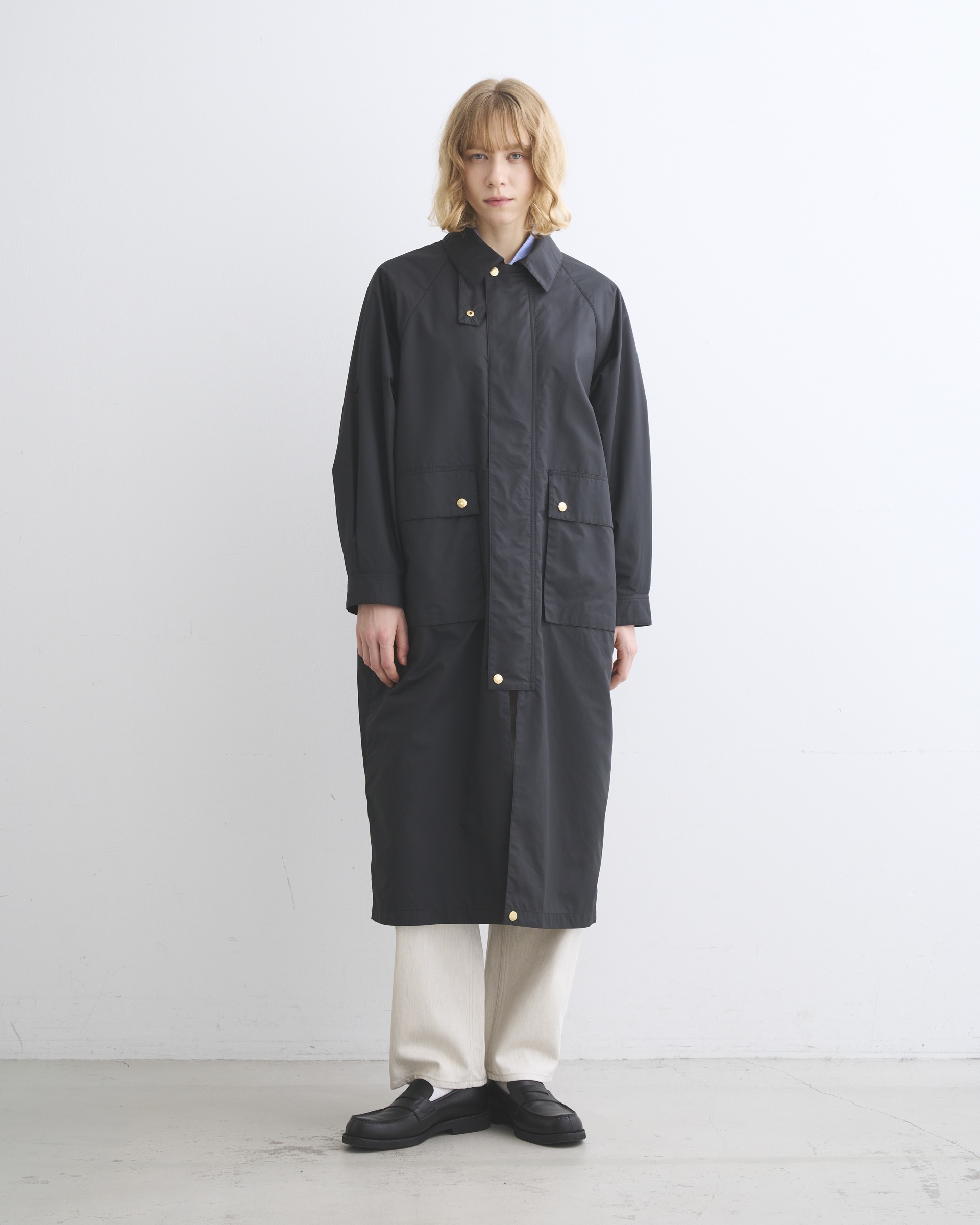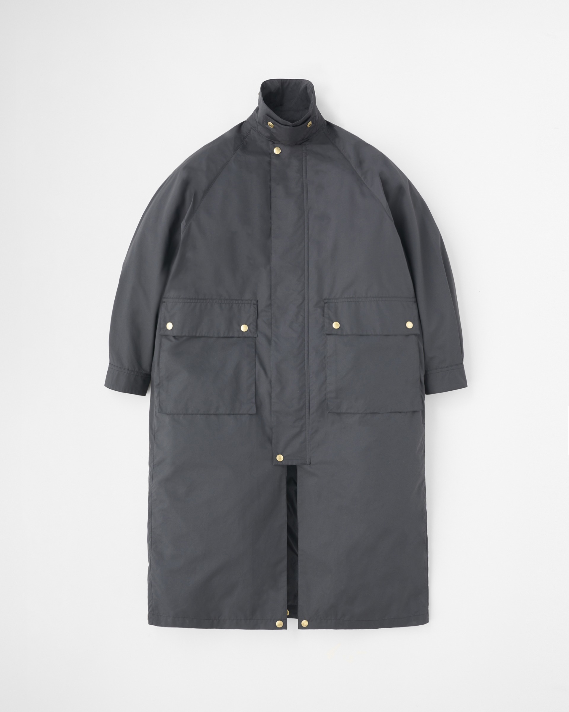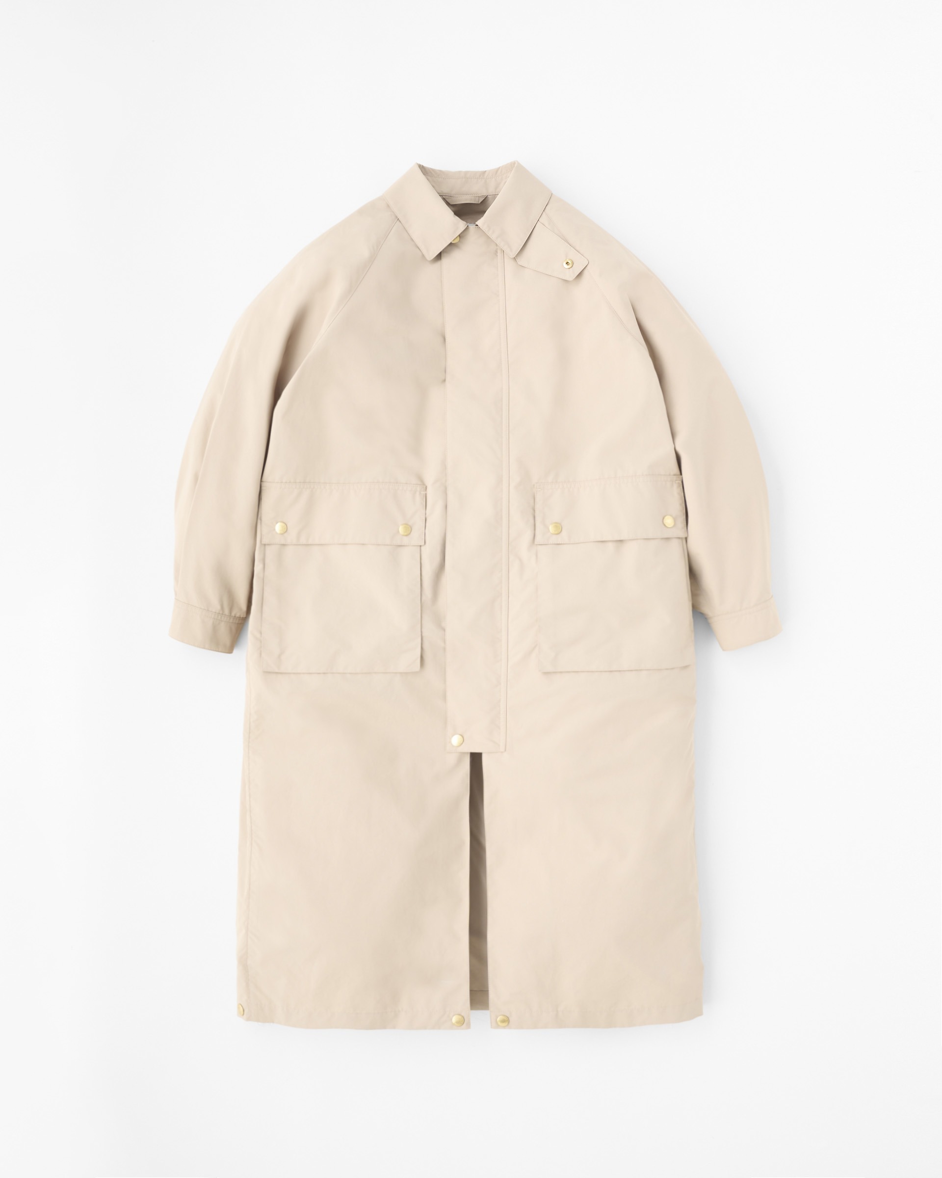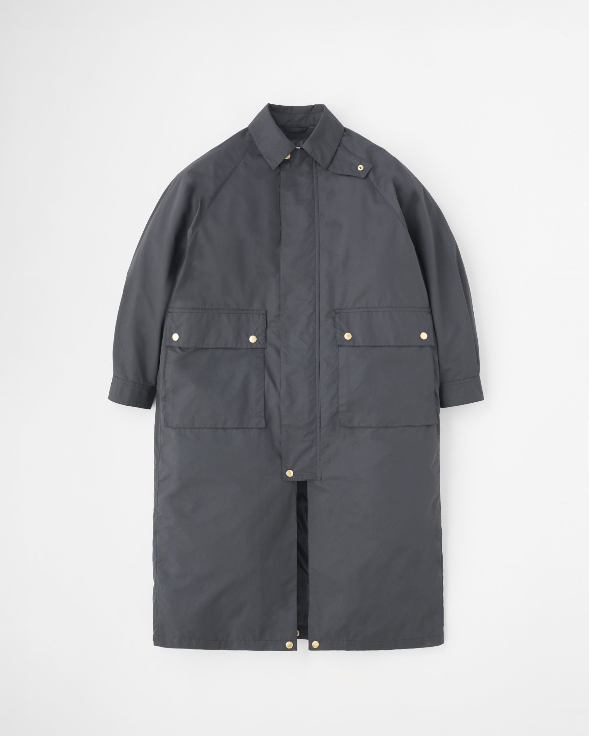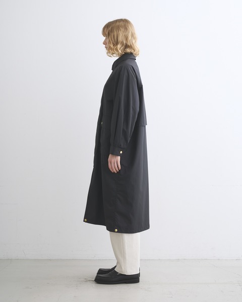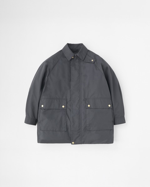 こちらの新モデルは、ボリュームのあるラグランスリーブと、背中のアンブレラヨークが特長のフィールドコートです。内側に折り返してスナップボタンを留めると着丈が37cm程短くなり、フィールドジャケットに早変わり。折り返して短くなった裾の部分がふんわりとして柔らかな印象です。春夏シーズンのアウターウェアに欠かせない2大定番生地のひとつ、E生地はポリエステルをゆっくりと繊細に織り上げたもので、軽くてしなやかでフラットな表情のあるファブリックです。撥水性もあり、レインコートとしても活躍します。