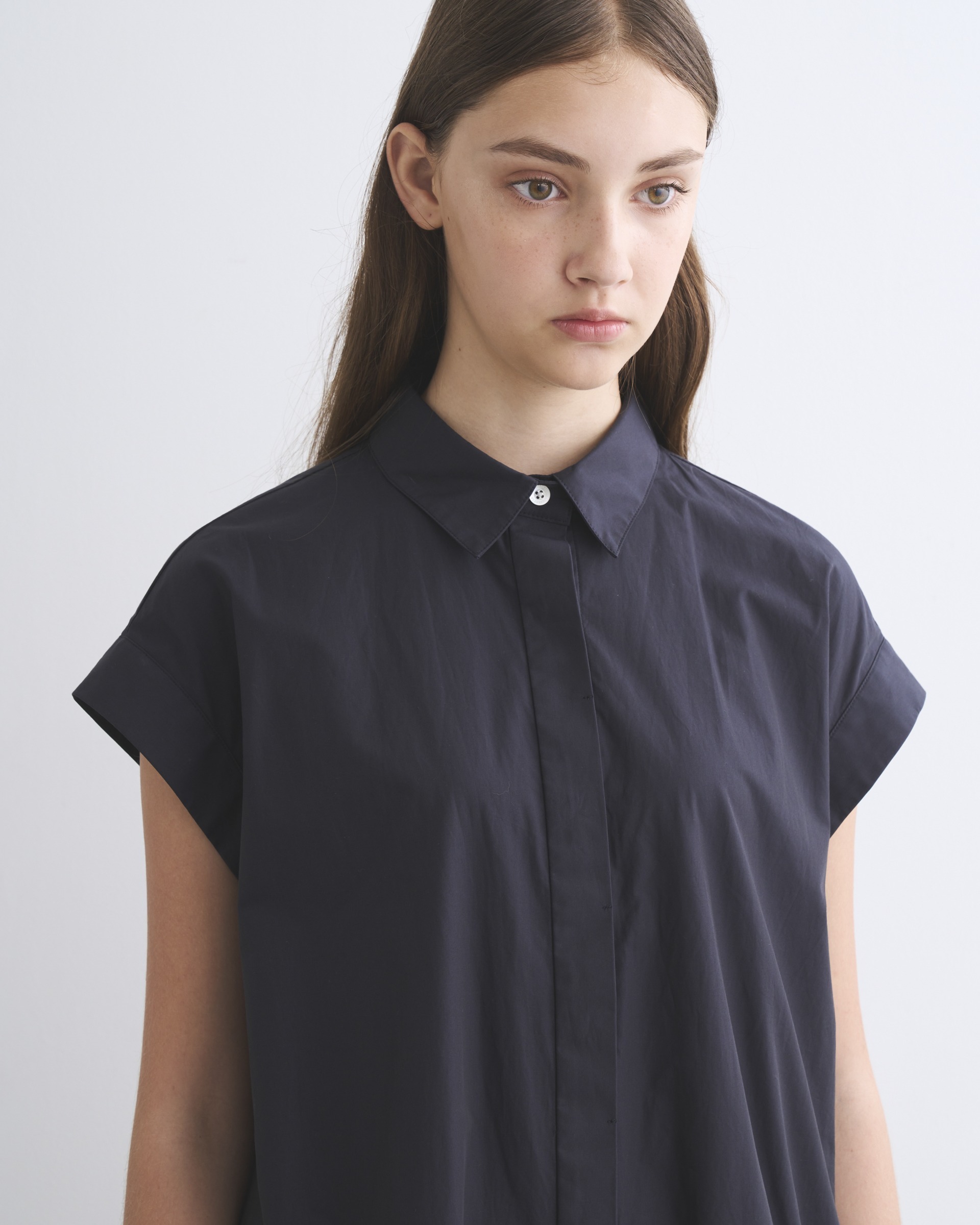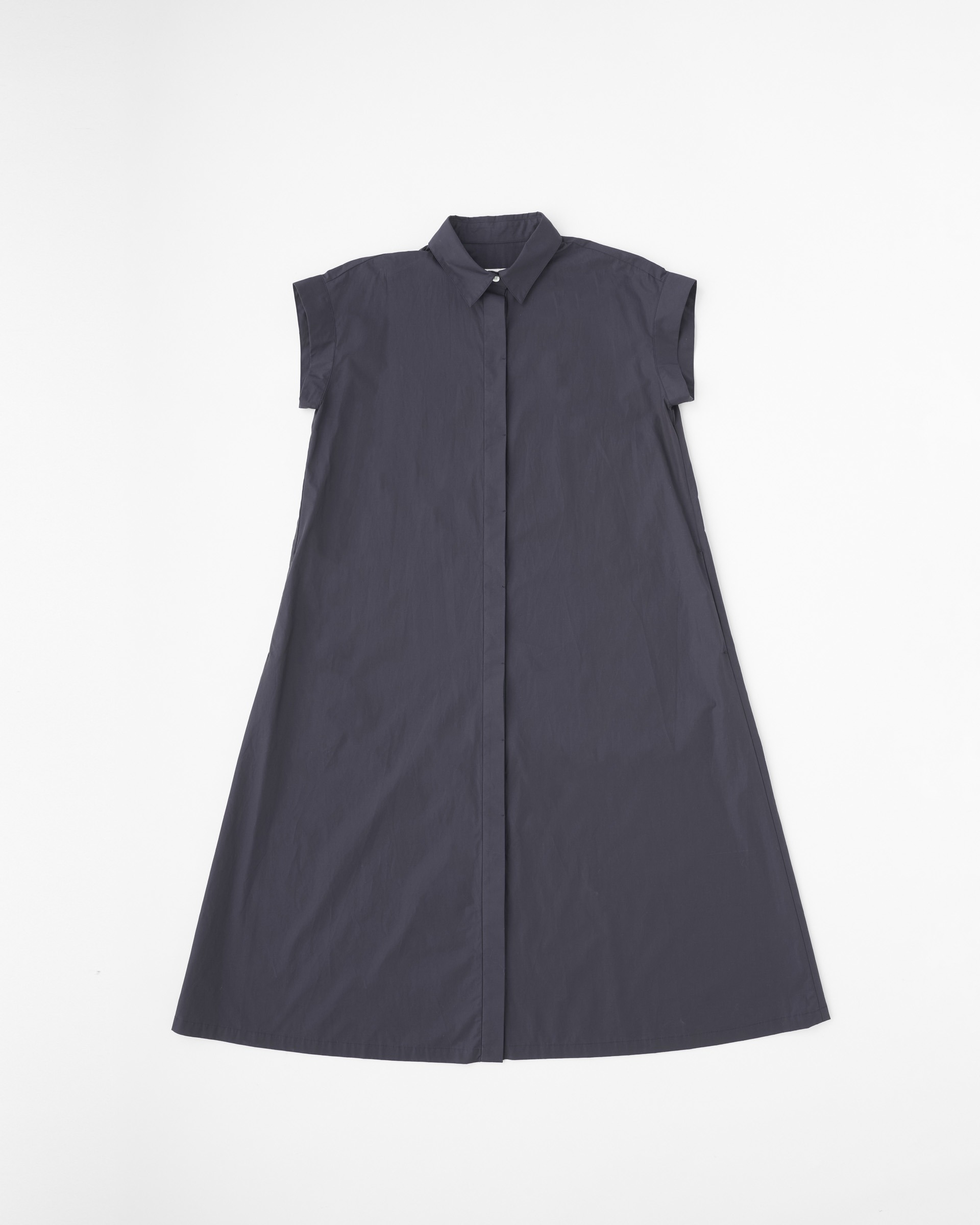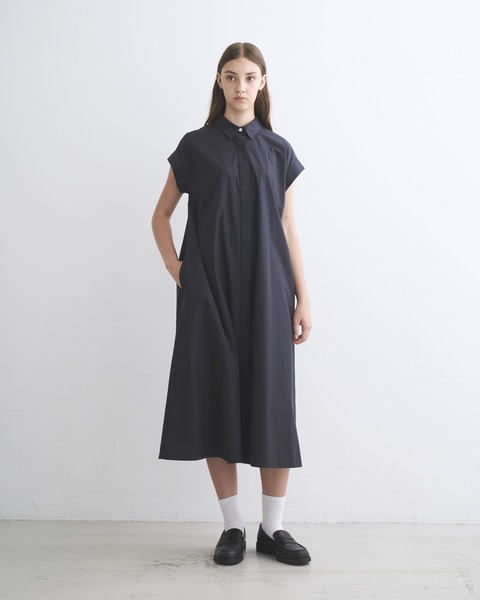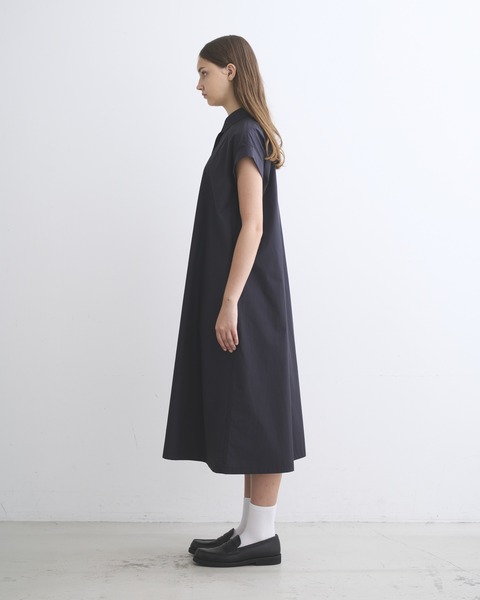 こちらのラスキントンは、すっきりとした肩回りと、ゆったりとした身幅が作り出すリラックスした雰囲気が魅力のワンピースです。小さな襟と比翼仕立てのフロント仕様がエレガントな印象に。上質なコットンの糸を高密度に織り上げたハリのあるタイプライター素材を使用しているので、立体的な美しいシルエットが際立ちます。