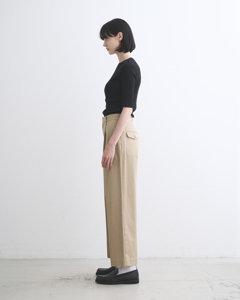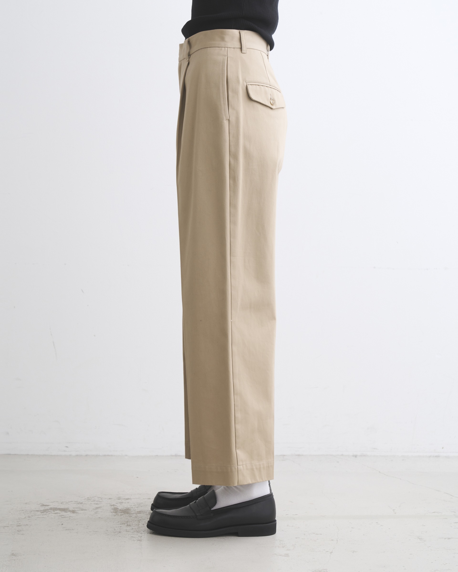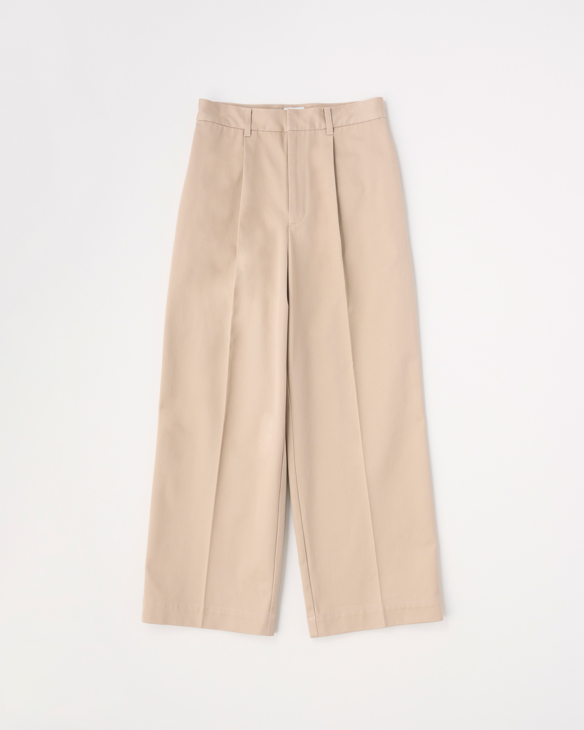 ストンと落ちるストレートシルエットが特長で、ヒップ下から裾にかけてまっすぐなラインがコンテンポラリーな印象を与えます。ジャケットスタイルからカジュアルまであらゆるスタイルにフィットする、履く人を選ばない万能パンツです。フロントボタンが表に出ない仕様なので、ベルトレスで着用した際のキマりが抜群。高密度に織られたハイカウントチノ素材を使用しているので光沢感があり、クリーンな一着です。