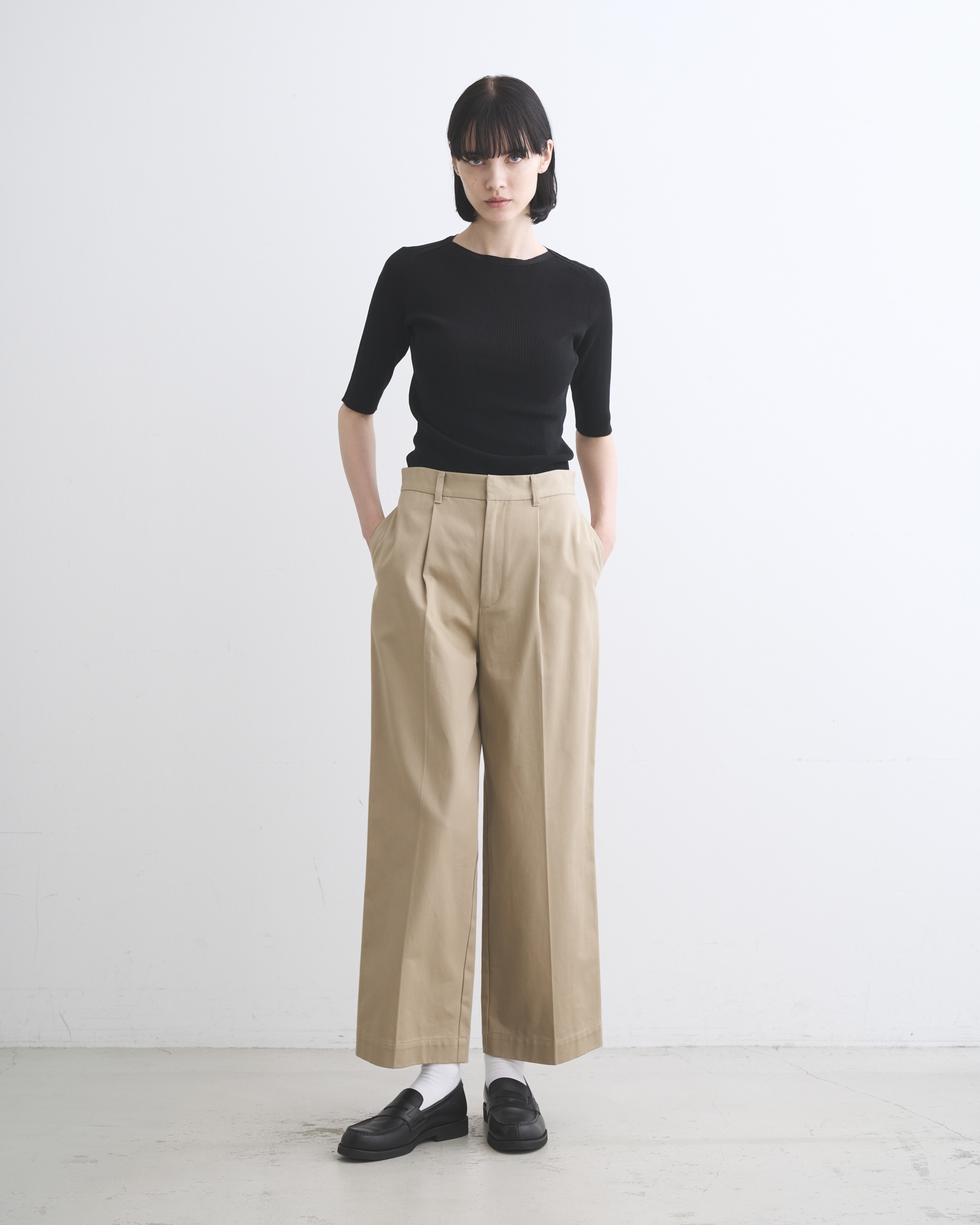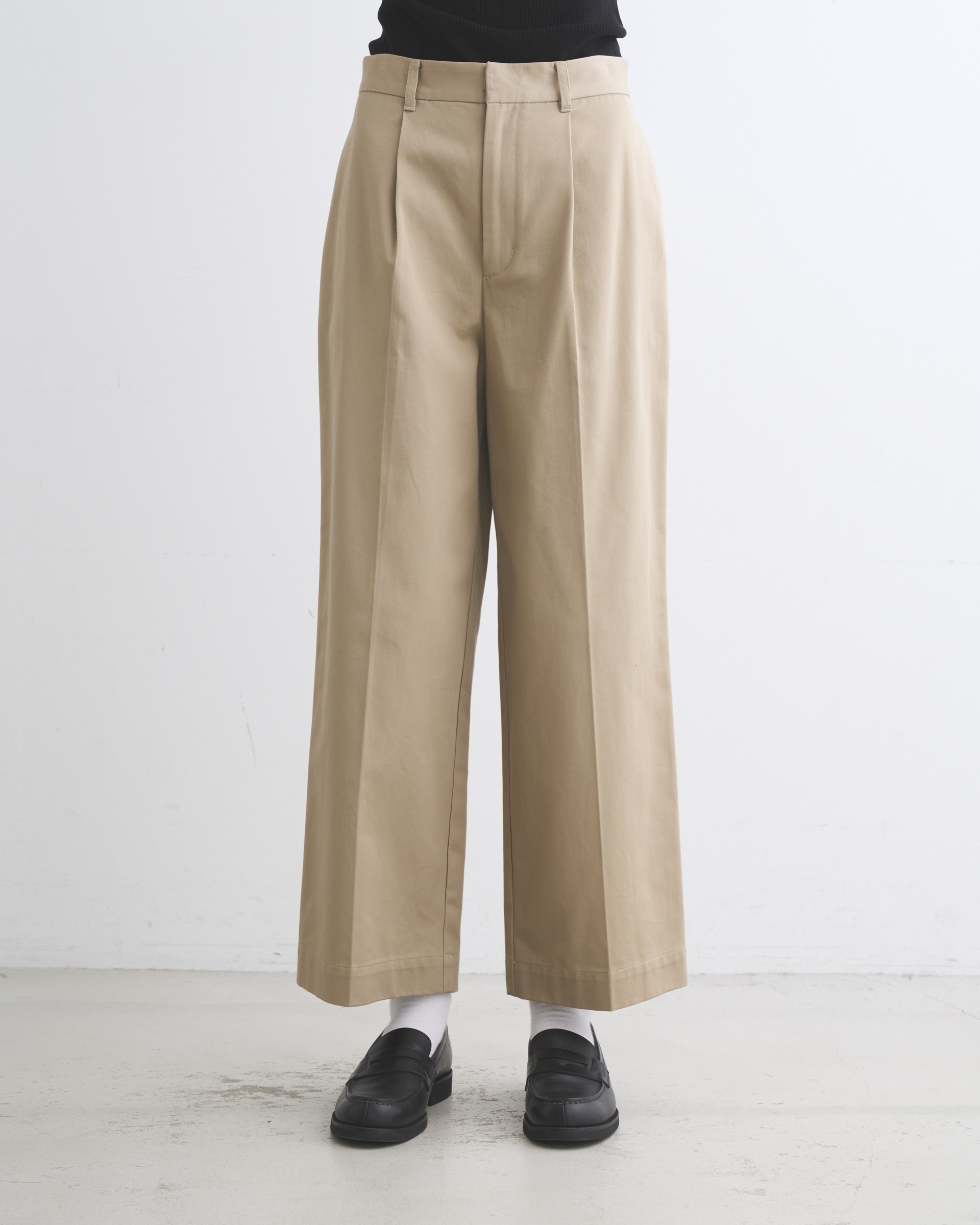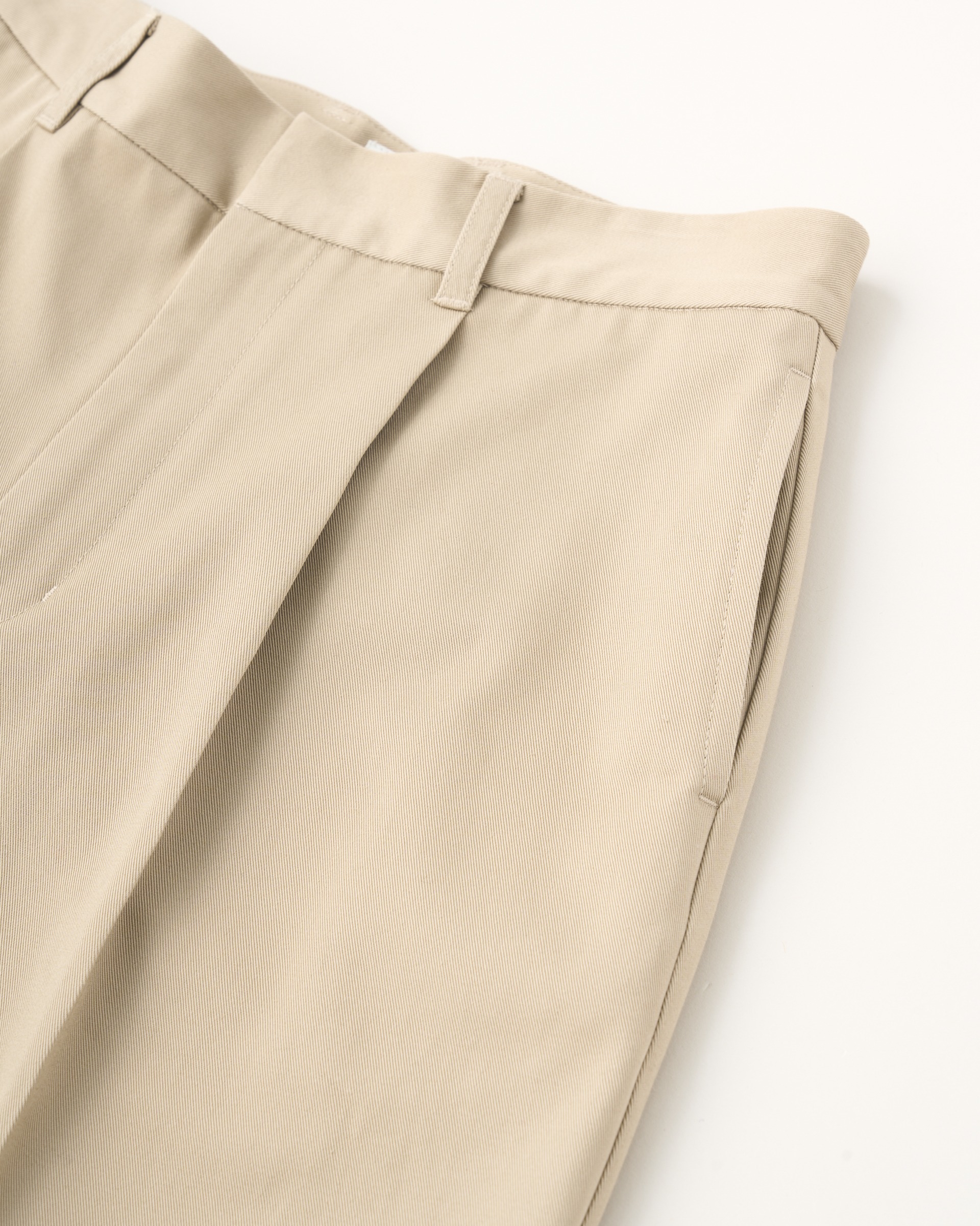 ストンと落ちるストレートシルエットが特長で、ヒップ下から裾にかけてまっすぐなラインがコンテンポラリーな印象を与えます。ジャケットスタイルからカジュアルまであらゆるスタイルにフィットする、履く人を選ばない万能パンツです。フロントボタンが表に出ない仕様なので、ベルトレスで着用した際のキマりが抜群。高密度に織られたハイカウントチノ素材を使用しているので光沢感があり、クリーンな一着です。