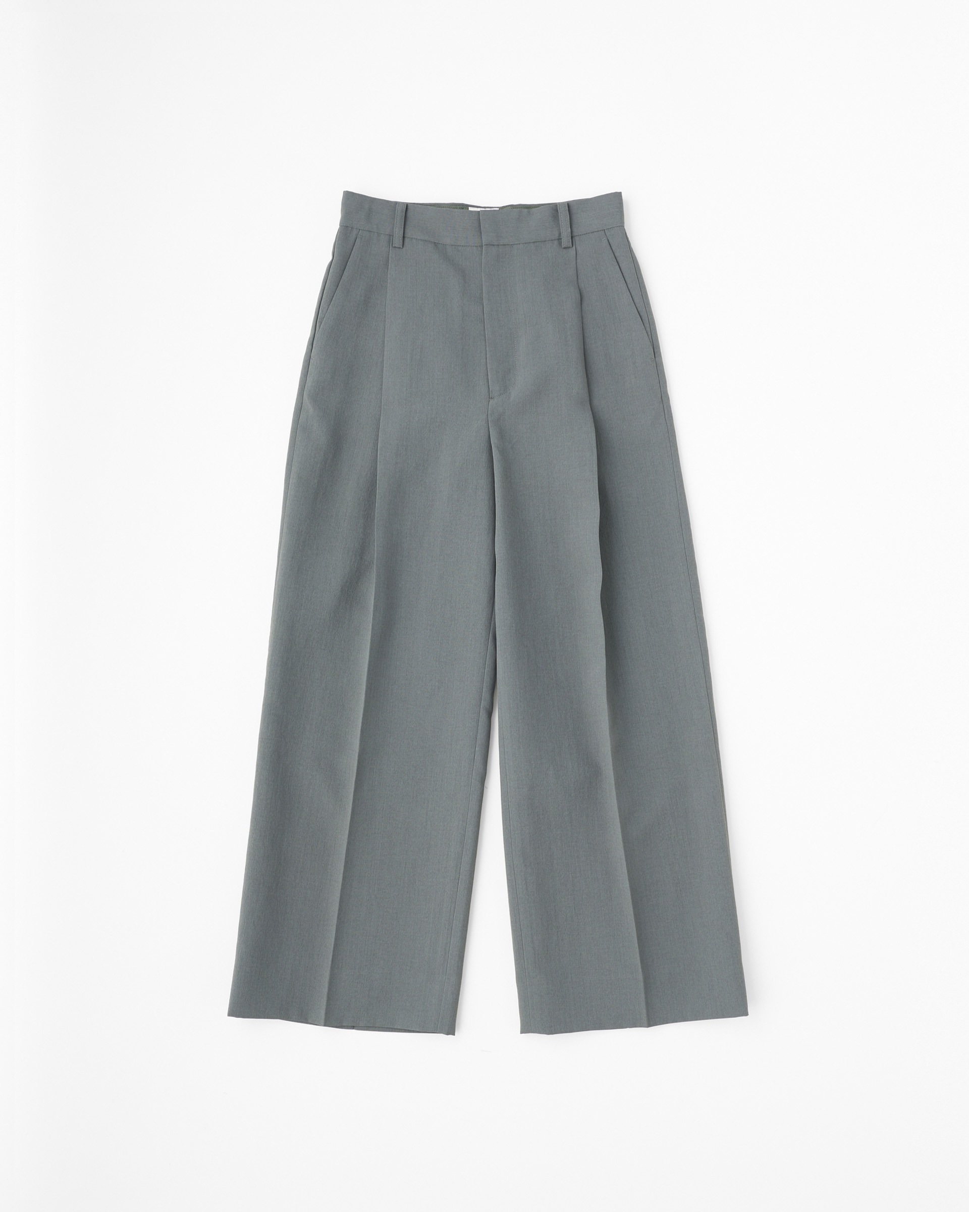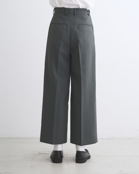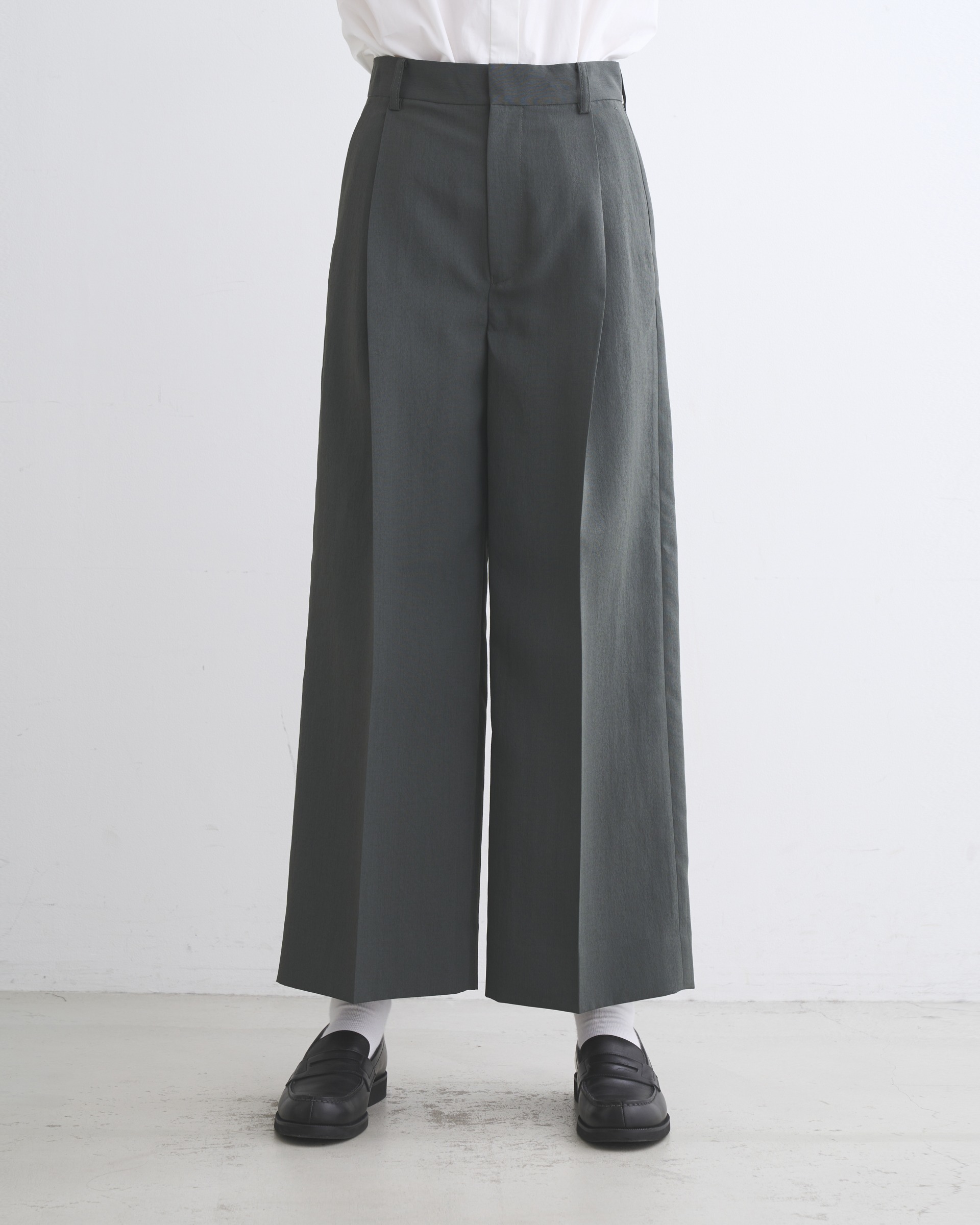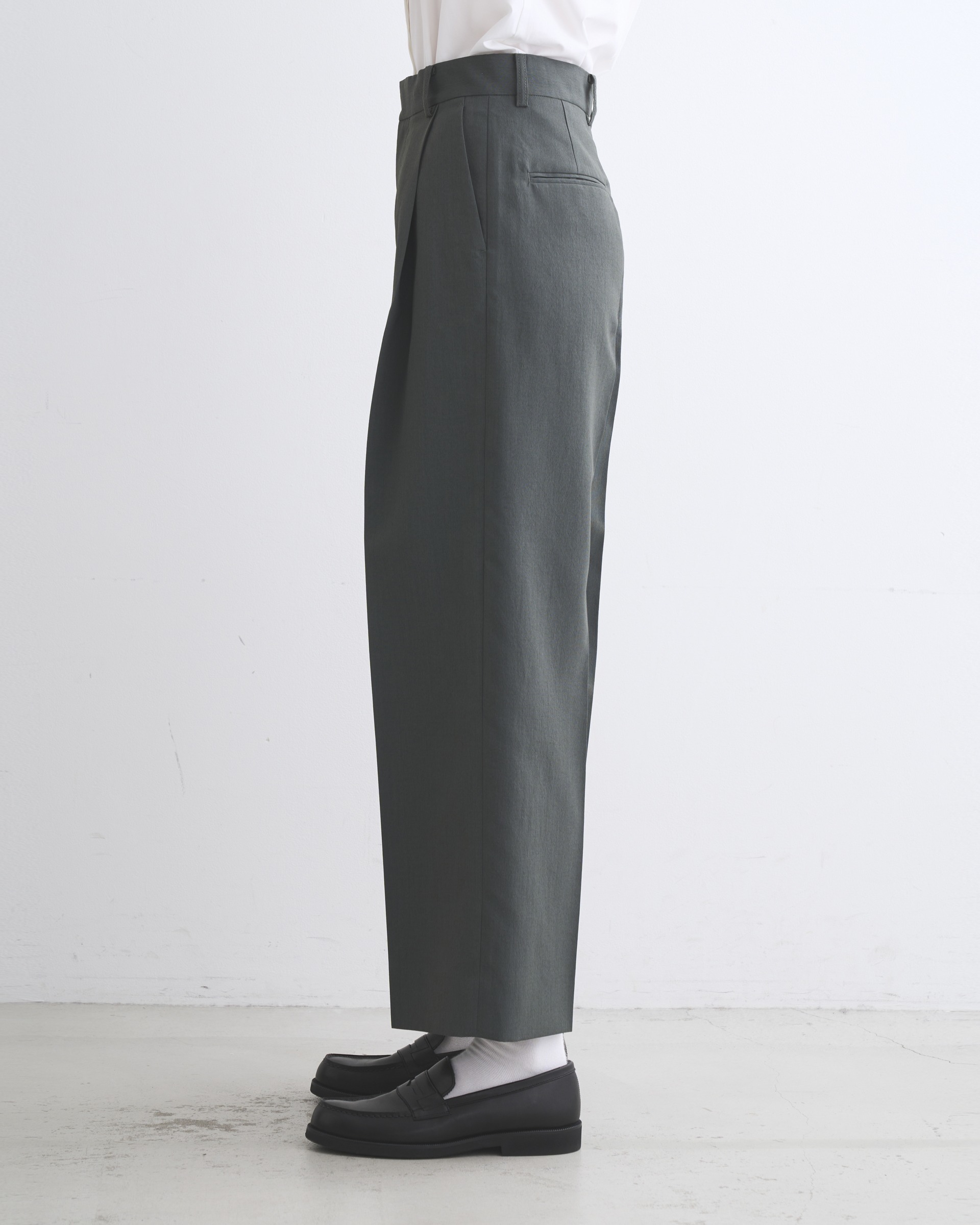 こちらのユニオンスラック 308は、ワイドシルエットに深めのタックが入ったパンツで、横から見ると存在感のある太さですが、正面からはすっきりとした見た目になるように計算されています。中が空洞のポリエステルの糸(中空糸)で丁寧に織られたPY素材製なので、きめ細やかで少し光沢のあるリュクスなムードがあって、さらさらした手触りで驚くほどの軽さが魅力です。