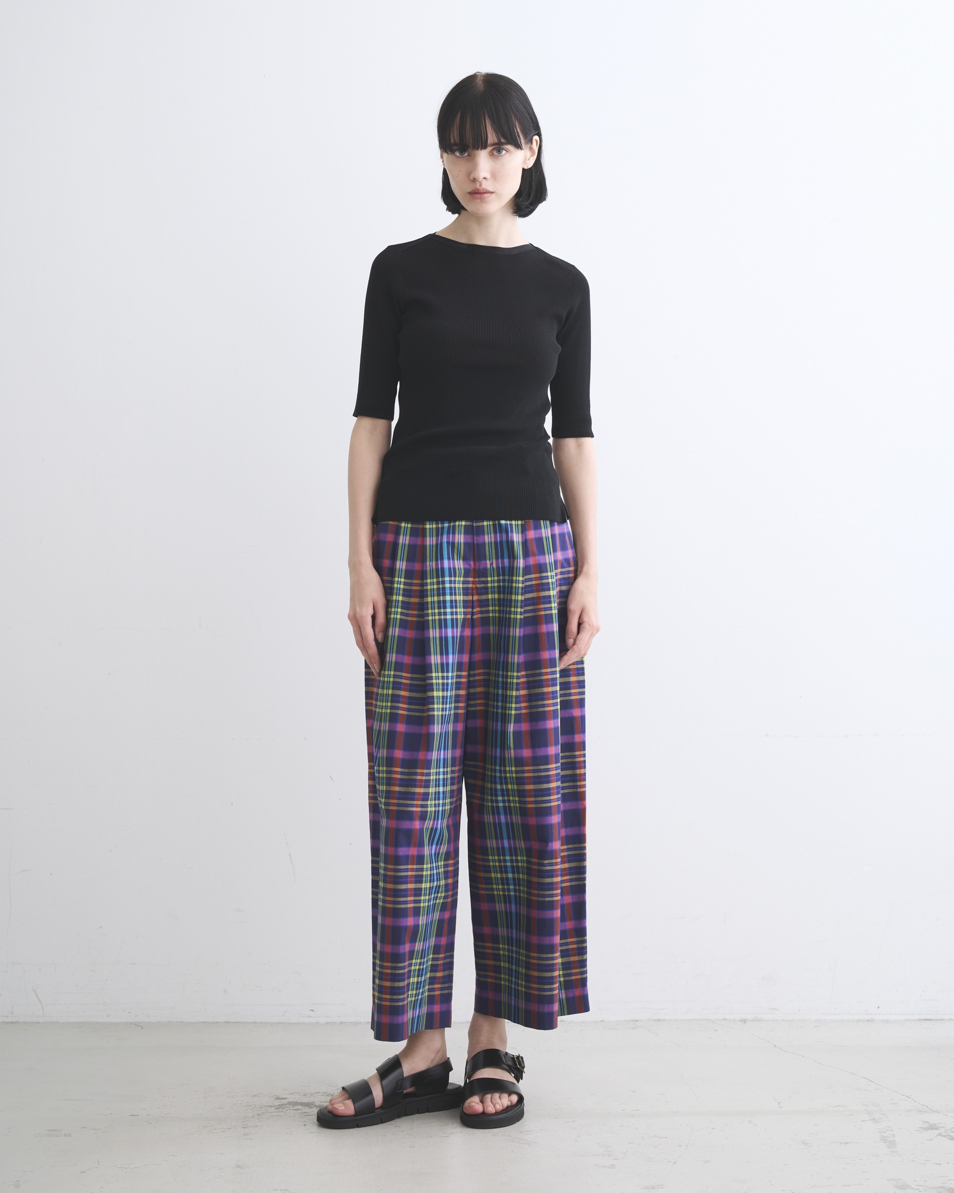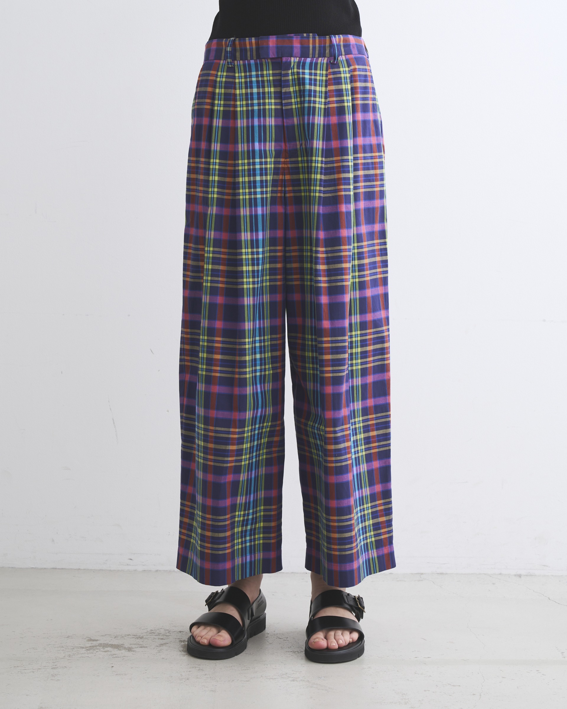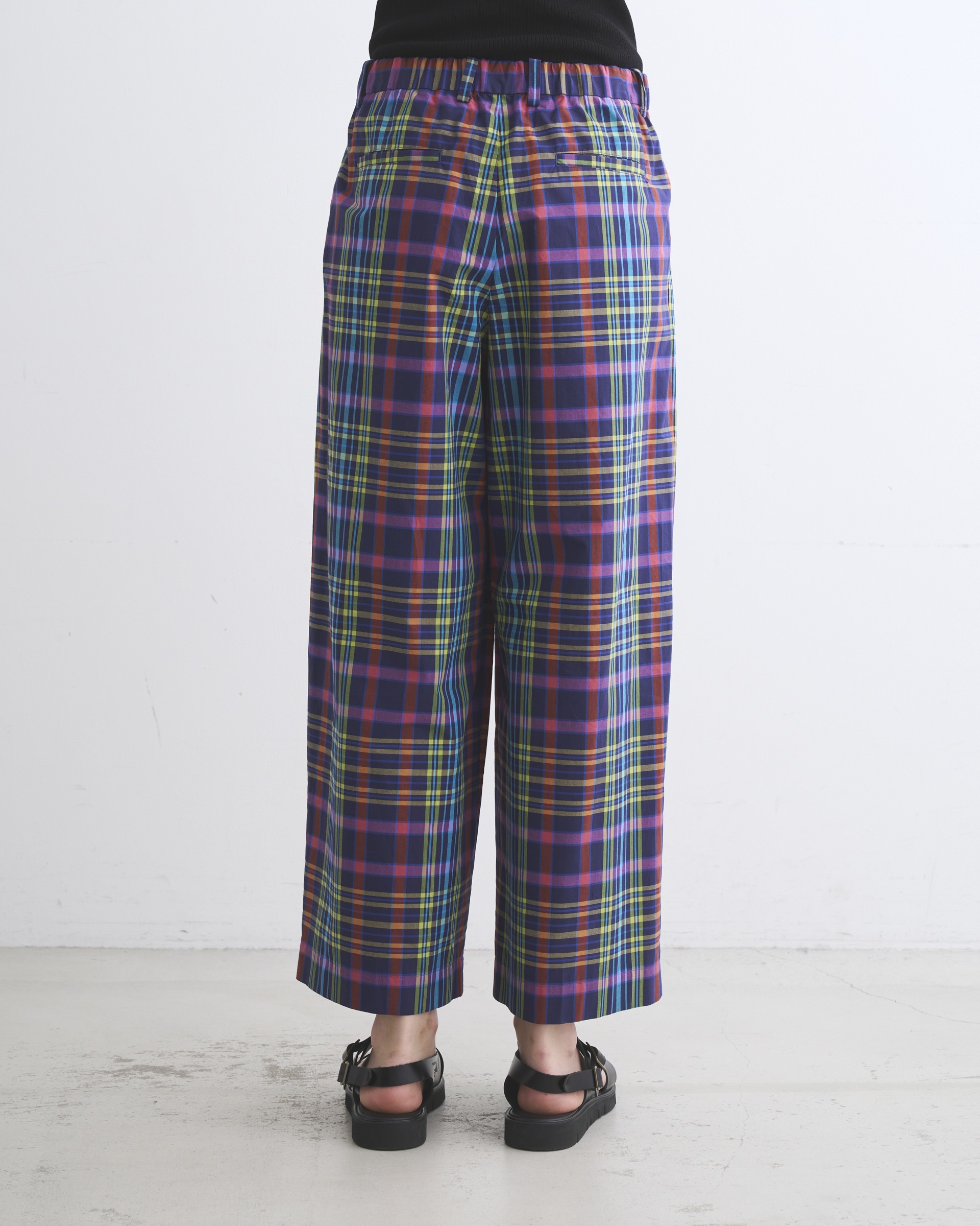 8色のカラフルな糸を用いた存在感のあるチェックが夏らしいワイドパンツ、リュイシャム。